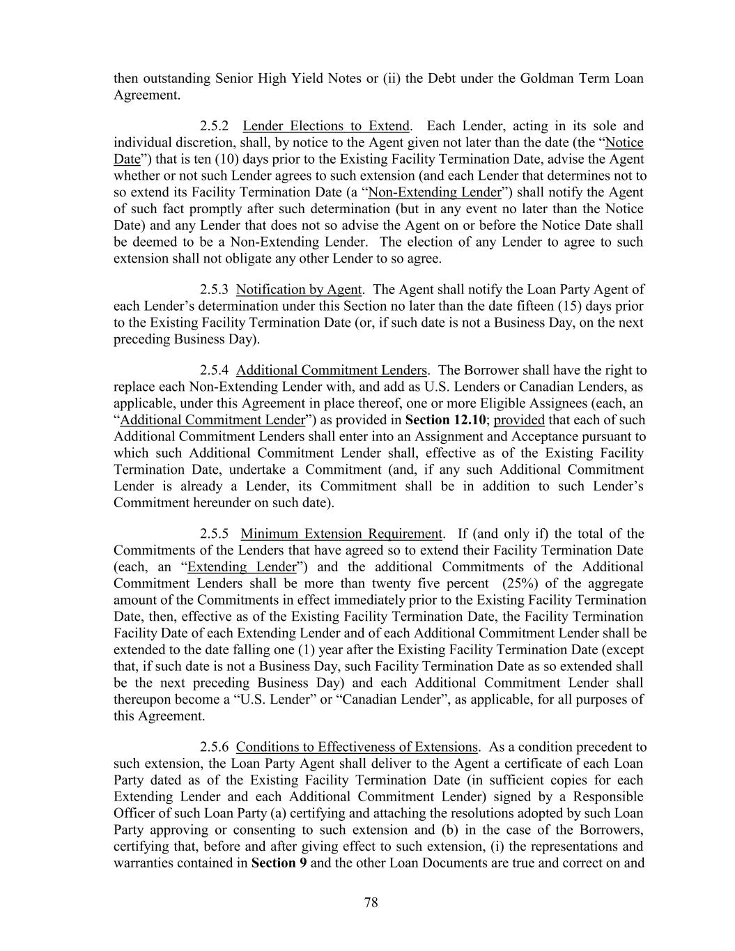 then outstanding Senior High Yield Notes or (ii) the Debt under the Goldman Term Loan Agreement. 2.5.2 Lender Elections to Extend. Each Lender, acting in its sole and individual discretion, shall, by notice to the Agent given not later than the date (the “Notice Date”) that is ten (10) days prior to the Existing Facility Termination Date, advise the Agent whether or not such Lender agrees to such extension (and each Lender that determines not to so extend its Facility Termination Date (a “Non-Extending Lender”) shall notify the Agent of such fact promptly after such determination (but in any event no later than the Notice Date) and any Lender that does not so advise the Agent on or before the Notice Date shall be deemed to be a Non-Extending Lender. The election of any Lender to agree to such extension shall not obligate any other Lender to so agree. 2.5.3 Notification by Agent. The Agent shall notify the Loan Party Agent of each Lender’s determination under this Section no later than the date fifteen (15) days prior to the Existing Facility Termination Date (or, if such date is not a Business Day, on the next preceding Business Day). 2.5.4 Additional Commitment Lenders. The Borrower shall have the right to replace each Non-Extending Lender with, and add as U.S. Lenders or Canadian Lenders, as applicable, under this Agreement in place thereof, one or more Eligible Assignees (each, an “Additional Commitment Lender”) as provided in Section 12.10; provided that each of such Additional Commitment Lenders shall enter into an Assignment and Acceptance pursuant to which such Additional Commitment Lender shall, effective as of the Existing Facility Termination Date, undertake a Commitment (and, if any such Additional Commitment Lender is already a Lender, its Commitment shall be in addition to such Lender’s Commitment hereunder on such date). 2.5.5 Minimum Extension Requirement. If (and only if) the total of the Commitments of the Lenders that have agreed so to extend their Facility Termination Date (each, an “Extending Lender”) and the additional Commitments of the Additional Commitment Lenders shall be more than twenty five percent (25%) of the aggregate amount of the Commitments in effect immediately prior to the Existing Facility Termination Date, then, effective as of the Existing Facility Termination Date, the Facility Termination Facility Date of each Extending Lender and of each Additional Commitment Lender shall be extended to the date falling one (1) year after the Existing Facility Termination Date (except that, if such date is not a Business Day, such Facility Termination Date as so extended shall be the next preceding Business Day) and each Additional Commitment Lender shall thereupon become a “U.S. Lender” or “Canadian Lender”, as applicable, for all purposes of this Agreement. 2.5.6 Conditions to Effectiveness of Extensions. As a condition precedent to such extension, the Loan Party Agent shall deliver to the Agent a certificate of each Loan Party dated as of the Existing Facility Termination Date (in sufficient copies for each Extending Lender and each Additional Commitment Lender) signed by a Responsible Officer of such Loan Party (a) certifying and attaching the resolutions adopted by such Loan Party approving or consenting to such extension and (b) in the case of the Borrowers, certifying that, before and after giving effect to such extension, (i) the representations and warranties contained in Section 9 and the other Loan Documents are true and correct on and 78