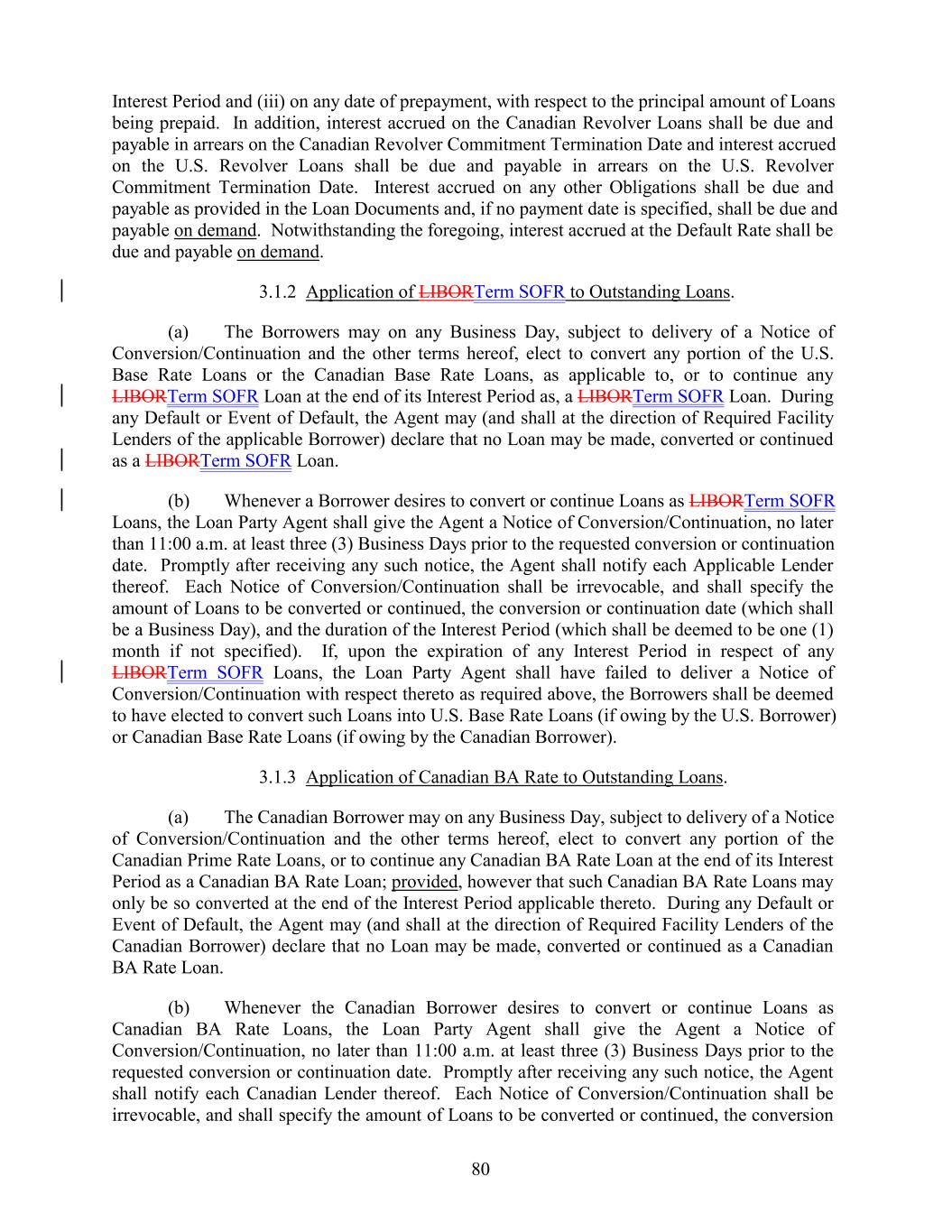 Interest Period and (iii) on any date of prepayment, with respect to the principal amount of Loans being prepaid. In addition, interest accrued on the Canadian Revolver Loans shall be due and payable in arrears on the Canadian Revolver Commitment Termination Date and interest accrued on the U.S. Revolver Loans shall be due and payable in arrears on the U.S. Revolver Commitment Termination Date. Interest accrued on any other Obligations shall be due and payable as provided in the Loan Documents and, if no payment date is specified, shall be due and payable on demand. Notwithstanding the foregoing, interest accrued at the Default Rate shall be due and payable on demand. 3.1.2 Application of LIBORTerm SOFR to Outstanding Loans. (a) The Borrowers may on any Business Day, subject to delivery of a Notice of Conversion/Continuation and the other terms hereof, elect to convert any portion of the U.S. Base Rate Loans or the Canadian Base Rate Loans, as applicable to, or to continue any LIBORTerm SOFR Loan at the end of its Interest Period as, a LIBORTerm SOFR Loan. During any Default or Event of Default, the Agent may (and shall at the direction of Required Facility Lenders of the applicable Borrower) declare that no Loan may be made, converted or continued as a LIBORTerm SOFR Loan. (b) Whenever a Borrower desires to convert or continue Loans as LIBORTerm SOFR Loans, the Loan Party Agent shall give the Agent a Notice of Conversion/Continuation, no later than 11:00 a.m. at least three (3) Business Days prior to the requested conversion or continuation date. Promptly after receiving any such notice, the Agent shall notify each Applicable Lender thereof. Each Notice of Conversion/Continuation shall be irrevocable, and shall specify the amount of Loans to be converted or continued, the conversion or continuation date (which shall be a Business Day), and the duration of the Interest Period (which shall be deemed to be one (1) month if not specified). If, upon the expiration of any Interest Period in respect of any LIBORTerm SOFR Loans, the Loan Party Agent shall have failed to deliver a Notice of Conversion/Continuation with respect thereto as required above, the Borrowers shall be deemed to have elected to convert such Loans into U.S. Base Rate Loans (if owing by the U.S. Borrower) or Canadian Base Rate Loans (if owing by the Canadian Borrower). 3.1.3 Application of Canadian BA Rate to Outstanding Loans. (a) The Canadian Borrower may on any Business Day, subject to delivery of a Notice of Conversion/Continuation and the other terms hereof, elect to convert any portion of the Canadian Prime Rate Loans, or to continue any Canadian BA Rate Loan at the end of its Interest Period as a Canadian BA Rate Loan; provided, however that such Canadian BA Rate Loans may only be so converted at the end of the Interest Period applicable thereto. During any Default or Event of Default, the Agent may (and shall at the direction of Required Facility Lenders of the Canadian Borrower) declare that no Loan may be made, converted or continued as a Canadian BA Rate Loan. (b) Whenever the Canadian Borrower desires to convert or continue Loans as Canadian BA Rate Loans, the Loan Party Agent shall give the Agent a Notice of Conversion/Continuation, no later than 11:00 a.m. at least three (3) Business Days prior to the requested conversion or continuation date. Promptly after receiving any such notice, the Agent shall notify each Canadian Lender thereof. Each Notice of Conversion/Continuation shall be irrevocable, and shall specify the amount of Loans to be converted or continued, the conversion 80