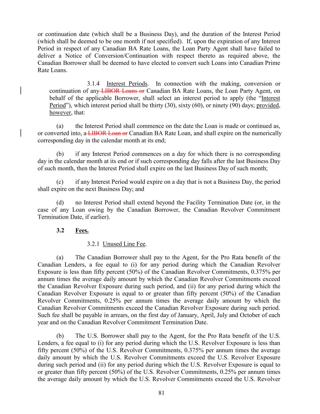 or continuation date (which shall be a Business Day), and the duration of the Interest Period (which shall be deemed to be one month if not specified). If, upon the expiration of any Interest Period in respect of any Canadian BA Rate Loans, the Loan Party Agent shall have failed to deliver a Notice of Conversion/Continuation with respect thereto as required above, the Canadian Borrower shall be deemed to have elected to convert such Loans into Canadian Prime Rate Loans. 3.1.4 Interest Periods. In connection with the making, conversion or continuation of any LIBOR Loans or Canadian BA Rate Loans, the Loan Party Agent, on behalf of the applicable Borrower, shall select an interest period to apply (the “Interest Period”), which interest period shall be thirty (30), sixty (60), or ninety (90) days; provided, however, that: (a) the Interest Period shall commence on the date the Loan is made or continued as, or converted into, a LIBOR Loan or Canadian BA Rate Loan, and shall expire on the numerically corresponding day in the calendar month at its end; (b) if any Interest Period commences on a day for which there is no corresponding day in the calendar month at its end or if such corresponding day falls after the last Business Day of such month, then the Interest Period shall expire on the last Business Day of such month; (c) if any Interest Period would expire on a day that is not a Business Day, the period shall expire on the next Business Day; and (d) no Interest Period shall extend beyond the Facility Termination Date (or, in the case of any Loan owing by the Canadian Borrower, the Canadian Revolver Commitment Termination Date, if earlier). 3.2 Fees. 3.2.1 Unused Line Fee. (a) The Canadian Borrower shall pay to the Agent, for the Pro Rata benefit of the Canadian Lenders, a fee equal to (i) for any period during which the Canadian Revolver Exposure is less than fifty percent (50%) of the Canadian Revolver Commitments, 0.375% per annum times the average daily amount by which the Canadian Revolver Commitments exceed the Canadian Revolver Exposure during such period, and (ii) for any period during which the Canadian Revolver Exposure is equal to or greater than fifty percent (50%) of the Canadian Revolver Commitments, 0.25% per annum times the average daily amount by which the Canadian Revolver Commitments exceed the Canadian Revolver Exposure during such period. Such fee shall be payable in arrears, on the first day of January, April, July and October of each year and on the Canadian Revolver Commitment Termination Date. (b) The U.S. Borrower shall pay to the Agent, for the Pro Rata benefit of the U.S. Lenders, a fee equal to (i) for any period during which the U.S. Revolver Exposure is less than fifty percent (50%) of the U.S. Revolver Commitments, 0.375% per annum times the average daily amount by which the U.S. Revolver Commitments exceed the U.S. Revolver Exposure during such period and (ii) for any period during which the U.S. Revolver Exposure is equal to or greater than fifty percent (50%) of the U.S. Revolver Commitments, 0.25% per annum times the average daily amount by which the U.S. Revolver Commitments exceed the U.S. Revolver 81