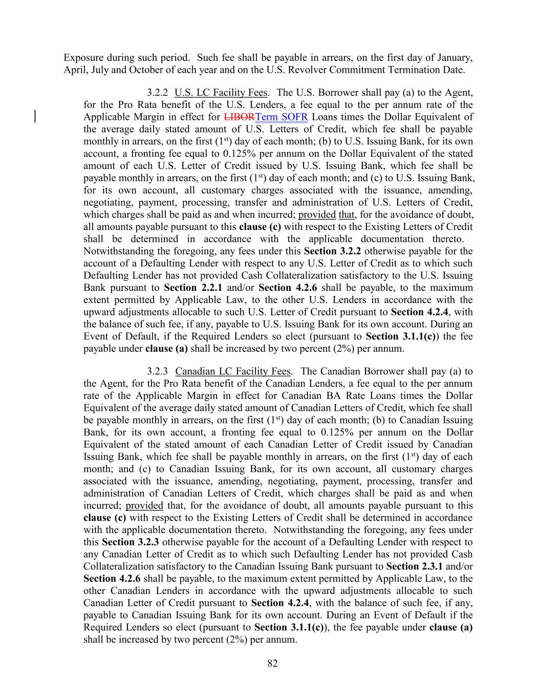 Exposure during such period. Such fee shall be payable in arrears, on the first day of January, April, July and October of each year and on the U.S. Revolver Commitment Termination Date. 3.2.2 U.S. LC Facility Fees. The U.S. Borrower shall pay (a) to the Agent, for the Pro Rata benefit of the U.S. Lenders, a fee equal to the per annum rate of the Applicable Margin in effect for LIBORTerm SOFR Loans times the Dollar Equivalent of the average daily stated amount of U.S. Letters of Credit, which fee shall be payable monthly in arrears, on the first (1st) day of each month; (b) to U.S. Issuing Bank, for its own account, a fronting fee equal to 0.125% per annum on the Dollar Equivalent of the stated amount of each U.S. Letter of Credit issued by U.S. Issuing Bank, which fee shall be payable monthly in arrears, on the first (1st) day of each month; and (c) to U.S. Issuing Bank, for its own account, all customary charges associated with the issuance, amending, negotiating, payment, processing, transfer and administration of U.S. Letters of Credit, which charges shall be paid as and when incurred; provided that, for the avoidance of doubt, all amounts payable pursuant to this clause (c) with respect to the Existing Letters of Credit shall be determined in accordance with the applicable documentation thereto. Notwithstanding the foregoing, any fees under this Section 3.2.2 otherwise payable for the account of a Defaulting Lender with respect to any U.S. Letter of Credit as to which such Defaulting Lender has not provided Cash Collateralization satisfactory to the U.S. Issuing Bank pursuant to Section 2.2.1 and/or Section 4.2.6 shall be payable, to the maximum extent permitted by Applicable Law, to the other U.S. Lenders in accordance with the upward adjustments allocable to such U.S. Letter of Credit pursuant to Section 4.2.4, with the balance of such fee, if any, payable to U.S. Issuing Bank for its own account. During an Event of Default, if the Required Lenders so elect (pursuant to Section 3.1.1(c)) the fee payable under clause (a) shall be increased by two percent (2%) per annum. 3.2.3 Canadian LC Facility Fees. The Canadian Borrower shall pay (a) to the Agent, for the Pro Rata benefit of the Canadian Lenders, a fee equal to the per annum rate of the Applicable Margin in effect for Canadian BA Rate Loans times the Dollar Equivalent of the average daily stated amount of Canadian Letters of Credit, which fee shall be payable monthly in arrears, on the first (1st) day of each month; (b) to Canadian Issuing Bank, for its own account, a fronting fee equal to 0.125% per annum on the Dollar Equivalent of the stated amount of each Canadian Letter of Credit issued by Canadian Issuing Bank, which fee shall be payable monthly in arrears, on the first (1st) day of each month; and (c) to Canadian Issuing Bank, for its own account, all customary charges associated with the issuance, amending, negotiating, payment, processing, transfer and administration of Canadian Letters of Credit, which charges shall be paid as and when incurred; provided that, for the avoidance of doubt, all amounts payable pursuant to this clause (c) with respect to the Existing Letters of Credit shall be determined in accordance with the applicable documentation thereto. Notwithstanding the foregoing, any fees under this Section 3.2.3 otherwise payable for the account of a Defaulting Lender with respect to any Canadian Letter of Credit as to which such Defaulting Lender has not provided Cash Collateralization satisfactory to the Canadian Issuing Bank pursuant to Section 2.3.1 and/or Section 4.2.6 shall be payable, to the maximum extent permitted by Applicable Law, to the other Canadian Lenders in accordance with the upward adjustments allocable to such Canadian Letter of Credit pursuant to Section 4.2.4, with the balance of such fee, if any, payable to Canadian Issuing Bank for its own account. During an Event of Default if the Required Lenders so elect (pursuant to Section 3.1.1(c)), the fee payable under clause (a) shall be increased by two percent (2%) per annum. 82