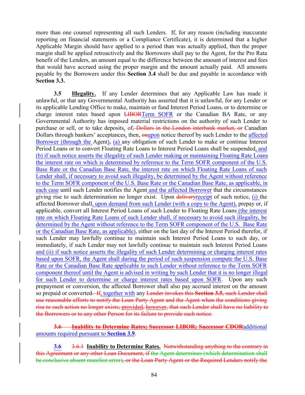 more than one counsel representing all such Lenders. If, for any reason (including inaccurate reporting on financial statements or a Compliance Certificate), it is determined that a higher Applicable Margin should have applied to a period than was actually applied, then the proper margin shall be applied retroactively and the Borrowers shall pay to the Agent, for the Pro Rata benefit of the Lenders, an amount equal to the difference between the amount of interest and fees that would have accrued using the proper margin and the amount actually paid. All amounts payable by the Borrowers under this Section 3.4 shall be due and payable in accordance with Section 3.3. 3.5 Illegality. If any Lender determines that any Applicable Law has made it unlawful, or that any Governmental Authority has asserted that it is unlawful, for any Lender or its applicable Lending Office to make, maintain or fund Interest Period Loans, or to determine or charge interest rates based upon LIBORTerm SOFR or the Canadian BA Rate, or any Governmental Authority has imposed material restrictions on the authority of such Lender to purchase or sell, or to take deposits, of, Dollars in the London interbank market, or Canadian Dollars through bankers’ acceptances, then, onupon notice thereof by such Lender to the affected Borrower (through the Agent), (a) any obligation of such Lender to make or continue Interest Period Loans or to convert Floating Rate Loans to Interest Period Loans shall be suspended, and (b) if such notice asserts the illegality of such Lender making or maintaining Floating Rate Loans the interest rate on which is determined by reference to the Term SOFR component of the U.S. Base Rate or the Canadian Base Rate, the interest rate on which Floating Rate Loans of such Lender shall, if necessary to avoid such illegality, be determined by the Agent without reference to the Term SOFR component of the U.S. Base Rate or the Canadian Base Rate, as applicable, in each case until such Lender notifies the Agent and the affected Borrower that the circumstances giving rise to such determination no longer exist. Upon deliveryreceipt of such notice, (i) the affected Borrower shall, upon demand from such Lender (with a copy to the Agent), prepay or, if applicable, convert all Interest Period Loans of such Lender to Floating Rate Loans (the interest rate on which Floating Rate Loans of such Lender shall, if necessary to avoid such illegality, be determined by the Agent without reference to the Term SOFR component of the U.S. Base Rate or the Canadian Base Rate, as applicable), either on the last day of the Interest Period therefor, if such Lender may lawfully continue to maintain such Interest Period Loans to such day, or immediately, if such Lender may not lawfully continue to maintain such Interest Period Loans and (ii) if such notice asserts the illegality of such Lender determining or charging interest rates based upon SOFR, the Agent shall during the period of such suspension compute the U.S. Base Rate or the Canadian Base Rate applicable to such Lender without reference to the Term SOFR component thereof until the Agent is advised in writing by such Lender that it is no longer illegal for such Lender to determine or charge interest rates based upon SOFR. Upon any such prepayment or conversion, the affected Borrower shall also pay accrued interest on the amount so prepaid or converted. If, together with any Lender invokes this Section 3.5, such Lender shall use reasonable efforts to notify the Loan Party Agent and the Agent when the conditions giving rise to such action no longer exists; provided, however, that such Lender shall have no liability to the Borrowers or to any other Person for its failure to provide such notice. 3.6 Inability to Determine Rates; Successor LIBOR; Successor CDORadditional amounts required pursuant to Section 3.9. 3.6 3.6.1 Inability to Determine Rates. Notwithstanding anything to the contrary in this Agreement or any other Loan Document, if the Agent determines (which determination shall be conclusive absent manifest error), or the Loan Party Agent or the Required Lenders notify the 84