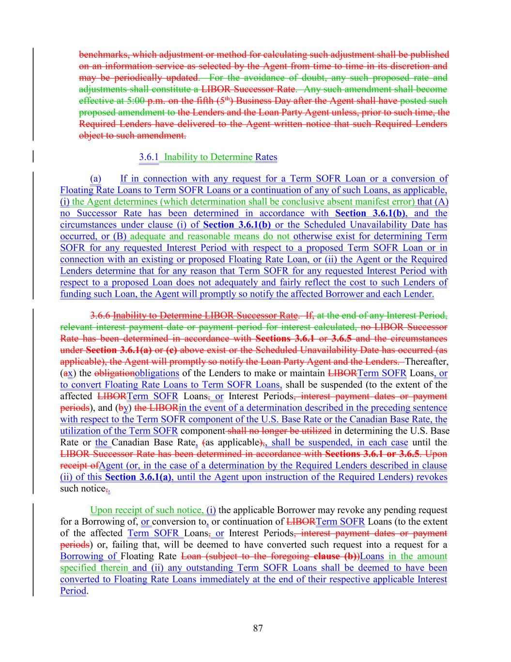 benchmarks, which adjustment or method for calculating such adjustment shall be published on an information service as selected by the Agent from time to time in its discretion and may be periodically updated. For the avoidance of doubt, any such proposed rate and adjustments shall constitute a LIBOR Successor Rate. Any such amendment shall become effective at 5:00 p.m. on the fifth (5th) Business Day after the Agent shall have posted such proposed amendment to the Lenders and the Loan Party Agent unless, prior to such time, the Required Lenders have delivered to the Agent written notice that such Required Lenders object to such amendment. 3.6.1 Inability to Determine Rates (a) If in connection with any request for a Term SOFR Loan or a conversion of Floating Rate Loans to Term SOFR Loans or a continuation of any of such Loans, as applicable, (i) the Agent determines (which determination shall be conclusive absent manifest error) that (A) no Successor Rate has been determined in accordance with Section 3.6.1(b), and the circumstances under clause (i) of Section 3.6.1(b) or the Scheduled Unavailability Date has occurred, or (B) adequate and reasonable means do not otherwise exist for determining Term SOFR for any requested Interest Period with respect to a proposed Term SOFR Loan or in connection with an existing or proposed Floating Rate Loan, or (ii) the Agent or the Required Lenders determine that for any reason that Term SOFR for any requested Interest Period with respect to a proposed Loan does not adequately and fairly reflect the cost to such Lenders of funding such Loan, the Agent will promptly so notify the affected Borrower and each Lender. 3.6.6 Inability to Determine LIBOR Successor Rate. If, at the end of any Interest Period, relevant interest payment date or payment period for interest calculated, no LIBOR Successor Rate has been determined in accordance with Sections 3.6.1 or 3.6.5 and the circumstances under Section 3.6.1(a) or (c) above exist or the Scheduled Unavailability Date has occurred (as applicable), the Agent will promptly so notify the Loan Party Agent and the Lenders. Thereafter, (ax) the obligationobligations of the Lenders to make or maintain LIBORTerm SOFR Loans, or to convert Floating Rate Loans to Term SOFR Loans, shall be suspended (to the extent of the affected LIBORTerm SOFR Loans, or Interest Periods, interest payment dates or payment periods), and (by) the LIBORin the event of a determination described in the preceding sentence with respect to the Term SOFR component of the U.S. Base Rate or the Canadian Base Rate, the utilization of the Term SOFR component shall no longer be utilized in determining the U.S. Base Rate or the Canadian Base Rate, (as applicable),, shall be suspended, in each case until the LIBOR Successor Rate has been determined in accordance with Sections 3.6.1 or 3.6.5. Upon receipt ofAgent (or, in the case of a determination by the Required Lenders described in clause (ii) of this Section 3.6.1(a), until the Agent upon instruction of the Required Lenders) revokes such notice,. Upon receipt of such notice, (i) the applicable Borrower may revoke any pending request for a Borrowing of, or conversion to, or continuation of LIBORTerm SOFR Loans (to the extent of the affected Term SOFR Loans, or Interest Periods, interest payment dates or payment periods) or, failing that, will be deemed to have converted such request into a request for a Borrowing of Floating Rate Loan (subject to the foregoing clause (b))Loans in the amount specified therein and (ii) any outstanding Term SOFR Loans shall be deemed to have been converted to Floating Rate Loans immediately at the end of their respective applicable Interest Period. 87