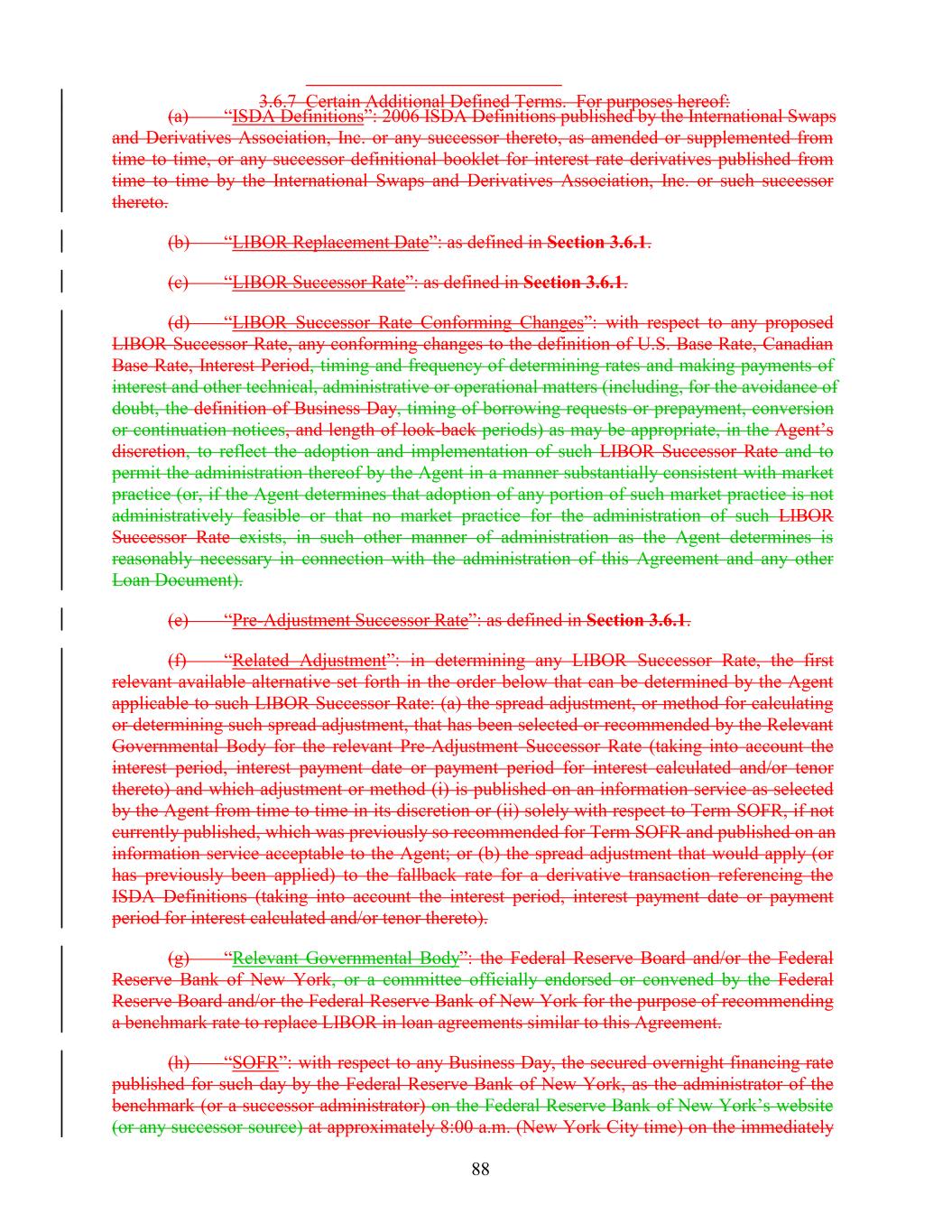 3.6.7 Certain Additional Defined Terms. For purposes hereof: (a) “ISDA Definitions”: 2006 ISDA Definitions published by the International Swaps and Derivatives Association, Inc. or any successor thereto, as amended or supplemented from time to time, or any successor definitional booklet for interest rate derivatives published from time to time by the International Swaps and Derivatives Association, Inc. or such successor thereto. (b) “LIBOR Replacement Date”: as defined in Section 3.6.1. (c) “LIBOR Successor Rate”: as defined in Section 3.6.1. (d) “LIBOR Successor Rate Conforming Changes”: with respect to any proposed LIBOR Successor Rate, any conforming changes to the definition of U.S. Base Rate, Canadian Base Rate, Interest Period, timing and frequency of determining rates and making payments of interest and other technical, administrative or operational matters (including, for the avoidance of doubt, the definition of Business Day, timing of borrowing requests or prepayment, conversion or continuation notices, and length of look-back periods) as may be appropriate, in the Agent’s discretion, to reflect the adoption and implementation of such LIBOR Successor Rate and to permit the administration thereof by the Agent in a manner substantially consistent with market practice (or, if the Agent determines that adoption of any portion of such market practice is not administratively feasible or that no market practice for the administration of such LIBOR Successor Rate exists, in such other manner of administration as the Agent determines is reasonably necessary in connection with the administration of this Agreement and any other Loan Document). (e) “Pre-Adjustment Successor Rate”: as defined in Section 3.6.1. (f) “Related Adjustment”: in determining any LIBOR Successor Rate, the first relevant available alternative set forth in the order below that can be determined by the Agent applicable to such LIBOR Successor Rate: (a) the spread adjustment, or method for calculating or determining such spread adjustment, that has been selected or recommended by the Relevant Governmental Body for the relevant Pre-Adjustment Successor Rate (taking into account the interest period, interest payment date or payment period for interest calculated and/or tenor thereto) and which adjustment or method (i) is published on an information service as selected by the Agent from time to time in its discretion or (ii) solely with respect to Term SOFR, if not currently published, which was previously so recommended for Term SOFR and published on an information service acceptable to the Agent; or (b) the spread adjustment that would apply (or has previously been applied) to the fallback rate for a derivative transaction referencing the ISDA Definitions (taking into account the interest period, interest payment date or payment period for interest calculated and/or tenor thereto). (g) “Relevant Governmental Body”: the Federal Reserve Board and/or the Federal Reserve Bank of New York, or a committee officially endorsed or convened by the Federal Reserve Board and/or the Federal Reserve Bank of New York for the purpose of recommending a benchmark rate to replace LIBOR in loan agreements similar to this Agreement. (h) “SOFR”: with respect to any Business Day, the secured overnight financing rate published for such day by the Federal Reserve Bank of New York, as the administrator of the benchmark (or a successor administrator) on the Federal Reserve Bank of New York’s website (or any successor source) at approximately 8:00 a.m. (New York City time) on the immediately 88