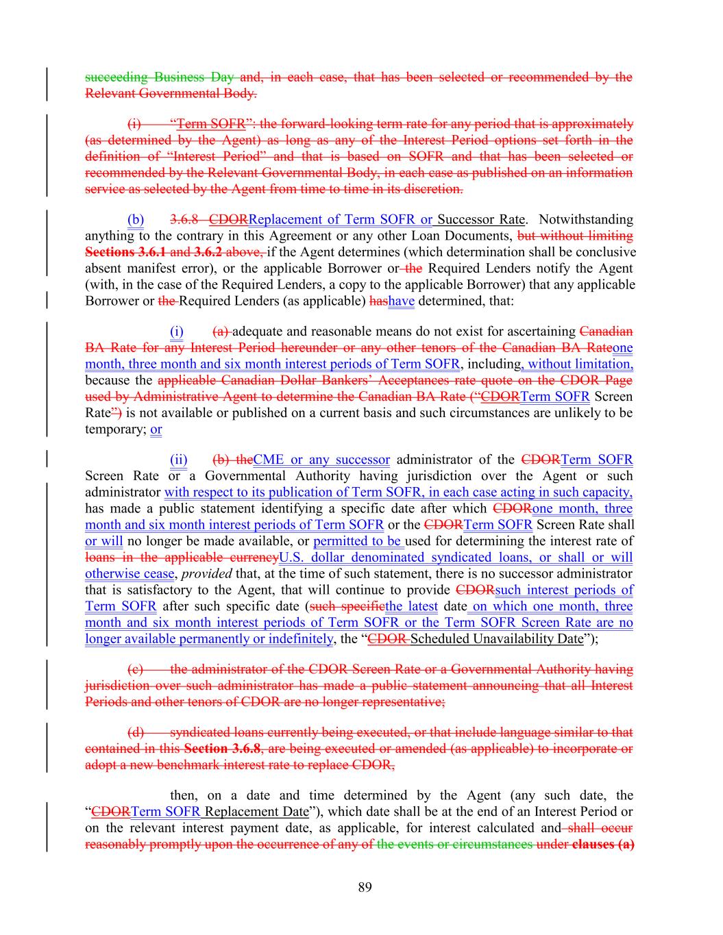 succeeding Business Day and, in each case, that has been selected or recommended by the Relevant Governmental Body. (i) “Term SOFR”: the forward-looking term rate for any period that is approximately (as determined by the Agent) as long as any of the Interest Period options set forth in the definition of “Interest Period” and that is based on SOFR and that has been selected or recommended by the Relevant Governmental Body, in each case as published on an information service as selected by the Agent from time to time in its discretion. (b) 3.6.8 CDORReplacement of Term SOFR or Successor Rate. Notwithstanding anything to the contrary in this Agreement or any other Loan Documents, but without limiting Sections 3.6.1 and 3.6.2 above, if the Agent determines (which determination shall be conclusive absent manifest error), or the applicable Borrower or the Required Lenders notify the Agent (with, in the case of the Required Lenders, a copy to the applicable Borrower) that any applicable Borrower or the Required Lenders (as applicable) hashave determined, that: (i) (a) adequate and reasonable means do not exist for ascertaining Canadian BA Rate for any Interest Period hereunder or any other tenors of the Canadian BA Rateone month, three month and six month interest periods of Term SOFR, including, without limitation, because the applicable Canadian Dollar Bankers’ Acceptances rate quote on the CDOR Page used by Administrative Agent to determine the Canadian BA Rate (“CDORTerm SOFR Screen Rate”) is not available or published on a current basis and such circumstances are unlikely to be temporary; or (ii) (b) theCME or any successor administrator of the CDORTerm SOFR Screen Rate or a Governmental Authority having jurisdiction over the Agent or such administrator with respect to its publication of Term SOFR, in each case acting in such capacity, has made a public statement identifying a specific date after which CDORone month, three month and six month interest periods of Term SOFR or the CDORTerm SOFR Screen Rate shall or will no longer be made available, or permitted to be used for determining the interest rate of loans in the applicable currencyU.S. dollar denominated syndicated loans, or shall or will otherwise cease, provided that, at the time of such statement, there is no successor administrator that is satisfactory to the Agent, that will continue to provide CDORsuch interest periods of Term SOFR after such specific date (such specificthe latest date on which one month, three month and six month interest periods of Term SOFR or the Term SOFR Screen Rate are no longer available permanently or indefinitely, the “CDOR Scheduled Unavailability Date”); (c) the administrator of the CDOR Screen Rate or a Governmental Authority having jurisdiction over such administrator has made a public statement announcing that all Interest Periods and other tenors of CDOR are no longer representative; (d) syndicated loans currently being executed, or that include language similar to that contained in this Section 3.6.8, are being executed or amended (as applicable) to incorporate or adopt a new benchmark interest rate to replace CDOR, then, on a date and time determined by the Agent (any such date, the “CDORTerm SOFR Replacement Date”), which date shall be at the end of an Interest Period or on the relevant interest payment date, as applicable, for interest calculated and shall occur reasonably promptly upon the occurrence of any of the events or circumstances under clauses (a) 89