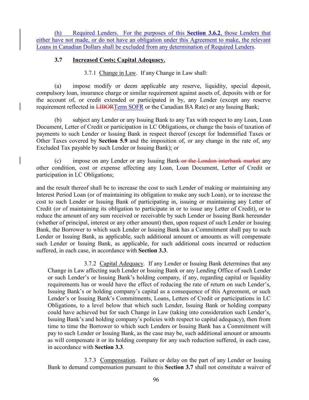 (h) Required Lenders. For the purposes of this Section 3.6.2, those Lenders that either have not made, or do not have an obligation under this Agreement to make, the relevant Loans in Canadian Dollars shall be excluded from any determination of Required Lenders. 3.7 Increased Costs; Capital Adequacy. 3.7.1 Change in Law. If any Change in Law shall: (a) impose modify or deem applicable any reserve, liquidity, special deposit, compulsory loan, insurance charge or similar requirement against assets of, deposits with or for the account of, or credit extended or participated in by, any Lender (except any reserve requirement reflected in LIBORTerm SOFR or the Canadian BA Rate) or any Issuing Bank; (b) subject any Lender or any Issuing Bank to any Tax with respect to any Loan, Loan Document, Letter of Credit or participation in LC Obligations, or change the basis of taxation of payments to such Lender or Issuing Bank in respect thereof (except for Indemnified Taxes or Other Taxes covered by Section 5.9 and the imposition of, or any change in the rate of, any Excluded Tax payable by such Lender or Issuing Bank); or (c) impose on any Lender or any Issuing Bank or the London interbank market any other condition, cost or expense affecting any Loan, Loan Document, Letter of Credit or participation in LC Obligations; and the result thereof shall be to increase the cost to such Lender of making or maintaining any Interest Period Loan (or of maintaining its obligation to make any such Loan), or to increase the cost to such Lender or Issuing Bank of participating in, issuing or maintaining any Letter of Credit (or of maintaining its obligation to participate in or to issue any Letter of Credit), or to reduce the amount of any sum received or receivable by such Lender or Issuing Bank hereunder (whether of principal, interest or any other amount) then, upon request of such Lender or Issuing Bank, the Borrower to which such Lender or Issuing Bank has a Commitment shall pay to such Lender or Issuing Bank, as applicable, such additional amount or amounts as will compensate such Lender or Issuing Bank, as applicable, for such additional costs incurred or reduction suffered, in each case, in accordance with Section 3.3. 3.7.2 Capital Adequacy. If any Lender or Issuing Bank determines that any Change in Law affecting such Lender or Issuing Bank or any Lending Office of such Lender or such Lender’s or Issuing Bank’s holding company, if any, regarding capital or liquidity requirements has or would have the effect of reducing the rate of return on such Lender’s, Issuing Bank’s or holding company’s capital as a consequence of this Agreement, or such Lender’s or Issuing Bank’s Commitments, Loans, Letters of Credit or participations in LC Obligations, to a level below that which such Lender, Issuing Bank or holding company could have achieved but for such Change in Law (taking into consideration such Lender’s, Issuing Bank’s and holding company’s policies with respect to capital adequacy), then from time to time the Borrower to which such Lenders or Issuing Bank has a Commitment will pay to such Lender or Issuing Bank, as the case may be, such additional amount or amounts as will compensate it or its holding company for any such reduction suffered, in each case, in accordance with Section 3.3. 3.7.3 Compensation. Failure or delay on the part of any Lender or Issuing Bank to demand compensation pursuant to this Section 3.7 shall not constitute a waiver of 96