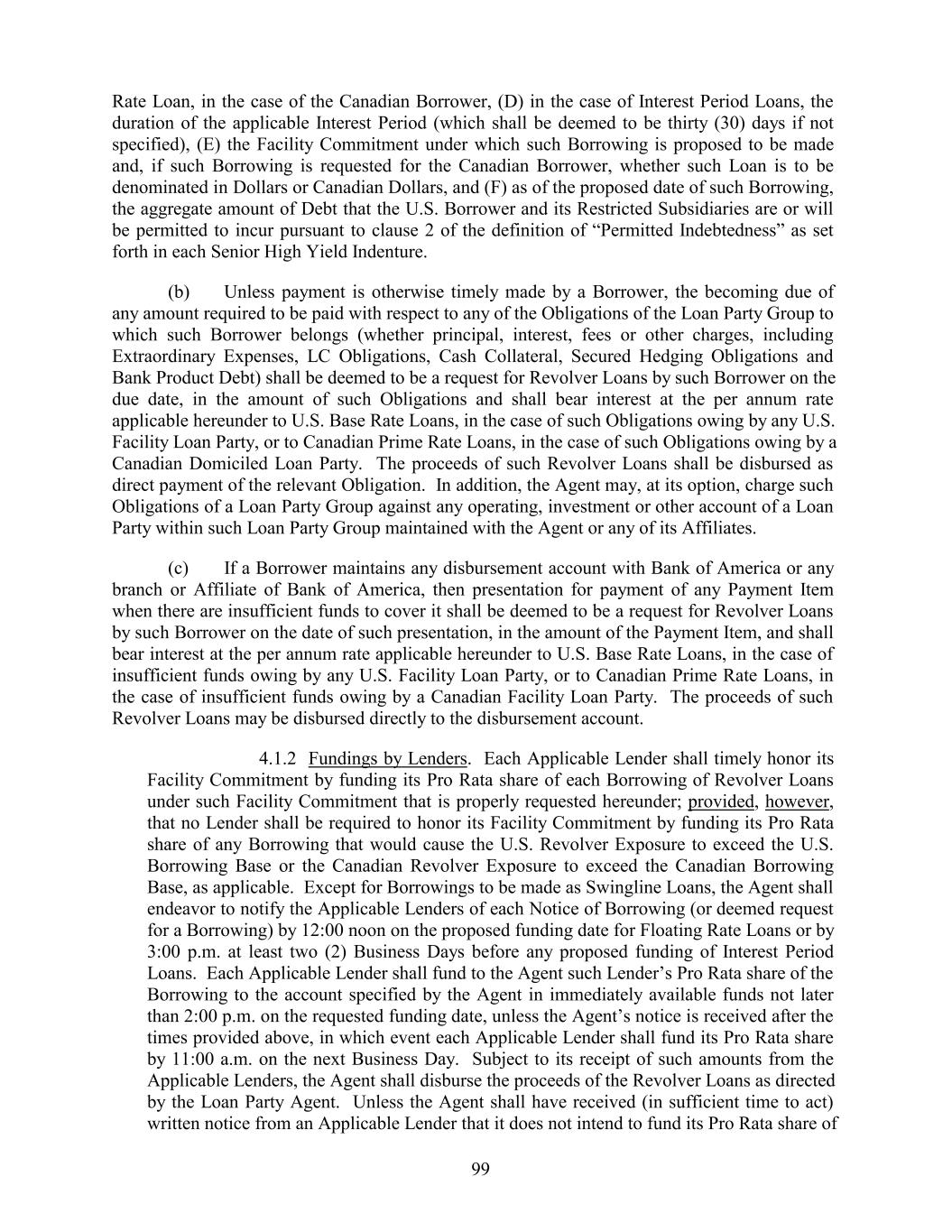 Rate Loan, in the case of the Canadian Borrower, (D) in the case of Interest Period Loans, the duration of the applicable Interest Period (which shall be deemed to be thirty (30) days if not specified), (E) the Facility Commitment under which such Borrowing is proposed to be made and, if such Borrowing is requested for the Canadian Borrower, whether such Loan is to be denominated in Dollars or Canadian Dollars, and (F) as of the proposed date of such Borrowing, the aggregate amount of Debt that the U.S. Borrower and its Restricted Subsidiaries are or will be permitted to incur pursuant to clause 2 of the definition of “Permitted Indebtedness” as set forth in each Senior High Yield Indenture. (b) Unless payment is otherwise timely made by a Borrower, the becoming due of any amount required to be paid with respect to any of the Obligations of the Loan Party Group to which such Borrower belongs (whether principal, interest, fees or other charges, including Extraordinary Expenses, LC Obligations, Cash Collateral, Secured Hedging Obligations and Bank Product Debt) shall be deemed to be a request for Revolver Loans by such Borrower on the due date, in the amount of such Obligations and shall bear interest at the per annum rate applicable hereunder to U.S. Base Rate Loans, in the case of such Obligations owing by any U.S. Facility Loan Party, or to Canadian Prime Rate Loans, in the case of such Obligations owing by a Canadian Domiciled Loan Party. The proceeds of such Revolver Loans shall be disbursed as direct payment of the relevant Obligation. In addition, the Agent may, at its option, charge such Obligations of a Loan Party Group against any operating, investment or other account of a Loan Party within such Loan Party Group maintained with the Agent or any of its Affiliates. (c) If a Borrower maintains any disbursement account with Bank of America or any branch or Affiliate of Bank of America, then presentation for payment of any Payment Item when there are insufficient funds to cover it shall be deemed to be a request for Revolver Loans by such Borrower on the date of such presentation, in the amount of the Payment Item, and shall bear interest at the per annum rate applicable hereunder to U.S. Base Rate Loans, in the case of insufficient funds owing by any U.S. Facility Loan Party, or to Canadian Prime Rate Loans, in the case of insufficient funds owing by a Canadian Facility Loan Party. The proceeds of such Revolver Loans may be disbursed directly to the disbursement account. 4.1.2 Fundings by Lenders. Each Applicable Lender shall timely honor its Facility Commitment by funding its Pro Rata share of each Borrowing of Revolver Loans under such Facility Commitment that is properly requested hereunder; provided, however, that no Lender shall be required to honor its Facility Commitment by funding its Pro Rata share of any Borrowing that would cause the U.S. Revolver Exposure to exceed the U.S. Borrowing Base or the Canadian Revolver Exposure to exceed the Canadian Borrowing Base, as applicable. Except for Borrowings to be made as Swingline Loans, the Agent shall endeavor to notify the Applicable Lenders of each Notice of Borrowing (or deemed request for a Borrowing) by 12:00 noon on the proposed funding date for Floating Rate Loans or by 3:00 p.m. at least two (2) Business Days before any proposed funding of Interest Period Loans. Each Applicable Lender shall fund to the Agent such Lender’s Pro Rata share of the Borrowing to the account specified by the Agent in immediately available funds not later than 2:00 p.m. on the requested funding date, unless the Agent’s notice is received after the times provided above, in which event each Applicable Lender shall fund its Pro Rata share by 11:00 a.m. on the next Business Day. Subject to its receipt of such amounts from the Applicable Lenders, the Agent shall disburse the proceeds of the Revolver Loans as directed by the Loan Party Agent. Unless the Agent shall have received (in sufficient time to act) written notice from an Applicable Lender that it does not intend to fund its Pro Rata share of 99