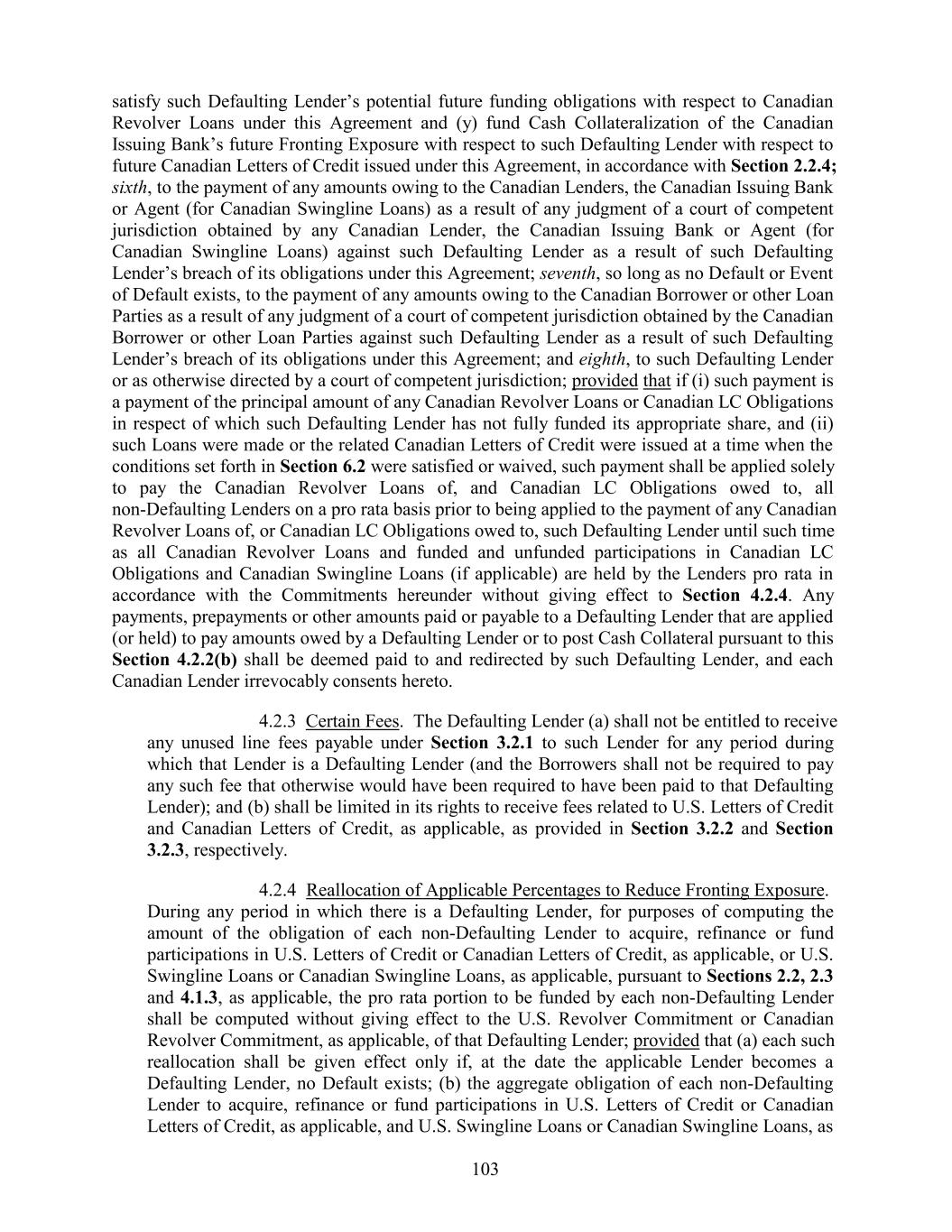 satisfy such Defaulting Lender’s potential future funding obligations with respect to Canadian Revolver Loans under this Agreement and (y) fund Cash Collateralization of the Canadian Issuing Bank’s future Fronting Exposure with respect to such Defaulting Lender with respect to future Canadian Letters of Credit issued under this Agreement, in accordance with Section 2.2.4; sixth, to the payment of any amounts owing to the Canadian Lenders, the Canadian Issuing Bank or Agent (for Canadian Swingline Loans) as a result of any judgment of a court of competent jurisdiction obtained by any Canadian Lender, the Canadian Issuing Bank or Agent (for Canadian Swingline Loans) against such Defaulting Lender as a result of such Defaulting Lender’s breach of its obligations under this Agreement; seventh, so long as no Default or Event of Default exists, to the payment of any amounts owing to the Canadian Borrower or other Loan Parties as a result of any judgment of a court of competent jurisdiction obtained by the Canadian Borrower or other Loan Parties against such Defaulting Lender as a result of such Defaulting Lender’s breach of its obligations under this Agreement; and eighth, to such Defaulting Lender or as otherwise directed by a court of competent jurisdiction; provided that if (i) such payment is a payment of the principal amount of any Canadian Revolver Loans or Canadian LC Obligations in respect of which such Defaulting Lender has not fully funded its appropriate share, and (ii) such Loans were made or the related Canadian Letters of Credit were issued at a time when the conditions set forth in Section 6.2 were satisfied or waived, such payment shall be applied solely to pay the Canadian Revolver Loans of, and Canadian LC Obligations owed to, all non-Defaulting Lenders on a pro rata basis prior to being applied to the payment of any Canadian Revolver Loans of, or Canadian LC Obligations owed to, such Defaulting Lender until such time as all Canadian Revolver Loans and funded and unfunded participations in Canadian LC Obligations and Canadian Swingline Loans (if applicable) are held by the Lenders pro rata in accordance with the Commitments hereunder without giving effect to Section 4.2.4. Any payments, prepayments or other amounts paid or payable to a Defaulting Lender that are applied (or held) to pay amounts owed by a Defaulting Lender or to post Cash Collateral pursuant to this Section 4.2.2(b) shall be deemed paid to and redirected by such Defaulting Lender, and each Canadian Lender irrevocably consents hereto. 4.2.3 Certain Fees. The Defaulting Lender (a) shall not be entitled to receive any unused line fees payable under Section 3.2.1 to such Lender for any period during which that Lender is a Defaulting Lender (and the Borrowers shall not be required to pay any such fee that otherwise would have been required to have been paid to that Defaulting Lender); and (b) shall be limited in its rights to receive fees related to U.S. Letters of Credit and Canadian Letters of Credit, as applicable, as provided in Section 3.2.2 and Section 3.2.3, respectively. 4.2.4 Reallocation of Applicable Percentages to Reduce Fronting Exposure. During any period in which there is a Defaulting Lender, for purposes of computing the amount of the obligation of each non-Defaulting Lender to acquire, refinance or fund participations in U.S. Letters of Credit or Canadian Letters of Credit, as applicable, or U.S. Swingline Loans or Canadian Swingline Loans, as applicable, pursuant to Sections 2.2, 2.3 and 4.1.3, as applicable, the pro rata portion to be funded by each non-Defaulting Lender shall be computed without giving effect to the U.S. Revolver Commitment or Canadian Revolver Commitment, as applicable, of that Defaulting Lender; provided that (a) each such reallocation shall be given effect only if, at the date the applicable Lender becomes a Defaulting Lender, no Default exists; (b) the aggregate obligation of each non-Defaulting Lender to acquire, refinance or fund participations in U.S. Letters of Credit or Canadian Letters of Credit, as applicable, and U.S. Swingline Loans or Canadian Swingline Loans, as 103