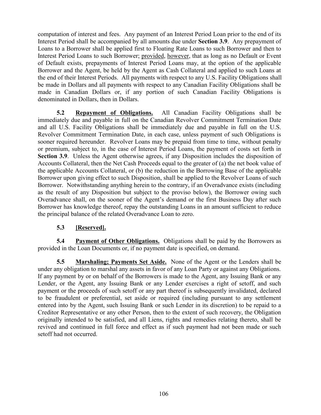 computation of interest and fees. Any payment of an Interest Period Loan prior to the end of its Interest Period shall be accompanied by all amounts due under Section 3.9. Any prepayment of Loans to a Borrower shall be applied first to Floating Rate Loans to such Borrower and then to Interest Period Loans to such Borrower; provided, however, that as long as no Default or Event of Default exists, prepayments of Interest Period Loans may, at the option of the applicable Borrower and the Agent, be held by the Agent as Cash Collateral and applied to such Loans at the end of their Interest Periods. All payments with respect to any U.S. Facility Obligations shall be made in Dollars and all payments with respect to any Canadian Facility Obligations shall be made in Canadian Dollars or, if any portion of such Canadian Facility Obligations is denominated in Dollars, then in Dollars. 5.2 Repayment of Obligations. All Canadian Facility Obligations shall be immediately due and payable in full on the Canadian Revolver Commitment Termination Date and all U.S. Facility Obligations shall be immediately due and payable in full on the U.S. Revolver Commitment Termination Date, in each case, unless payment of such Obligations is sooner required hereunder. Revolver Loans may be prepaid from time to time, without penalty or premium, subject to, in the case of Interest Period Loans, the payment of costs set forth in Section 3.9. Unless the Agent otherwise agrees, if any Disposition includes the disposition of Accounts Collateral, then the Net Cash Proceeds equal to the greater of (a) the net book value of the applicable Accounts Collateral, or (b) the reduction in the Borrowing Base of the applicable Borrower upon giving effect to such Disposition, shall be applied to the Revolver Loans of such Borrower. Notwithstanding anything herein to the contrary, if an Overadvance exists (including as the result of any Disposition but subject to the proviso below), the Borrower owing such Overadvance shall, on the sooner of the Agent’s demand or the first Business Day after such Borrower has knowledge thereof, repay the outstanding Loans in an amount sufficient to reduce the principal balance of the related Overadvance Loan to zero. 5.3 [Reserved]. 5.4 Payment of Other Obligations. Obligations shall be paid by the Borrowers as provided in the Loan Documents or, if no payment date is specified, on demand. 5.5 Marshaling; Payments Set Aside. None of the Agent or the Lenders shall be under any obligation to marshal any assets in favor of any Loan Party or against any Obligations. If any payment by or on behalf of the Borrowers is made to the Agent, any Issuing Bank or any Lender, or the Agent, any Issuing Bank or any Lender exercises a right of setoff, and such payment or the proceeds of such setoff or any part thereof is subsequently invalidated, declared to be fraudulent or preferential, set aside or required (including pursuant to any settlement entered into by the Agent, such Issuing Bank or such Lender in its discretion) to be repaid to a Creditor Representative or any other Person, then to the extent of such recovery, the Obligation originally intended to be satisfied, and all Liens, rights and remedies relating thereto, shall be revived and continued in full force and effect as if such payment had not been made or such setoff had not occurred. 106
