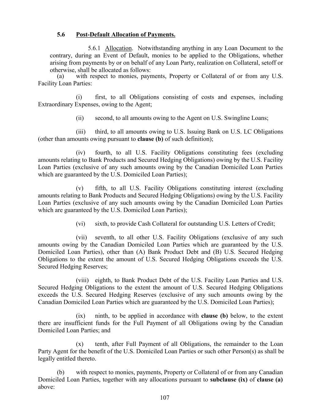 5.6 Post-Default Allocation of Payments. 5.6.1 Allocation. Notwithstanding anything in any Loan Document to the contrary, during an Event of Default, monies to be applied to the Obligations, whether arising from payments by or on behalf of any Loan Party, realization on Collateral, setoff or otherwise, shall be allocated as follows: (a) with respect to monies, payments, Property or Collateral of or from any U.S. Facility Loan Parties: (i) first, to all Obligations consisting of costs and expenses, including Extraordinary Expenses, owing to the Agent; (ii) second, to all amounts owing to the Agent on U.S. Swingline Loans; (iii) third, to all amounts owing to U.S. Issuing Bank on U.S. LC Obligations (other than amounts owing pursuant to clause (b) of such definition); (iv) fourth, to all U.S. Facility Obligations constituting fees (excluding amounts relating to Bank Products and Secured Hedging Obligations) owing by the U.S. Facility Loan Parties (exclusive of any such amounts owing by the Canadian Domiciled Loan Parties which are guaranteed by the U.S. Domiciled Loan Parties); (v) fifth, to all U.S. Facility Obligations constituting interest (excluding amounts relating to Bank Products and Secured Hedging Obligations) owing by the U.S. Facility Loan Parties (exclusive of any such amounts owing by the Canadian Domiciled Loan Parties which are guaranteed by the U.S. Domiciled Loan Parties); (vi) sixth, to provide Cash Collateral for outstanding U.S. Letters of Credit; (vii) seventh, to all other U.S. Facility Obligations (exclusive of any such amounts owing by the Canadian Domiciled Loan Parties which are guaranteed by the U.S. Domiciled Loan Parties), other than (A) Bank Product Debt and (B) U.S. Secured Hedging Obligations to the extent the amount of U.S. Secured Hedging Obligations exceeds the U.S. Secured Hedging Reserves; (viii) eighth, to Bank Product Debt of the U.S. Facility Loan Parties and U.S. Secured Hedging Obligations to the extent the amount of U.S. Secured Hedging Obligations exceeds the U.S. Secured Hedging Reserves (exclusive of any such amounts owing by the Canadian Domiciled Loan Parties which are guaranteed by the U.S. Domiciled Loan Parties); (ix) ninth, to be applied in accordance with clause (b) below, to the extent there are insufficient funds for the Full Payment of all Obligations owing by the Canadian Domiciled Loan Parties; and (x) tenth, after Full Payment of all Obligations, the remainder to the Loan Party Agent for the benefit of the U.S. Domiciled Loan Parties or such other Person(s) as shall be legally entitled thereto. (b) with respect to monies, payments, Property or Collateral of or from any Canadian Domiciled Loan Parties, together with any allocations pursuant to subclause (ix) of clause (a) above: 107