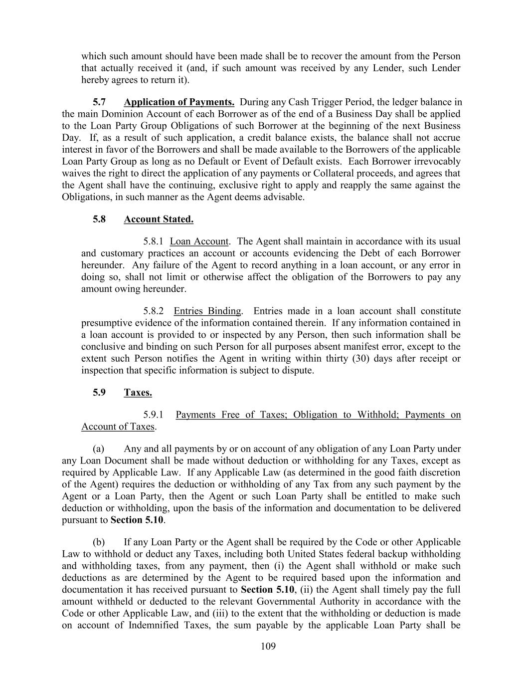 which such amount should have been made shall be to recover the amount from the Person that actually received it (and, if such amount was received by any Lender, such Lender hereby agrees to return it). 5.7 Application of Payments. During any Cash Trigger Period, the ledger balance in the main Dominion Account of each Borrower as of the end of a Business Day shall be applied to the Loan Party Group Obligations of such Borrower at the beginning of the next Business Day. If, as a result of such application, a credit balance exists, the balance shall not accrue interest in favor of the Borrowers and shall be made available to the Borrowers of the applicable Loan Party Group as long as no Default or Event of Default exists. Each Borrower irrevocably waives the right to direct the application of any payments or Collateral proceeds, and agrees that the Agent shall have the continuing, exclusive right to apply and reapply the same against the Obligations, in such manner as the Agent deems advisable. 5.8 Account Stated. 5.8.1 Loan Account. The Agent shall maintain in accordance with its usual and customary practices an account or accounts evidencing the Debt of each Borrower hereunder. Any failure of the Agent to record anything in a loan account, or any error in doing so, shall not limit or otherwise affect the obligation of the Borrowers to pay any amount owing hereunder. 5.8.2 Entries Binding. Entries made in a loan account shall constitute presumptive evidence of the information contained therein. If any information contained in a loan account is provided to or inspected by any Person, then such information shall be conclusive and binding on such Person for all purposes absent manifest error, except to the extent such Person notifies the Agent in writing within thirty (30) days after receipt or inspection that specific information is subject to dispute. 5.9 Taxes. 5.9.1 Payments Free of Taxes; Obligation to Withhold; Payments on Account of Taxes. (a) Any and all payments by or on account of any obligation of any Loan Party under any Loan Document shall be made without deduction or withholding for any Taxes, except as required by Applicable Law. If any Applicable Law (as determined in the good faith discretion of the Agent) requires the deduction or withholding of any Tax from any such payment by the Agent or a Loan Party, then the Agent or such Loan Party shall be entitled to make such deduction or withholding, upon the basis of the information and documentation to be delivered pursuant to Section 5.10. (b) If any Loan Party or the Agent shall be required by the Code or other Applicable Law to withhold or deduct any Taxes, including both United States federal backup withholding and withholding taxes, from any payment, then (i) the Agent shall withhold or make such deductions as are determined by the Agent to be required based upon the information and documentation it has received pursuant to Section 5.10, (ii) the Agent shall timely pay the full amount withheld or deducted to the relevant Governmental Authority in accordance with the Code or other Applicable Law, and (iii) to the extent that the withholding or deduction is made on account of Indemnified Taxes, the sum payable by the applicable Loan Party shall be 109