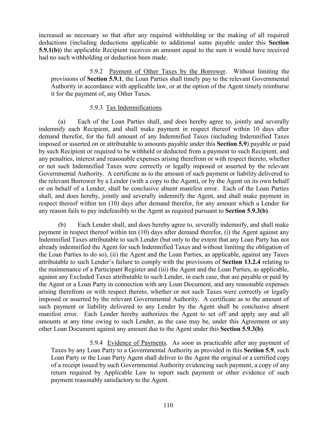 increased as necessary so that after any required withholding or the making of all required deductions (including deductions applicable to additional sums payable under this Section 5.9.1(b)) the applicable Recipient receives an amount equal to the sum it would have received had no such withholding or deduction been made. 5.9.2 Payment of Other Taxes by the Borrower. Without limiting the provisions of Section 5.9.1, the Loan Parties shall timely pay to the relevant Governmental Authority in accordance with applicable law, or at the option of the Agent timely reimburse it for the payment of, any Other Taxes. 5.9.3 Tax Indemnifications. (a) Each of the Loan Parties shall, and does hereby agree to, jointly and severally indemnify each Recipient, and shall make payment in respect thereof within 10 days after demand therefor, for the full amount of any Indemnified Taxes (including Indemnified Taxes imposed or asserted on or attributable to amounts payable under this Section 5.9) payable or paid by such Recipient or required to be withheld or deducted from a payment to such Recipient, and any penalties, interest and reasonable expenses arising therefrom or with respect thereto, whether or not such Indemnified Taxes were correctly or legally imposed or asserted by the relevant Governmental Authority. A certificate as to the amount of such payment or liability delivered to the relevant Borrower by a Lender (with a copy to the Agent), or by the Agent on its own behalf or on behalf of a Lender, shall be conclusive absent manifest error. Each of the Loan Parties shall, and does hereby, jointly and severally indemnify the Agent, and shall make payment in respect thereof within ten (10) days after demand therefor, for any amount which a Lender for any reason fails to pay indefeasibly to the Agent as required pursuant to Section 5.9.3(b). (b) Each Lender shall, and does hereby agree to, severally indemnify, and shall make payment in respect thereof within ten (10) days after demand therefor, (i) the Agent against any Indemnified Taxes attributable to such Lender (but only to the extent that any Loan Party has not already indemnified the Agent for such Indemnified Taxes and without limiting the obligation of the Loan Parties to do so), (ii) the Agent and the Loan Parties, as applicable, against any Taxes attributable to such Lender’s failure to comply with the provisions of Section 13.2.4 relating to the maintenance of a Participant Register and (iii) the Agent and the Loan Parties, as applicable, against any Excluded Taxes attributable to such Lender, in each case, that are payable or paid by the Agent or a Loan Party in connection with any Loan Document, and any reasonable expenses arising therefrom or with respect thereto, whether or not such Taxes were correctly or legally imposed or asserted by the relevant Governmental Authority. A certificate as to the amount of such payment or liability delivered to any Lender by the Agent shall be conclusive absent manifest error. Each Lender hereby authorizes the Agent to set off and apply any and all amounts at any time owing to such Lender, as the case may be, under this Agreement or any other Loan Document against any amount due to the Agent under this Section 5.9.3(b). 5.9.4 Evidence of Payments. As soon as practicable after any payment of Taxes by any Loan Party to a Governmental Authority as provided in this Section 5.9, such Loan Party or the Loan Party Agent shall deliver to the Agent the original or a certified copy of a receipt issued by such Governmental Authority evidencing such payment, a copy of any return required by Applicable Law to report such payment or other evidence of such payment reasonably satisfactory to the Agent. 110