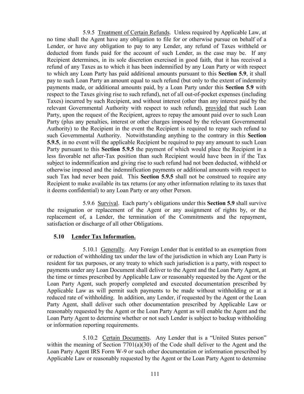 5.9.5 Treatment of Certain Refunds. Unless required by Applicable Law, at no time shall the Agent have any obligation to file for or otherwise pursue on behalf of a Lender, or have any obligation to pay to any Lender, any refund of Taxes withheld or deducted from funds paid for the account of such Lender, as the case may be. If any Recipient determines, in its sole discretion exercised in good faith, that it has received a refund of any Taxes as to which it has been indemnified by any Loan Party or with respect to which any Loan Party has paid additional amounts pursuant to this Section 5.9, it shall pay to such Loan Party an amount equal to such refund (but only to the extent of indemnity payments made, or additional amounts paid, by a Loan Party under this Section 5.9 with respect to the Taxes giving rise to such refund), net of all out-of-pocket expenses (including Taxes) incurred by such Recipient, and without interest (other than any interest paid by the relevant Governmental Authority with respect to such refund), provided that such Loan Party, upon the request of the Recipient, agrees to repay the amount paid over to such Loan Party (plus any penalties, interest or other charges imposed by the relevant Governmental Authority) to the Recipient in the event the Recipient is required to repay such refund to such Governmental Authority. Notwithstanding anything to the contrary in this Section 5.9.5, in no event will the applicable Recipient be required to pay any amount to such Loan Party pursuant to this Section 5.9.5 the payment of which would place the Recipient in a less favorable net after-Tax position than such Recipient would have been in if the Tax subject to indemnification and giving rise to such refund had not been deducted, withheld or otherwise imposed and the indemnification payments or additional amounts with respect to such Tax had never been paid. This Section 5.9.5 shall not be construed to require any Recipient to make available its tax returns (or any other information relating to its taxes that it deems confidential) to any Loan Party or any other Person. 5.9.6 Survival. Each party’s obligations under this Section 5.9 shall survive the resignation or replacement of the Agent or any assignment of rights by, or the replacement of, a Lender, the termination of the Commitments and the repayment, satisfaction or discharge of all other Obligations. 5.10 Lender Tax Information. 5.10.1 Generally. Any Foreign Lender that is entitled to an exemption from or reduction of withholding tax under the law of the jurisdiction in which any Loan Party is resident for tax purposes, or any treaty to which such jurisdiction is a party, with respect to payments under any Loan Document shall deliver to the Agent and the Loan Party Agent, at the time or times prescribed by Applicable Law or reasonably requested by the Agent or the Loan Party Agent, such properly completed and executed documentation prescribed by Applicable Law as will permit such payments to be made without withholding or at a reduced rate of withholding. In addition, any Lender, if requested by the Agent or the Loan Party Agent, shall deliver such other documentation prescribed by Applicable Law or reasonably requested by the Agent or the Loan Party Agent as will enable the Agent and the Loan Party Agent to determine whether or not such Lender is subject to backup withholding or information reporting requirements. 5.10.2 Certain Documents. Any Lender that is a “United States person” within the meaning of Section 7701(a)(30) of the Code shall deliver to the Agent and the Loan Party Agent IRS Form W-9 or such other documentation or information prescribed by Applicable Law or reasonably requested by the Agent or the Loan Party Agent to determine 111
