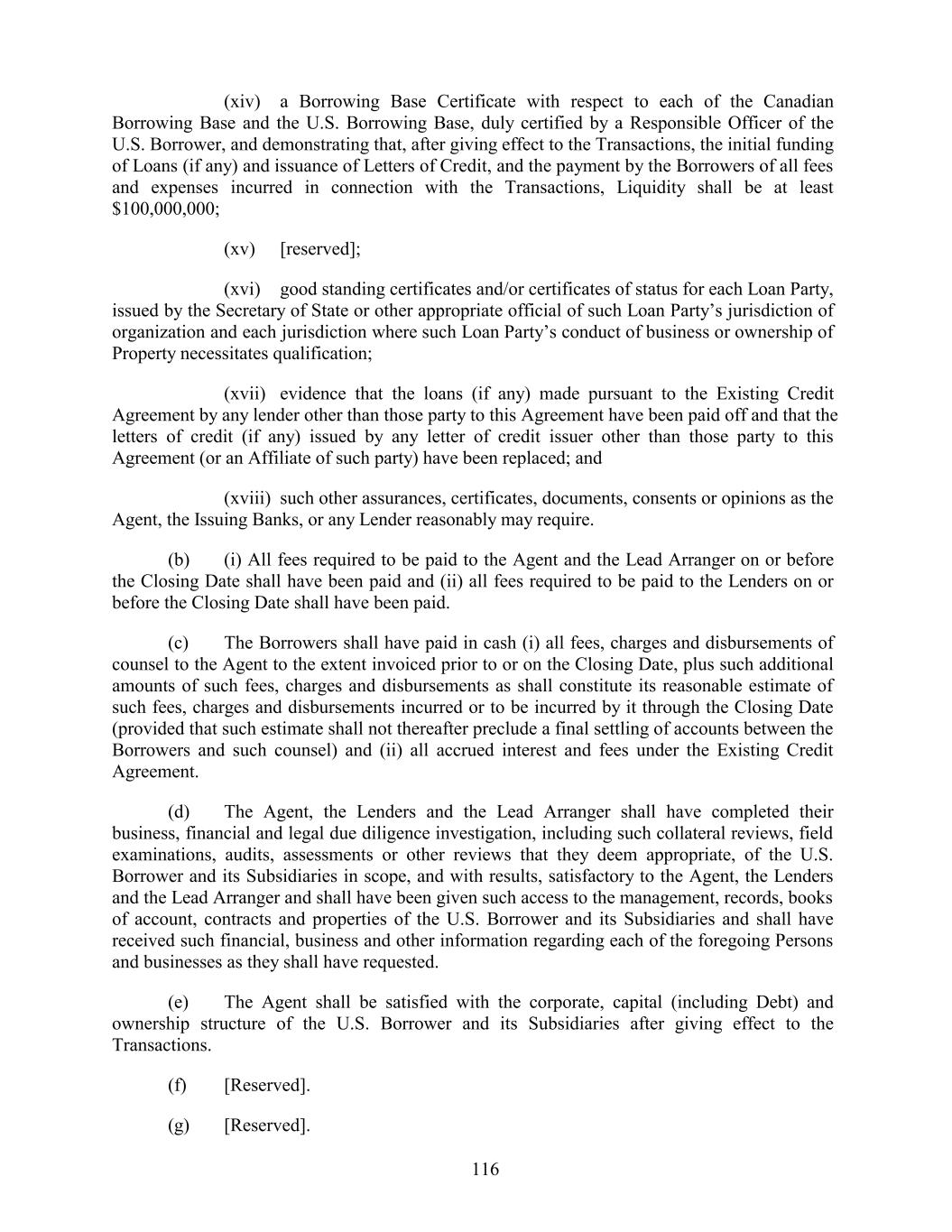 (xiv) a Borrowing Base Certificate with respect to each of the Canadian Borrowing Base and the U.S. Borrowing Base, duly certified by a Responsible Officer of the U.S. Borrower, and demonstrating that, after giving effect to the Transactions, the initial funding of Loans (if any) and issuance of Letters of Credit, and the payment by the Borrowers of all fees and expenses incurred in connection with the Transactions, Liquidity shall be at least $100,000,000; (xv) [reserved]; (xvi) good standing certificates and/or certificates of status for each Loan Party, issued by the Secretary of State or other appropriate official of such Loan Party’s jurisdiction of organization and each jurisdiction where such Loan Party’s conduct of business or ownership of Property necessitates qualification; (xvii) evidence that the loans (if any) made pursuant to the Existing Credit Agreement by any lender other than those party to this Agreement have been paid off and that the letters of credit (if any) issued by any letter of credit issuer other than those party to this Agreement (or an Affiliate of such party) have been replaced; and (xviii) such other assurances, certificates, documents, consents or opinions as the Agent, the Issuing Banks, or any Lender reasonably may require. (b) (i) All fees required to be paid to the Agent and the Lead Arranger on or before the Closing Date shall have been paid and (ii) all fees required to be paid to the Lenders on or before the Closing Date shall have been paid. (c) The Borrowers shall have paid in cash (i) all fees, charges and disbursements of counsel to the Agent to the extent invoiced prior to or on the Closing Date, plus such additional amounts of such fees, charges and disbursements as shall constitute its reasonable estimate of such fees, charges and disbursements incurred or to be incurred by it through the Closing Date (provided that such estimate shall not thereafter preclude a final settling of accounts between the Borrowers and such counsel) and (ii) all accrued interest and fees under the Existing Credit Agreement. (d) The Agent, the Lenders and the Lead Arranger shall have completed their business, financial and legal due diligence investigation, including such collateral reviews, field examinations, audits, assessments or other reviews that they deem appropriate, of the U.S. Borrower and its Subsidiaries in scope, and with results, satisfactory to the Agent, the Lenders and the Lead Arranger and shall have been given such access to the management, records, books of account, contracts and properties of the U.S. Borrower and its Subsidiaries and shall have received such financial, business and other information regarding each of the foregoing Persons and businesses as they shall have requested. (e) The Agent shall be satisfied with the corporate, capital (including Debt) and ownership structure of the U.S. Borrower and its Subsidiaries after giving effect to the Transactions. (f) [Reserved]. (g) [Reserved]. 116