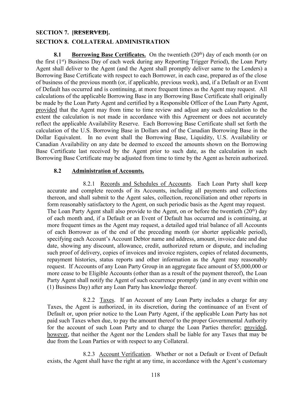 SECTION 7. [RESERVED]. SECTION 8. COLLATERAL ADMINISTRATION 8.1 Borrowing Base Certificates. On the twentieth (20th) day of each month (or on the first (1st) Business Day of each week during any Reporting Trigger Period), the Loan Party Agent shall deliver to the Agent (and the Agent shall promptly deliver same to the Lenders) a Borrowing Base Certificate with respect to each Borrower, in each case, prepared as of the close of business of the previous month (or, if applicable, previous week), and, if a Default or an Event of Default has occurred and is continuing, at more frequent times as the Agent may request. All calculations of the applicable Borrowing Base in any Borrowing Base Certificate shall originally be made by the Loan Party Agent and certified by a Responsible Officer of the Loan Party Agent, provided that the Agent may from time to time review and adjust any such calculation to the extent the calculation is not made in accordance with this Agreement or does not accurately reflect the applicable Availability Reserve. Each Borrowing Base Certificate shall set forth the calculation of the U.S. Borrowing Base in Dollars and of the Canadian Borrowing Base in the Dollar Equivalent. In no event shall the Borrowing Base, Liquidity, U.S. Availability or Canadian Availability on any date be deemed to exceed the amounts shown on the Borrowing Base Certificate last received by the Agent prior to such date, as the calculation in such Borrowing Base Certificate may be adjusted from time to time by the Agent as herein authorized. 8.2 Administration of Accounts. 8.2.1 Records and Schedules of Accounts. Each Loan Party shall keep accurate and complete records of its Accounts, including all payments and collections thereon, and shall submit to the Agent sales, collection, reconciliation and other reports in form reasonably satisfactory to the Agent, on such periodic basis as the Agent may request. The Loan Party Agent shall also provide to the Agent, on or before the twentieth (20th) day of each month and, if a Default or an Event of Default has occurred and is continuing, at more frequent times as the Agent may request, a detailed aged trial balance of all Accounts of each Borrower as of the end of the preceding month (or shorter applicable period), specifying each Account’s Account Debtor name and address, amount, invoice date and due date, showing any discount, allowance, credit, authorized return or dispute, and including such proof of delivery, copies of invoices and invoice registers, copies of related documents, repayment histories, status reports and other information as the Agent may reasonably request. If Accounts of any Loan Party Group in an aggregate face amount of $5,000,000 or more cease to be Eligible Accounts (other than as a result of the payment thereof), the Loan Party Agent shall notify the Agent of such occurrence promptly (and in any event within one (1) Business Day) after any Loan Party has knowledge thereof. 8.2.2 Taxes. If an Account of any Loan Party includes a charge for any Taxes, the Agent is authorized, in its discretion, during the continuance of an Event of Default or, upon prior notice to the Loan Party Agent, if the applicable Loan Party has not paid such Taxes when due, to pay the amount thereof to the proper Governmental Authority for the account of such Loan Party and to charge the Loan Parties therefor; provided, however, that neither the Agent nor the Lenders shall be liable for any Taxes that may be due from the Loan Parties or with respect to any Collateral. 8.2.3 Account Verification. Whether or not a Default or Event of Default exists, the Agent shall have the right at any time, in accordance with the Agent’s customary 118