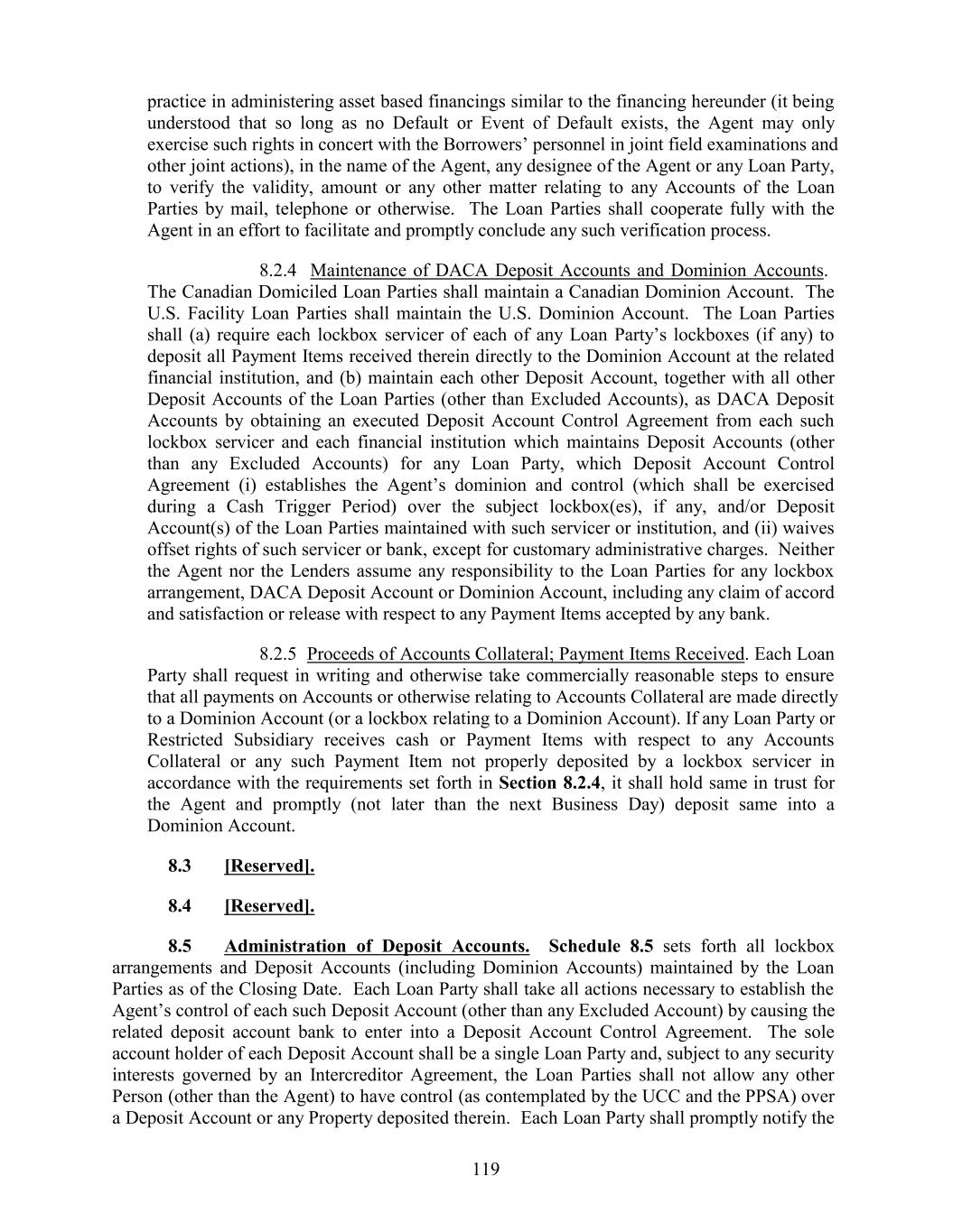 practice in administering asset based financings similar to the financing hereunder (it being understood that so long as no Default or Event of Default exists, the Agent may only exercise such rights in concert with the Borrowers’ personnel in joint field examinations and other joint actions), in the name of the Agent, any designee of the Agent or any Loan Party, to verify the validity, amount or any other matter relating to any Accounts of the Loan Parties by mail, telephone or otherwise. The Loan Parties shall cooperate fully with the Agent in an effort to facilitate and promptly conclude any such verification process. 8.2.4 Maintenance of DACA Deposit Accounts and Dominion Accounts. The Canadian Domiciled Loan Parties shall maintain a Canadian Dominion Account. The U.S. Facility Loan Parties shall maintain the U.S. Dominion Account. The Loan Parties shall (a) require each lockbox servicer of each of any Loan Party’s lockboxes (if any) to deposit all Payment Items received therein directly to the Dominion Account at the related financial institution, and (b) maintain each other Deposit Account, together with all other Deposit Accounts of the Loan Parties (other than Excluded Accounts), as DACA Deposit Accounts by obtaining an executed Deposit Account Control Agreement from each such lockbox servicer and each financial institution which maintains Deposit Accounts (other than any Excluded Accounts) for any Loan Party, which Deposit Account Control Agreement (i) establishes the Agent’s dominion and control (which shall be exercised during a Cash Trigger Period) over the subject lockbox(es), if any, and/or Deposit Account(s) of the Loan Parties maintained with such servicer or institution, and (ii) waives offset rights of such servicer or bank, except for customary administrative charges. Neither the Agent nor the Lenders assume any responsibility to the Loan Parties for any lockbox arrangement, DACA Deposit Account or Dominion Account, including any claim of accord and satisfaction or release with respect to any Payment Items accepted by any bank. 8.2.5 Proceeds of Accounts Collateral; Payment Items Received. Each Loan Party shall request in writing and otherwise take commercially reasonable steps to ensure that all payments on Accounts or otherwise relating to Accounts Collateral are made directly to a Dominion Account (or a lockbox relating to a Dominion Account). If any Loan Party or Restricted Subsidiary receives cash or Payment Items with respect to any Accounts Collateral or any such Payment Item not properly deposited by a lockbox servicer in accordance with the requirements set forth in Section 8.2.4, it shall hold same in trust for the Agent and promptly (not later than the next Business Day) deposit same into a Dominion Account. 8.3 [Reserved]. 8.4 [Reserved]. 8.5 Administration of Deposit Accounts. Schedule 8.5 sets forth all lockbox arrangements and Deposit Accounts (including Dominion Accounts) maintained by the Loan Parties as of the Closing Date. Each Loan Party shall take all actions necessary to establish the Agent’s control of each such Deposit Account (other than any Excluded Account) by causing the related deposit account bank to enter into a Deposit Account Control Agreement. The sole account holder of each Deposit Account shall be a single Loan Party and, subject to any security interests governed by an Intercreditor Agreement, the Loan Parties shall not allow any other Person (other than the Agent) to have control (as contemplated by the UCC and the PPSA) over a Deposit Account or any Property deposited therein. Each Loan Party shall promptly notify the 119