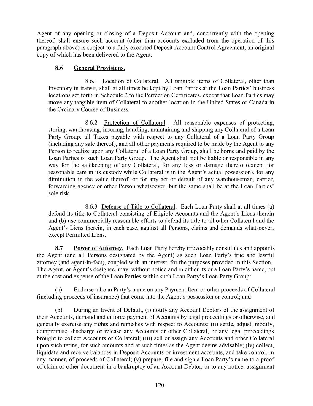 Agent of any opening or closing of a Deposit Account and, concurrently with the opening thereof, shall ensure such account (other than accounts excluded from the operation of this paragraph above) is subject to a fully executed Deposit Account Control Agreement, an original copy of which has been delivered to the Agent. 8.6 General Provisions. 8.6.1 Location of Collateral. All tangible items of Collateral, other than Inventory in transit, shall at all times be kept by Loan Parties at the Loan Parties’ business locations set forth in Schedule 2 to the Perfection Certificates, except that Loan Parties may move any tangible item of Collateral to another location in the United States or Canada in the Ordinary Course of Business. 8.6.2 Protection of Collateral. All reasonable expenses of protecting, storing, warehousing, insuring, handling, maintaining and shipping any Collateral of a Loan Party Group, all Taxes payable with respect to any Collateral of a Loan Party Group (including any sale thereof), and all other payments required to be made by the Agent to any Person to realize upon any Collateral of a Loan Party Group, shall be borne and paid by the Loan Parties of such Loan Party Group. The Agent shall not be liable or responsible in any way for the safekeeping of any Collateral, for any loss or damage thereto (except for reasonable care in its custody while Collateral is in the Agent’s actual possession), for any diminution in the value thereof, or for any act or default of any warehouseman, carrier, forwarding agency or other Person whatsoever, but the same shall be at the Loan Parties’ sole risk. 8.6.3 Defense of Title to Collateral. Each Loan Party shall at all times (a) defend its title to Collateral consisting of Eligible Accounts and the Agent’s Liens therein and (b) use commercially reasonable efforts to defend its title to all other Collateral and the Agent’s Liens therein, in each case, against all Persons, claims and demands whatsoever, except Permitted Liens. 8.7 Power of Attorney. Each Loan Party hereby irrevocably constitutes and appoints the Agent (and all Persons designated by the Agent) as such Loan Party’s true and lawful attorney (and agent-in-fact), coupled with an interest, for the purposes provided in this Section. The Agent, or Agent’s designee, may, without notice and in either its or a Loan Party’s name, but at the cost and expense of the Loan Parties within such Loan Party’s Loan Party Group: (a) Endorse a Loan Party’s name on any Payment Item or other proceeds of Collateral (including proceeds of insurance) that come into the Agent’s possession or control; and (b) During an Event of Default, (i) notify any Account Debtors of the assignment of their Accounts, demand and enforce payment of Accounts by legal proceedings or otherwise, and generally exercise any rights and remedies with respect to Accounts; (ii) settle, adjust, modify, compromise, discharge or release any Accounts or other Collateral, or any legal proceedings brought to collect Accounts or Collateral; (iii) sell or assign any Accounts and other Collateral upon such terms, for such amounts and at such times as the Agent deems advisable; (iv) collect, liquidate and receive balances in Deposit Accounts or investment accounts, and take control, in any manner, of proceeds of Collateral; (v) prepare, file and sign a Loan Party’s name to a proof of claim or other document in a bankruptcy of an Account Debtor, or to any notice, assignment 120