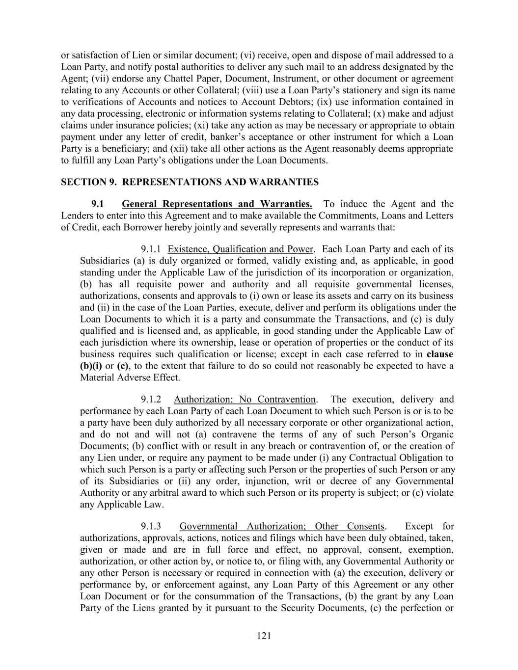 or satisfaction of Lien or similar document; (vi) receive, open and dispose of mail addressed to a Loan Party, and notify postal authorities to deliver any such mail to an address designated by the Agent; (vii) endorse any Chattel Paper, Document, Instrument, or other document or agreement relating to any Accounts or other Collateral; (viii) use a Loan Party’s stationery and sign its name to verifications of Accounts and notices to Account Debtors; (ix) use information contained in any data processing, electronic or information systems relating to Collateral; (x) make and adjust claims under insurance policies; (xi) take any action as may be necessary or appropriate to obtain payment under any letter of credit, banker’s acceptance or other instrument for which a Loan Party is a beneficiary; and (xii) take all other actions as the Agent reasonably deems appropriate to fulfill any Loan Party’s obligations under the Loan Documents. SECTION 9. REPRESENTATIONS AND WARRANTIES 9.1 General Representations and Warranties. To induce the Agent and the Lenders to enter into this Agreement and to make available the Commitments, Loans and Letters of Credit, each Borrower hereby jointly and severally represents and warrants that: 9.1.1 Existence, Qualification and Power. Each Loan Party and each of its Subsidiaries (a) is duly organized or formed, validly existing and, as applicable, in good standing under the Applicable Law of the jurisdiction of its incorporation or organization, (b) has all requisite power and authority and all requisite governmental licenses, authorizations, consents and approvals to (i) own or lease its assets and carry on its business and (ii) in the case of the Loan Parties, execute, deliver and perform its obligations under the Loan Documents to which it is a party and consummate the Transactions, and (c) is duly qualified and is licensed and, as applicable, in good standing under the Applicable Law of each jurisdiction where its ownership, lease or operation of properties or the conduct of its business requires such qualification or license; except in each case referred to in clause (b)(i) or (c), to the extent that failure to do so could not reasonably be expected to have a Material Adverse Effect. 9.1.2 Authorization; No Contravention. The execution, delivery and performance by each Loan Party of each Loan Document to which such Person is or is to be a party have been duly authorized by all necessary corporate or other organizational action, and do not and will not (a) contravene the terms of any of such Person’s Organic Documents; (b) conflict with or result in any breach or contravention of, or the creation of any Lien under, or require any payment to be made under (i) any Contractual Obligation to which such Person is a party or affecting such Person or the properties of such Person or any of its Subsidiaries or (ii) any order, injunction, writ or decree of any Governmental Authority or any arbitral award to which such Person or its property is subject; or (c) violate any Applicable Law. 9.1.3 Governmental Authorization; Other Consents. Except for authorizations, approvals, actions, notices and filings which have been duly obtained, taken, given or made and are in full force and effect, no approval, consent, exemption, authorization, or other action by, or notice to, or filing with, any Governmental Authority or any other Person is necessary or required in connection with (a) the execution, delivery or performance by, or enforcement against, any Loan Party of this Agreement or any other Loan Document or for the consummation of the Transactions, (b) the grant by any Loan Party of the Liens granted by it pursuant to the Security Documents, (c) the perfection or 121