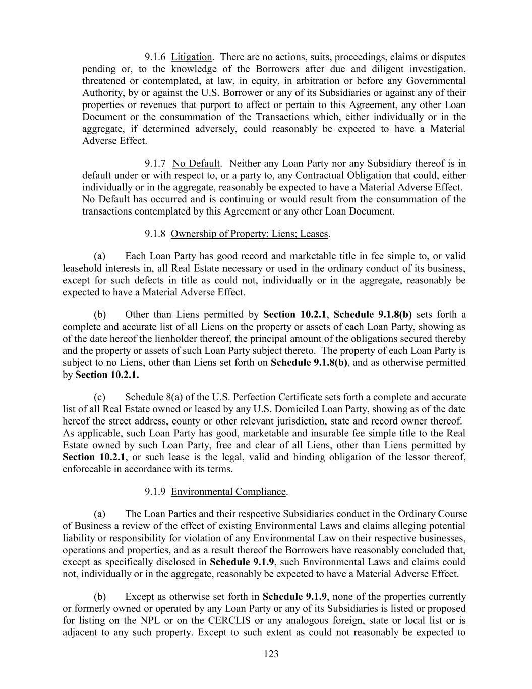 9.1.6 Litigation. There are no actions, suits, proceedings, claims or disputes pending or, to the knowledge of the Borrowers after due and diligent investigation, threatened or contemplated, at law, in equity, in arbitration or before any Governmental Authority, by or against the U.S. Borrower or any of its Subsidiaries or against any of their properties or revenues that purport to affect or pertain to this Agreement, any other Loan Document or the consummation of the Transactions which, either individually or in the aggregate, if determined adversely, could reasonably be expected to have a Material Adverse Effect. 9.1.7 No Default. Neither any Loan Party nor any Subsidiary thereof is in default under or with respect to, or a party to, any Contractual Obligation that could, either individually or in the aggregate, reasonably be expected to have a Material Adverse Effect. No Default has occurred and is continuing or would result from the consummation of the transactions contemplated by this Agreement or any other Loan Document. 9.1.8 Ownership of Property; Liens; Leases. (a) Each Loan Party has good record and marketable title in fee simple to, or valid leasehold interests in, all Real Estate necessary or used in the ordinary conduct of its business, except for such defects in title as could not, individually or in the aggregate, reasonably be expected to have a Material Adverse Effect. (b) Other than Liens permitted by Section 10.2.1, Schedule 9.1.8(b) sets forth a complete and accurate list of all Liens on the property or assets of each Loan Party, showing as of the date hereof the lienholder thereof, the principal amount of the obligations secured thereby and the property or assets of such Loan Party subject thereto. The property of each Loan Party is subject to no Liens, other than Liens set forth on Schedule 9.1.8(b), and as otherwise permitted by Section 10.2.1. (c) Schedule 8(a) of the U.S. Perfection Certificate sets forth a complete and accurate list of all Real Estate owned or leased by any U.S. Domiciled Loan Party, showing as of the date hereof the street address, county or other relevant jurisdiction, state and record owner thereof. As applicable, such Loan Party has good, marketable and insurable fee simple title to the Real Estate owned by such Loan Party, free and clear of all Liens, other than Liens permitted by Section 10.2.1, or such lease is the legal, valid and binding obligation of the lessor thereof, enforceable in accordance with its terms. 9.1.9 Environmental Compliance. (a) The Loan Parties and their respective Subsidiaries conduct in the Ordinary Course of Business a review of the effect of existing Environmental Laws and claims alleging potential liability or responsibility for violation of any Environmental Law on their respective businesses, operations and properties, and as a result thereof the Borrowers have reasonably concluded that, except as specifically disclosed in Schedule 9.1.9, such Environmental Laws and claims could not, individually or in the aggregate, reasonably be expected to have a Material Adverse Effect. (b) Except as otherwise set forth in Schedule 9.1.9, none of the properties currently or formerly owned or operated by any Loan Party or any of its Subsidiaries is listed or proposed for listing on the NPL or on the CERCLIS or any analogous foreign, state or local list or is adjacent to any such property. Except to such extent as could not reasonably be expected to 123