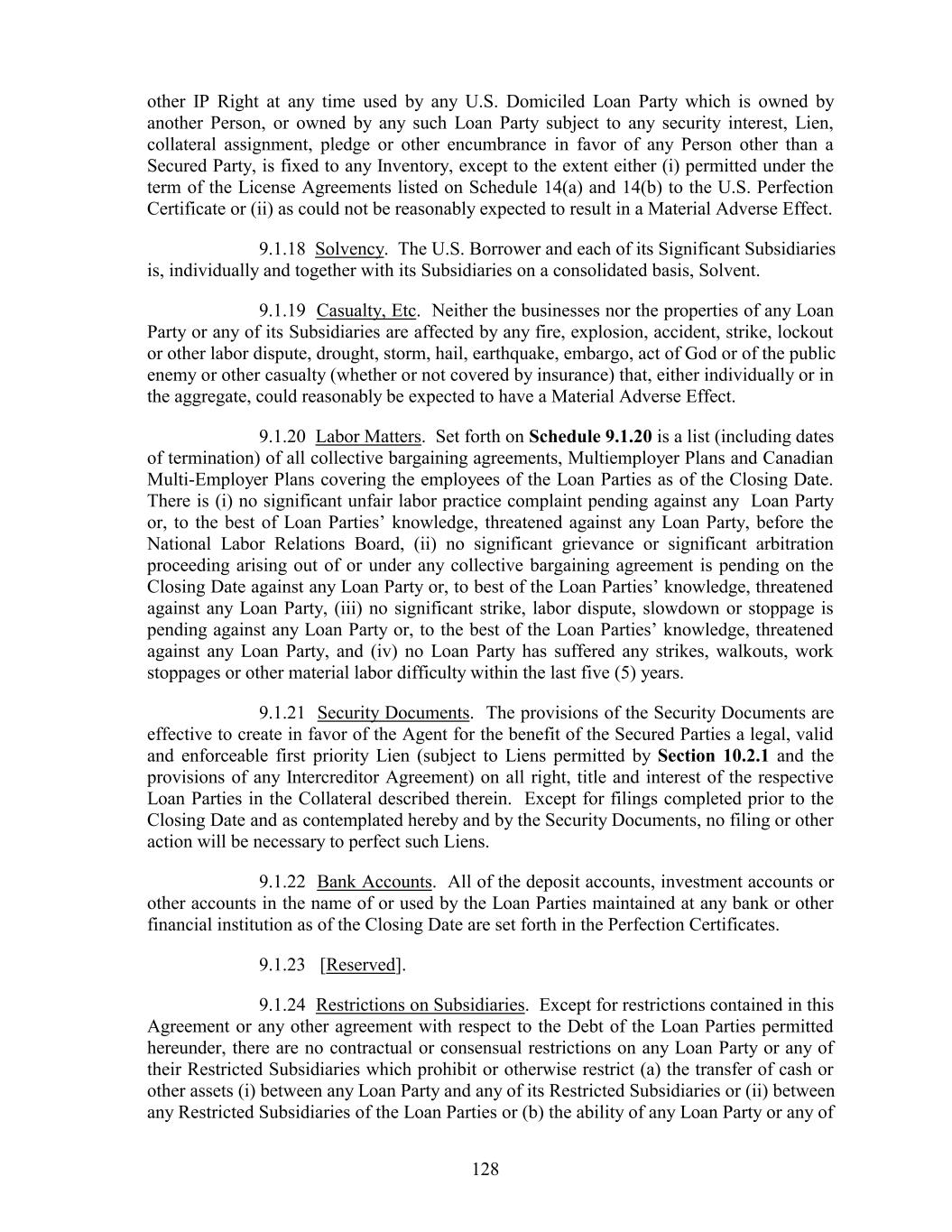 other IP Right at any time used by any U.S. Domiciled Loan Party which is owned by another Person, or owned by any such Loan Party subject to any security interest, Lien, collateral assignment, pledge or other encumbrance in favor of any Person other than a Secured Party, is fixed to any Inventory, except to the extent either (i) permitted under the term of the License Agreements listed on Schedule 14(a) and 14(b) to the U.S. Perfection Certificate or (ii) as could not be reasonably expected to result in a Material Adverse Effect. 9.1.18 Solvency. The U.S. Borrower and each of its Significant Subsidiaries is, individually and together with its Subsidiaries on a consolidated basis, Solvent. 9.1.19 Casualty, Etc. Neither the businesses nor the properties of any Loan Party or any of its Subsidiaries are affected by any fire, explosion, accident, strike, lockout or other labor dispute, drought, storm, hail, earthquake, embargo, act of God or of the public enemy or other casualty (whether or not covered by insurance) that, either individually or in the aggregate, could reasonably be expected to have a Material Adverse Effect. 9.1.20 Labor Matters. Set forth on Schedule 9.1.20 is a list (including dates of termination) of all collective bargaining agreements, Multiemployer Plans and Canadian Multi-Employer Plans covering the employees of the Loan Parties as of the Closing Date. There is (i) no significant unfair labor practice complaint pending against any Loan Party or, to the best of Loan Parties’ knowledge, threatened against any Loan Party, before the National Labor Relations Board, (ii) no significant grievance or significant arbitration proceeding arising out of or under any collective bargaining agreement is pending on the Closing Date against any Loan Party or, to best of the Loan Parties’ knowledge, threatened against any Loan Party, (iii) no significant strike, labor dispute, slowdown or stoppage is pending against any Loan Party or, to the best of the Loan Parties’ knowledge, threatened against any Loan Party, and (iv) no Loan Party has suffered any strikes, walkouts, work stoppages or other material labor difficulty within the last five (5) years. 9.1.21 Security Documents. The provisions of the Security Documents are effective to create in favor of the Agent for the benefit of the Secured Parties a legal, valid and enforceable first priority Lien (subject to Liens permitted by Section 10.2.1 and the provisions of any Intercreditor Agreement) on all right, title and interest of the respective Loan Parties in the Collateral described therein. Except for filings completed prior to the Closing Date and as contemplated hereby and by the Security Documents, no filing or other action will be necessary to perfect such Liens. 9.1.22 Bank Accounts. All of the deposit accounts, investment accounts or other accounts in the name of or used by the Loan Parties maintained at any bank or other financial institution as of the Closing Date are set forth in the Perfection Certificates. 9.1.23 [Reserved]. 9.1.24 Restrictions on Subsidiaries. Except for restrictions contained in this Agreement or any other agreement with respect to the Debt of the Loan Parties permitted hereunder, there are no contractual or consensual restrictions on any Loan Party or any of their Restricted Subsidiaries which prohibit or otherwise restrict (a) the transfer of cash or other assets (i) between any Loan Party and any of its Restricted Subsidiaries or (ii) between any Restricted Subsidiaries of the Loan Parties or (b) the ability of any Loan Party or any of 128