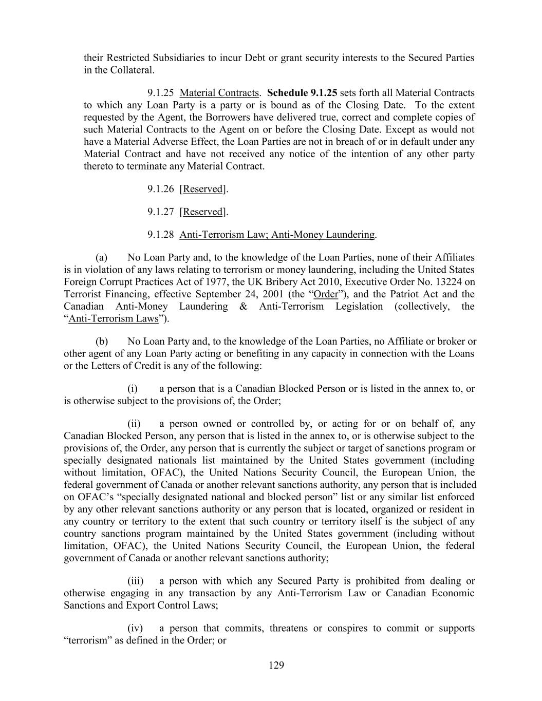 their Restricted Subsidiaries to incur Debt or grant security interests to the Secured Parties in the Collateral. 9.1.25 Material Contracts. Schedule 9.1.25 sets forth all Material Contracts to which any Loan Party is a party or is bound as of the Closing Date. To the extent requested by the Agent, the Borrowers have delivered true, correct and complete copies of such Material Contracts to the Agent on or before the Closing Date. Except as would not have a Material Adverse Effect, the Loan Parties are not in breach of or in default under any Material Contract and have not received any notice of the intention of any other party thereto to terminate any Material Contract. 9.1.26 [Reserved]. 9.1.27 [Reserved]. 9.1.28 Anti-Terrorism Law; Anti-Money Laundering. (a) No Loan Party and, to the knowledge of the Loan Parties, none of their Affiliates is in violation of any laws relating to terrorism or money laundering, including the United States Foreign Corrupt Practices Act of 1977, the UK Bribery Act 2010, Executive Order No. 13224 on Terrorist Financing, effective September 24, 2001 (the “Order”), and the Patriot Act and the Canadian Anti-Money Laundering & Anti-Terrorism Legislation (collectively, the “Anti-Terrorism Laws”). (b) No Loan Party and, to the knowledge of the Loan Parties, no Affiliate or broker or other agent of any Loan Party acting or benefiting in any capacity in connection with the Loans or the Letters of Credit is any of the following: (i) a person that is a Canadian Blocked Person or is listed in the annex to, or is otherwise subject to the provisions of, the Order; (ii) a person owned or controlled by, or acting for or on behalf of, any Canadian Blocked Person, any person that is listed in the annex to, or is otherwise subject to the provisions of, the Order, any person that is currently the subject or target of sanctions program or specially designated nationals list maintained by the United States government (including without limitation, OFAC), the United Nations Security Council, the European Union, the federal government of Canada or another relevant sanctions authority, any person that is included on OFAC’s “specially designated national and blocked person” list or any similar list enforced by any other relevant sanctions authority or any person that is located, organized or resident in any country or territory to the extent that such country or territory itself is the subject of any country sanctions program maintained by the United States government (including without limitation, OFAC), the United Nations Security Council, the European Union, the federal government of Canada or another relevant sanctions authority; (iii) a person with which any Secured Party is prohibited from dealing or otherwise engaging in any transaction by any Anti-Terrorism Law or Canadian Economic Sanctions and Export Control Laws; (iv) a person that commits, threatens or conspires to commit or supports “terrorism” as defined in the Order; or 129