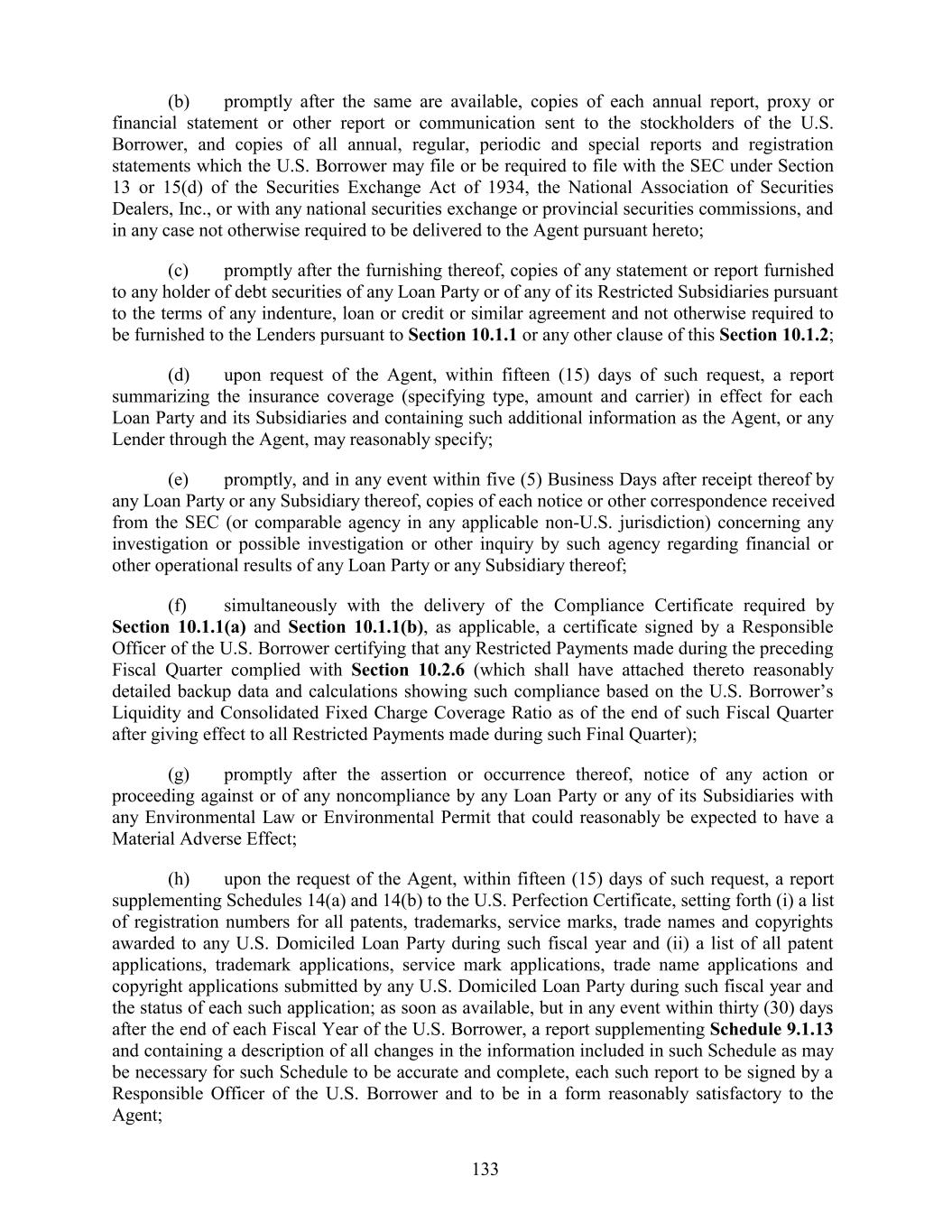 (b) promptly after the same are available, copies of each annual report, proxy or financial statement or other report or communication sent to the stockholders of the U.S. Borrower, and copies of all annual, regular, periodic and special reports and registration statements which the U.S. Borrower may file or be required to file with the SEC under Section 13 or 15(d) of the Securities Exchange Act of 1934, the National Association of Securities Dealers, Inc., or with any national securities exchange or provincial securities commissions, and in any case not otherwise required to be delivered to the Agent pursuant hereto; (c) promptly after the furnishing thereof, copies of any statement or report furnished to any holder of debt securities of any Loan Party or of any of its Restricted Subsidiaries pursuant to the terms of any indenture, loan or credit or similar agreement and not otherwise required to be furnished to the Lenders pursuant to Section 10.1.1 or any other clause of this Section 10.1.2; (d) upon request of the Agent, within fifteen (15) days of such request, a report summarizing the insurance coverage (specifying type, amount and carrier) in effect for each Loan Party and its Subsidiaries and containing such additional information as the Agent, or any Lender through the Agent, may reasonably specify; (e) promptly, and in any event within five (5) Business Days after receipt thereof by any Loan Party or any Subsidiary thereof, copies of each notice or other correspondence received from the SEC (or comparable agency in any applicable non-U.S. jurisdiction) concerning any investigation or possible investigation or other inquiry by such agency regarding financial or other operational results of any Loan Party or any Subsidiary thereof; (f) simultaneously with the delivery of the Compliance Certificate required by Section 10.1.1(a) and Section 10.1.1(b), as applicable, a certificate signed by a Responsible Officer of the U.S. Borrower certifying that any Restricted Payments made during the preceding Fiscal Quarter complied with Section 10.2.6 (which shall have attached thereto reasonably detailed backup data and calculations showing such compliance based on the U.S. Borrower’s Liquidity and Consolidated Fixed Charge Coverage Ratio as of the end of such Fiscal Quarter after giving effect to all Restricted Payments made during such Final Quarter); (g) promptly after the assertion or occurrence thereof, notice of any action or proceeding against or of any noncompliance by any Loan Party or any of its Subsidiaries with any Environmental Law or Environmental Permit that could reasonably be expected to have a Material Adverse Effect; (h) upon the request of the Agent, within fifteen (15) days of such request, a report supplementing Schedules 14(a) and 14(b) to the U.S. Perfection Certificate, setting forth (i) a list of registration numbers for all patents, trademarks, service marks, trade names and copyrights awarded to any U.S. Domiciled Loan Party during such fiscal year and (ii) a list of all patent applications, trademark applications, service mark applications, trade name applications and copyright applications submitted by any U.S. Domiciled Loan Party during such fiscal year and the status of each such application; as soon as available, but in any event within thirty (30) days after the end of each Fiscal Year of the U.S. Borrower, a report supplementing Schedule 9.1.13 and containing a description of all changes in the information included in such Schedule as may be necessary for such Schedule to be accurate and complete, each such report to be signed by a Responsible Officer of the U.S. Borrower and to be in a form reasonably satisfactory to the Agent; 133
