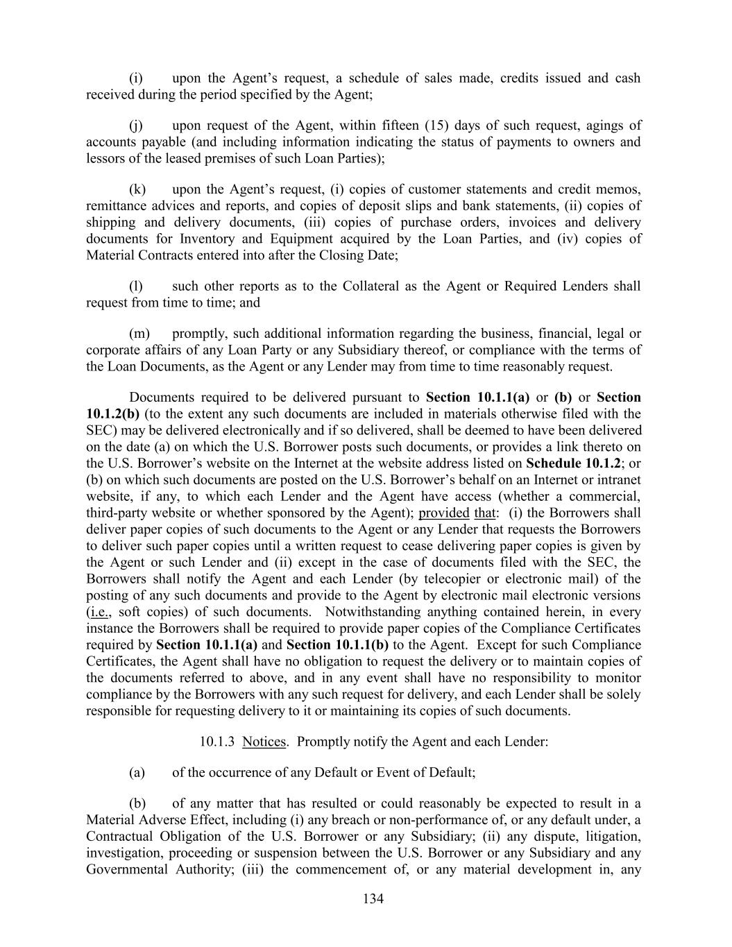 (i) upon the Agent’s request, a schedule of sales made, credits issued and cash received during the period specified by the Agent; (j) upon request of the Agent, within fifteen (15) days of such request, agings of accounts payable (and including information indicating the status of payments to owners and lessors of the leased premises of such Loan Parties); (k) upon the Agent’s request, (i) copies of customer statements and credit memos, remittance advices and reports, and copies of deposit slips and bank statements, (ii) copies of shipping and delivery documents, (iii) copies of purchase orders, invoices and delivery documents for Inventory and Equipment acquired by the Loan Parties, and (iv) copies of Material Contracts entered into after the Closing Date; (l) such other reports as to the Collateral as the Agent or Required Lenders shall request from time to time; and (m) promptly, such additional information regarding the business, financial, legal or corporate affairs of any Loan Party or any Subsidiary thereof, or compliance with the terms of the Loan Documents, as the Agent or any Lender may from time to time reasonably request. Documents required to be delivered pursuant to Section 10.1.1(a) or (b) or Section 10.1.2(b) (to the extent any such documents are included in materials otherwise filed with the SEC) may be delivered electronically and if so delivered, shall be deemed to have been delivered on the date (a) on which the U.S. Borrower posts such documents, or provides a link thereto on the U.S. Borrower’s website on the Internet at the website address listed on Schedule 10.1.2; or (b) on which such documents are posted on the U.S. Borrower’s behalf on an Internet or intranet website, if any, to which each Lender and the Agent have access (whether a commercial, third-party website or whether sponsored by the Agent); provided that: (i) the Borrowers shall deliver paper copies of such documents to the Agent or any Lender that requests the Borrowers to deliver such paper copies until a written request to cease delivering paper copies is given by the Agent or such Lender and (ii) except in the case of documents filed with the SEC, the Borrowers shall notify the Agent and each Lender (by telecopier or electronic mail) of the posting of any such documents and provide to the Agent by electronic mail electronic versions (i.e., soft copies) of such documents. Notwithstanding anything contained herein, in every instance the Borrowers shall be required to provide paper copies of the Compliance Certificates required by Section 10.1.1(a) and Section 10.1.1(b) to the Agent. Except for such Compliance Certificates, the Agent shall have no obligation to request the delivery or to maintain copies of the documents referred to above, and in any event shall have no responsibility to monitor compliance by the Borrowers with any such request for delivery, and each Lender shall be solely responsible for requesting delivery to it or maintaining its copies of such documents. 10.1.3 Notices. Promptly notify the Agent and each Lender: (a) of the occurrence of any Default or Event of Default; (b) of any matter that has resulted or could reasonably be expected to result in a Material Adverse Effect, including (i) any breach or non-performance of, or any default under, a Contractual Obligation of the U.S. Borrower or any Subsidiary; (ii) any dispute, litigation, investigation, proceeding or suspension between the U.S. Borrower or any Subsidiary and any Governmental Authority; (iii) the commencement of, or any material development in, any 134