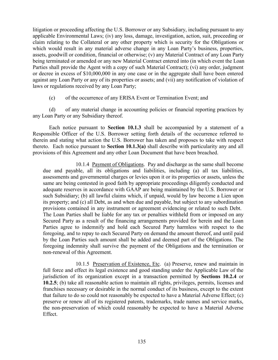 litigation or proceeding affecting the U.S. Borrower or any Subsidiary, including pursuant to any applicable Environmental Laws; (iv) any loss, damage, investigation, action, suit, proceeding or claim relating to the Collateral or any other property which is security for the Obligations or which would result in any material adverse change in any Loan Party’s business, properties, assets, goodwill or condition, financial or otherwise; (v) any Material Contract of any Loan Party being terminated or amended or any new Material Contract entered into (in which event the Loan Parties shall provide the Agent with a copy of such Material Contract); (vi) any order, judgment or decree in excess of $10,000,000 in any one case or in the aggregate shall have been entered against any Loan Party or any of its properties or assets; and (vii) any notification of violation of laws or regulations received by any Loan Party; (c) of the occurrence of any ERISA Event or Termination Event; and (d) of any material change in accounting policies or financial reporting practices by any Loan Party or any Subsidiary thereof. Each notice pursuant to Section 10.1.3 shall be accompanied by a statement of a Responsible Officer of the U.S. Borrower setting forth details of the occurrence referred to therein and stating what action the U.S. Borrower has taken and proposes to take with respect thereto. Each notice pursuant to Section 10.1.3(a) shall describe with particularity any and all provisions of this Agreement and any other Loan Document that have been breached. 10.1.4 Payment of Obligations. Pay and discharge as the same shall become due and payable, all its obligations and liabilities, including (a) all tax liabilities, assessments and governmental charges or levies upon it or its properties or assets, unless the same are being contested in good faith by appropriate proceedings diligently conducted and adequate reserves in accordance with GAAP are being maintained by the U.S. Borrower or such Subsidiary; (b) all lawful claims which, if unpaid, would by law become a Lien upon its property; and (c) all Debt, as and when due and payable, but subject to any subordination provisions contained in any instrument or agreement evidencing or related to such Debt. The Loan Parties shall be liable for any tax or penalties withheld from or imposed on any Secured Party as a result of the financing arrangements provided for herein and the Loan Parties agree to indemnify and hold each Secured Party harmless with respect to the foregoing, and to repay to each Secured Party on demand the amount thereof, and until paid by the Loan Parties such amount shall be added and deemed part of the Obligations. The foregoing indemnity shall survive the payment of the Obligations and the termination or non-renewal of this Agreement. 10.1.5 Preservation of Existence, Etc. (a) Preserve, renew and maintain in full force and effect its legal existence and good standing under the Applicable Law of the jurisdiction of its organization except in a transaction permitted by Sections 10.2.4 or 10.2.5; (b) take all reasonable action to maintain all rights, privileges, permits, licenses and franchises necessary or desirable in the normal conduct of its business, except to the extent that failure to do so could not reasonably be expected to have a Material Adverse Effect; (c) preserve or renew all of its registered patents, trademarks, trade names and service marks, the non-preservation of which could reasonably be expected to have a Material Adverse Effect. 135