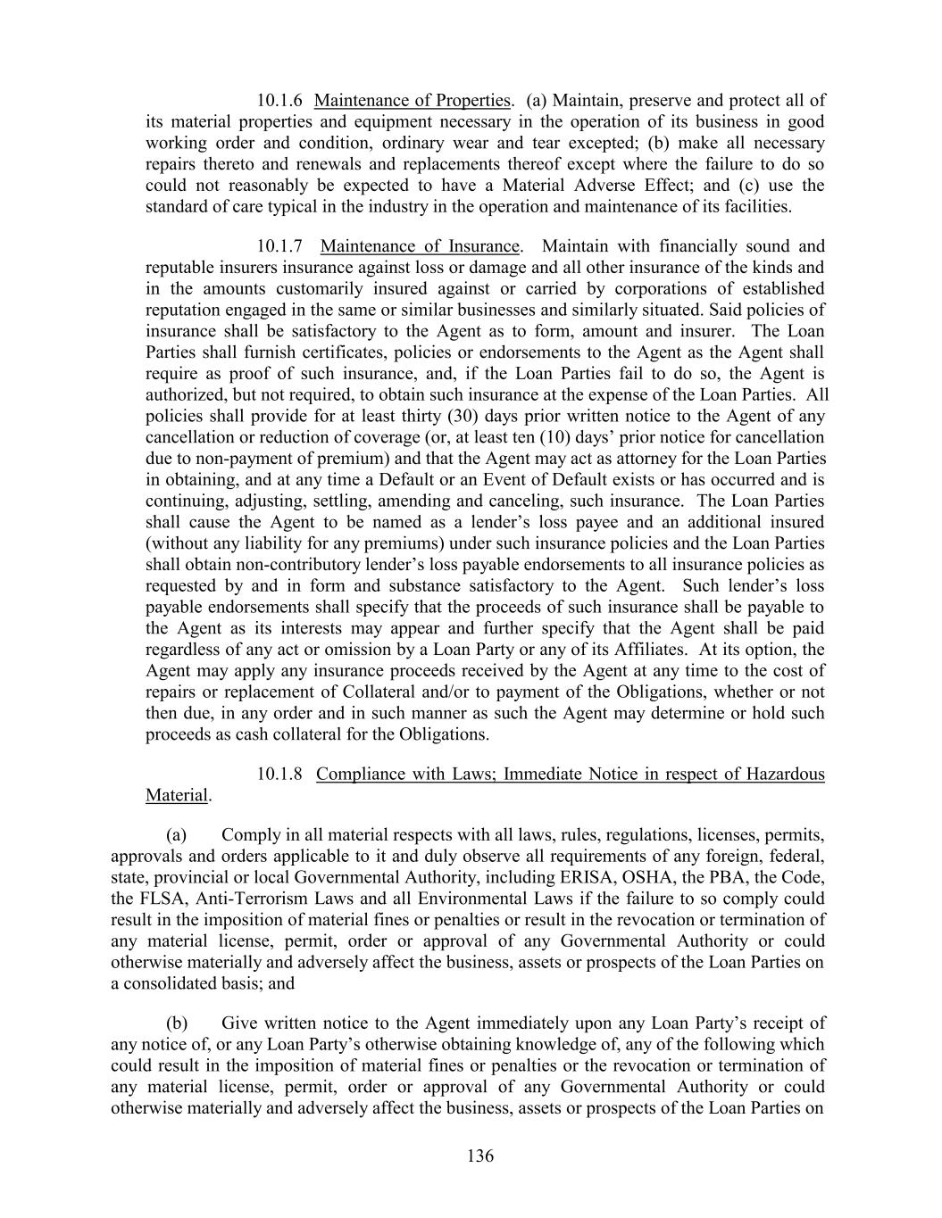 10.1.6 Maintenance of Properties. (a) Maintain, preserve and protect all of its material properties and equipment necessary in the operation of its business in good working order and condition, ordinary wear and tear excepted; (b) make all necessary repairs thereto and renewals and replacements thereof except where the failure to do so could not reasonably be expected to have a Material Adverse Effect; and (c) use the standard of care typical in the industry in the operation and maintenance of its facilities. 10.1.7 Maintenance of Insurance. Maintain with financially sound and reputable insurers insurance against loss or damage and all other insurance of the kinds and in the amounts customarily insured against or carried by corporations of established reputation engaged in the same or similar businesses and similarly situated. Said policies of insurance shall be satisfactory to the Agent as to form, amount and insurer. The Loan Parties shall furnish certificates, policies or endorsements to the Agent as the Agent shall require as proof of such insurance, and, if the Loan Parties fail to do so, the Agent is authorized, but not required, to obtain such insurance at the expense of the Loan Parties. All policies shall provide for at least thirty (30) days prior written notice to the Agent of any cancellation or reduction of coverage (or, at least ten (10) days’ prior notice for cancellation due to non-payment of premium) and that the Agent may act as attorney for the Loan Parties in obtaining, and at any time a Default or an Event of Default exists or has occurred and is continuing, adjusting, settling, amending and canceling, such insurance. The Loan Parties shall cause the Agent to be named as a lender’s loss payee and an additional insured (without any liability for any premiums) under such insurance policies and the Loan Parties shall obtain non-contributory lender’s loss payable endorsements to all insurance policies as requested by and in form and substance satisfactory to the Agent. Such lender’s loss payable endorsements shall specify that the proceeds of such insurance shall be payable to the Agent as its interests may appear and further specify that the Agent shall be paid regardless of any act or omission by a Loan Party or any of its Affiliates. At its option, the Agent may apply any insurance proceeds received by the Agent at any time to the cost of repairs or replacement of Collateral and/or to payment of the Obligations, whether or not then due, in any order and in such manner as such the Agent may determine or hold such proceeds as cash collateral for the Obligations. 10.1.8 Compliance with Laws; Immediate Notice in respect of Hazardous Material. (a) Comply in all material respects with all laws, rules, regulations, licenses, permits, approvals and orders applicable to it and duly observe all requirements of any foreign, federal, state, provincial or local Governmental Authority, including ERISA, OSHA, the PBA, the Code, the FLSA, Anti-Terrorism Laws and all Environmental Laws if the failure to so comply could result in the imposition of material fines or penalties or result in the revocation or termination of any material license, permit, order or approval of any Governmental Authority or could otherwise materially and adversely affect the business, assets or prospects of the Loan Parties on a consolidated basis; and (b) Give written notice to the Agent immediately upon any Loan Party’s receipt of any notice of, or any Loan Party’s otherwise obtaining knowledge of, any of the following which could result in the imposition of material fines or penalties or the revocation or termination of any material license, permit, order or approval of any Governmental Authority or could otherwise materially and adversely affect the business, assets or prospects of the Loan Parties on 136
