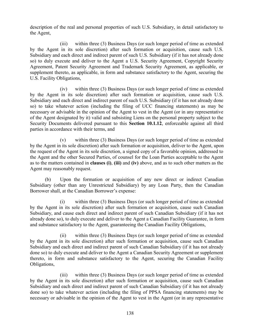 description of the real and personal properties of such U.S. Subsidiary, in detail satisfactory to the Agent, (iii) within three (3) Business Days (or such longer period of time as extended by the Agent in its sole discretion) after such formation or acquisition, cause such U.S. Subsidiary and each direct and indirect parent of such U.S. Subsidiary (if it has not already done so) to duly execute and deliver to the Agent a U.S. Security Agreement, Copyright Security Agreement, Patent Security Agreement and Trademark Security Agreement, as applicable, or supplement thereto, as applicable, in form and substance satisfactory to the Agent, securing the U.S. Facility Obligations, (iv) within three (3) Business Days (or such longer period of time as extended by the Agent in its sole discretion) after such formation or acquisition, cause such U.S. Subsidiary and each direct and indirect parent of such U.S. Subsidiary (if it has not already done so) to take whatever action (including the filing of UCC financing statements) as may be necessary or advisable in the opinion of the Agent to vest in the Agent (or in any representative of the Agent designated by it) valid and subsisting Liens on the personal property subject to the Security Documents delivered pursuant to this Section 10.1.12, enforceable against all third parties in accordance with their terms, and (v) within three (3) Business Days (or such longer period of time as extended by the Agent in its sole discretion) after such formation or acquisition, deliver to the Agent, upon the request of the Agent in its sole discretion, a signed copy of a favorable opinion, addressed to the Agent and the other Secured Parties, of counsel for the Loan Parties acceptable to the Agent as to the matters contained in clauses (i), (iii) and (iv) above, and as to such other matters as the Agent may reasonably request. (b) Upon the formation or acquisition of any new direct or indirect Canadian Subsidiary (other than any Unrestricted Subsidiary) by any Loan Party, then the Canadian Borrower shall, at the Canadian Borrower’s expense: (i) within three (3) Business Days (or such longer period of time as extended by the Agent in its sole discretion) after such formation or acquisition, cause such Canadian Subsidiary, and cause each direct and indirect parent of such Canadian Subsidiary (if it has not already done so), to duly execute and deliver to the Agent a Canadian Facility Guarantee, in form and substance satisfactory to the Agent, guaranteeing the Canadian Facility Obligations, (ii) within three (3) Business Days (or such longer period of time as extended by the Agent in its sole discretion) after such formation or acquisition, cause such Canadian Subsidiary and each direct and indirect parent of such Canadian Subsidiary (if it has not already done so) to duly execute and deliver to the Agent a Canadian Security Agreement or supplement thereto, in form and substance satisfactory to the Agent, securing the Canadian Facility Obligations, (iii) within three (3) Business Days (or such longer period of time as extended by the Agent in its sole discretion) after such formation or acquisition, cause such Canadian Subsidiary and each direct and indirect parent of such Canadian Subsidiary (if it has not already done so) to take whatever action (including the filing of PPSA financing statements) may be necessary or advisable in the opinion of the Agent to vest in the Agent (or in any representative 138