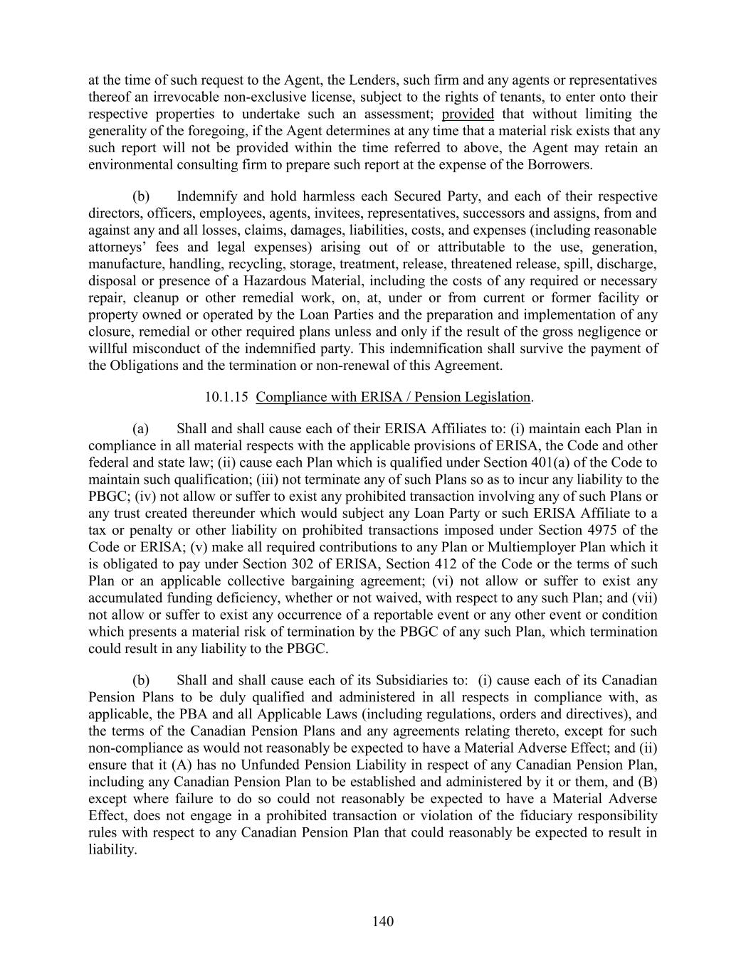 at the time of such request to the Agent, the Lenders, such firm and any agents or representatives thereof an irrevocable non-exclusive license, subject to the rights of tenants, to enter onto their respective properties to undertake such an assessment; provided that without limiting the generality of the foregoing, if the Agent determines at any time that a material risk exists that any such report will not be provided within the time referred to above, the Agent may retain an environmental consulting firm to prepare such report at the expense of the Borrowers. (b) Indemnify and hold harmless each Secured Party, and each of their respective directors, officers, employees, agents, invitees, representatives, successors and assigns, from and against any and all losses, claims, damages, liabilities, costs, and expenses (including reasonable attorneys’ fees and legal expenses) arising out of or attributable to the use, generation, manufacture, handling, recycling, storage, treatment, release, threatened release, spill, discharge, disposal or presence of a Hazardous Material, including the costs of any required or necessary repair, cleanup or other remedial work, on, at, under or from current or former facility or property owned or operated by the Loan Parties and the preparation and implementation of any closure, remedial or other required plans unless and only if the result of the gross negligence or willful misconduct of the indemnified party. This indemnification shall survive the payment of the Obligations and the termination or non-renewal of this Agreement. 10.1.15 Compliance with ERISA / Pension Legislation. (a) Shall and shall cause each of their ERISA Affiliates to: (i) maintain each Plan in compliance in all material respects with the applicable provisions of ERISA, the Code and other federal and state law; (ii) cause each Plan which is qualified under Section 401(a) of the Code to maintain such qualification; (iii) not terminate any of such Plans so as to incur any liability to the PBGC; (iv) not allow or suffer to exist any prohibited transaction involving any of such Plans or any trust created thereunder which would subject any Loan Party or such ERISA Affiliate to a tax or penalty or other liability on prohibited transactions imposed under Section 4975 of the Code or ERISA; (v) make all required contributions to any Plan or Multiemployer Plan which it is obligated to pay under Section 302 of ERISA, Section 412 of the Code or the terms of such Plan or an applicable collective bargaining agreement; (vi) not allow or suffer to exist any accumulated funding deficiency, whether or not waived, with respect to any such Plan; and (vii) not allow or suffer to exist any occurrence of a reportable event or any other event or condition which presents a material risk of termination by the PBGC of any such Plan, which termination could result in any liability to the PBGC. (b) Shall and shall cause each of its Subsidiaries to: (i) cause each of its Canadian Pension Plans to be duly qualified and administered in all respects in compliance with, as applicable, the PBA and all Applicable Laws (including regulations, orders and directives), and the terms of the Canadian Pension Plans and any agreements relating thereto, except for such non-compliance as would not reasonably be expected to have a Material Adverse Effect; and (ii) ensure that it (A) has no Unfunded Pension Liability in respect of any Canadian Pension Plan, including any Canadian Pension Plan to be established and administered by it or them, and (B) except where failure to do so could not reasonably be expected to have a Material Adverse Effect, does not engage in a prohibited transaction or violation of the fiduciary responsibility rules with respect to any Canadian Pension Plan that could reasonably be expected to result in liability. 140