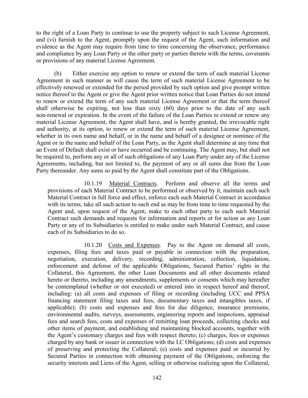 to the right of a Loan Party to continue to use the property subject to such License Agreement, and (vi) furnish to the Agent, promptly upon the request of the Agent, such information and evidence as the Agent may require from time to time concerning the observance, performance and compliance by any Loan Party or the other party or parties thereto with the terms, covenants or provisions of any material License Agreement. (b) Either exercise any option to renew or extend the term of each material License Agreement in such manner as will cause the term of such material License Agreement to be effectively renewed or extended for the period provided by such option and give prompt written notice thereof to the Agent or give the Agent prior written notice that Loan Parties do not intend to renew or extend the term of any such material License Agreement or that the term thereof shall otherwise be expiring, not less than sixty (60) days prior to the date of any such non-renewal or expiration. In the event of the failure of the Loan Parties to extend or renew any material License Agreement, the Agent shall have, and is hereby granted, the irrevocable right and authority, at its option, to renew or extend the term of such material License Agreement, whether in its own name and behalf, or in the name and behalf of a designee or nominee of the Agent or in the name and behalf of the Loan Party, as the Agent shall determine at any time that an Event of Default shall exist or have occurred and be continuing. The Agent may, but shall not be required to, perform any or all of such obligations of any Loan Party under any of the License Agreements, including, but not limited to, the payment of any or all sums due from the Loan Party thereunder. Any sums so paid by the Agent shall constitute part of the Obligations. 10.1.19 Material Contracts. Perform and observe all the terms and provisions of each Material Contract to be performed or observed by it, maintain each such Material Contract in full force and effect, enforce each such Material Contract in accordance with its terms, take all such action to such end as may be from time to time requested by the Agent and, upon request of the Agent, make to each other party to each such Material Contract such demands and requests for information and reports or for action as any Loan Party or any of its Subsidiaries is entitled to make under such Material Contract, and cause each of its Subsidiaries to do so. 10.1.20 Costs and Expenses. Pay to the Agent on demand all costs, expenses, filing fees and taxes paid or payable in connection with the preparation, negotiation, execution, delivery, recording, administration, collection, liquidation, enforcement and defense of the applicable Obligations, Secured Parties’ rights in the Collateral, this Agreement, the other Loan Documents and all other documents related hereto or thereto, including any amendments, supplements or consents which may hereafter be contemplated (whether or not executed) or entered into in respect hereof and thereof, including: (a) all costs and expenses of filing or recording (including UCC and PPSA financing statement filing taxes and fees, documentary taxes and intangibles taxes, if applicable); (b) costs and expenses and fees for due diligence, insurance premiums, environmental audits, surveys, assessments, engineering reports and inspections, appraisal fees and search fees, costs and expenses of remitting loan proceeds, collecting checks and other items of payment, and establishing and maintaining blocked accounts, together with the Agent’s customary charges and fees with respect thereto; (c) charges, fees or expenses charged by any bank or issuer in connection with the LC Obligations; (d) costs and expenses of preserving and protecting the Collateral; (e) costs and expenses paid or incurred by Secured Parties in connection with obtaining payment of the Obligations, enforcing the security interests and Liens of the Agent, selling or otherwise realizing upon the Collateral, 142