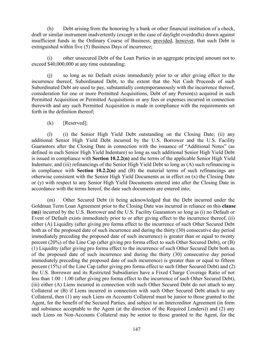 (h) Debt arising from the honoring by a bank or other financial institution of a check, draft or similar instrument inadvertently (except in the case of daylight overdrafts) drawn against insufficient funds in the Ordinary Course of Business; provided, however, that such Debt is extinguished within five (5) Business Days of incurrence; (i) other unsecured Debt of the Loan Parties in an aggregate principal amount not to exceed $40,000,000 at any time outstanding; (j) so long as no Default exists immediately prior to or after giving effect to the incurrence thereof, Subordinated Debt, to the extent that the Net Cash Proceeds of such Subordinated Debt are used to pay, substantially contemporaneously with the incurrence thereof, consideration for one or more Permitted Acquisitions, Debt of any Person(s) acquired in such Permitted Acquisition or Permitted Acquisitions or any fees or expenses incurred in connection therewith and any such Permitted Acquisition is made in compliance with the requirements set forth in the definition thereof; (k) [Reserved]; (l) (i) the Senior High Yield Debt outstanding on the Closing Date; (ii) any additional Senior High Yield Debt incurred by the U.S. Borrower and the U.S. Facility Guarantors after the Closing Date in connection with the issuance of “Additional Notes” (as defined in each Senior High Yield Indenture) so long as such additional Senior High Yield Debt is issued in compliance with Section 10.2.2(n) and the terms of the applicable Senior High Yield Indenture; and (iii) refinancings of the Senior High Yield Debt so long as (A) such refinancing is in compliance with Section 10.2.2(n) and (B) the material terms of such refinancings are otherwise consistent with the Senior High Yield Documents as in effect on (x) the Closing Date or (y) with respect to any Senior High Yield Documents entered into after the Closing Date in accordance with the terms hereof, the date such documents are entered into; (m) Other Secured Debt (it being acknowledged that the Debt incurred under the Goldman Term Loan Agreement prior to the Closing Date was incurred in reliance on this clause (m)) incurred by the U.S. Borrower and the U.S. Facility Guarantors so long as (i) no Default or Event of Default exists immediately prior to or after giving effect to the incurrence thereof, (ii) either (A) Liquidity (after giving pro forma effect to the incurrence of such Other Secured Debt both as of the proposed date of such incurrence and during the thirty (30) consecutive day period immediately preceding the proposed date of such incurrence) is greater than or equal to twenty percent (20%) of the Line Cap (after giving pro forma effect to such Other Secured Debt), or (B) (1) Liquidity (after giving pro forma effect to the incurrence of such Other Secured Debt both as of the proposed date of such incurrence and during the thirty (30) consecutive day period immediately preceding the proposed date of such incurrence) is greater than or equal to fifteen percent (15%) of the Line Cap (after giving pro forma effect to such Other Secured Debt) and (2) the U.S. Borrower and its Restricted Subsidiaries have a Fixed Charge Coverage Ratio of not less than 1.00 : 1.00 (after giving pro forma effect to the incurrence of such Other Secured Debt), (iii) either (A) Liens incurred in connection with such Other Secured Debt do not attach to any Collateral or (B) if Liens incurred in connection with such Other Secured Debt attach to any Collateral, then (1) any such Liens on Accounts Collateral must be junior to those granted to the Agent, for the benefit of the Secured Parties, and subject to an Intercreditor Agreement (in form and substance acceptable to the Agent (at the direction of the Required Lenders)) and (2) any such Liens on Non-Accounts Collateral may be senior to those granted to the Agent, for the 147