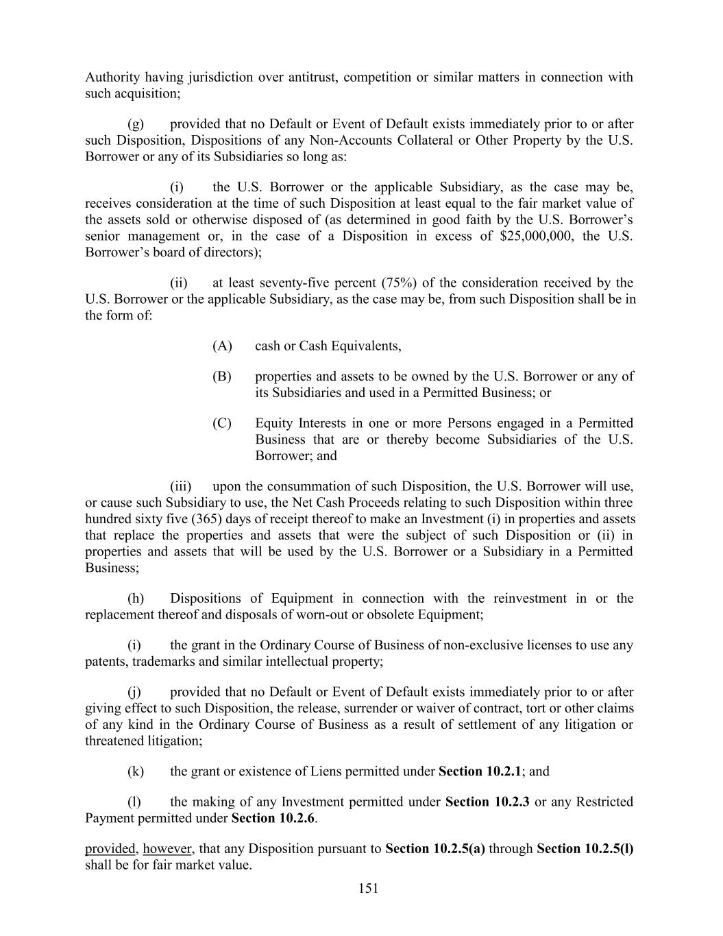 Authority having jurisdiction over antitrust, competition or similar matters in connection with such acquisition; (g) provided that no Default or Event of Default exists immediately prior to or after such Disposition, Dispositions of any Non-Accounts Collateral or Other Property by the U.S. Borrower or any of its Subsidiaries so long as: (i) the U.S. Borrower or the applicable Subsidiary, as the case may be, receives consideration at the time of such Disposition at least equal to the fair market value of the assets sold or otherwise disposed of (as determined in good faith by the U.S. Borrower’s senior management or, in the case of a Disposition in excess of $25,000,000, the U.S. Borrower’s board of directors); (ii) at least seventy-five percent (75%) of the consideration received by the U.S. Borrower or the applicable Subsidiary, as the case may be, from such Disposition shall be in the form of: (A) cash or Cash Equivalents, (B) properties and assets to be owned by the U.S. Borrower or any of its Subsidiaries and used in a Permitted Business; or (C) Equity Interests in one or more Persons engaged in a Permitted Business that are or thereby become Subsidiaries of the U.S. Borrower; and (iii) upon the consummation of such Disposition, the U.S. Borrower will use, or cause such Subsidiary to use, the Net Cash Proceeds relating to such Disposition within three hundred sixty five (365) days of receipt thereof to make an Investment (i) in properties and assets that replace the properties and assets that were the subject of such Disposition or (ii) in properties and assets that will be used by the U.S. Borrower or a Subsidiary in a Permitted Business; (h) Dispositions of Equipment in connection with the reinvestment in or the replacement thereof and disposals of worn-out or obsolete Equipment; (i) the grant in the Ordinary Course of Business of non-exclusive licenses to use any patents, trademarks and similar intellectual property; (j) provided that no Default or Event of Default exists immediately prior to or after giving effect to such Disposition, the release, surrender or waiver of contract, tort or other claims of any kind in the Ordinary Course of Business as a result of settlement of any litigation or threatened litigation; (k) the grant or existence of Liens permitted under Section 10.2.1; and (l) the making of any Investment permitted under Section 10.2.3 or any Restricted Payment permitted under Section 10.2.6. provided, however, that any Disposition pursuant to Section 10.2.5(a) through Section 10.2.5(l) shall be for fair market value. 151