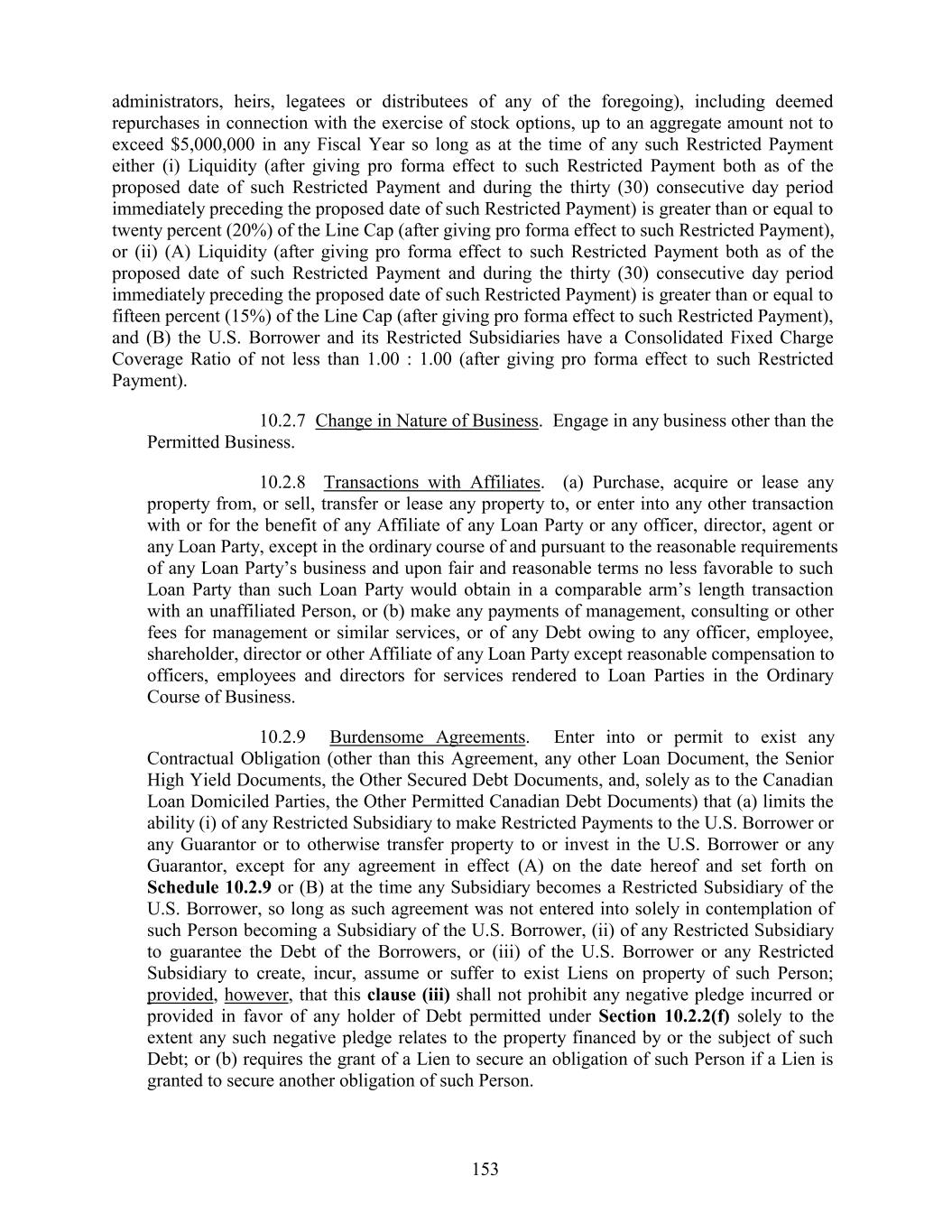 administrators, heirs, legatees or distributees of any of the foregoing), including deemed repurchases in connection with the exercise of stock options, up to an aggregate amount not to exceed $5,000,000 in any Fiscal Year so long as at the time of any such Restricted Payment either (i) Liquidity (after giving pro forma effect to such Restricted Payment both as of the proposed date of such Restricted Payment and during the thirty (30) consecutive day period immediately preceding the proposed date of such Restricted Payment) is greater than or equal to twenty percent (20%) of the Line Cap (after giving pro forma effect to such Restricted Payment), or (ii) (A) Liquidity (after giving pro forma effect to such Restricted Payment both as of the proposed date of such Restricted Payment and during the thirty (30) consecutive day period immediately preceding the proposed date of such Restricted Payment) is greater than or equal to fifteen percent (15%) of the Line Cap (after giving pro forma effect to such Restricted Payment), and (B) the U.S. Borrower and its Restricted Subsidiaries have a Consolidated Fixed Charge Coverage Ratio of not less than 1.00 : 1.00 (after giving pro forma effect to such Restricted Payment). 10.2.7 Change in Nature of Business. Engage in any business other than the Permitted Business. 10.2.8 Transactions with Affiliates. (a) Purchase, acquire or lease any property from, or sell, transfer or lease any property to, or enter into any other transaction with or for the benefit of any Affiliate of any Loan Party or any officer, director, agent or any Loan Party, except in the ordinary course of and pursuant to the reasonable requirements of any Loan Party’s business and upon fair and reasonable terms no less favorable to such Loan Party than such Loan Party would obtain in a comparable arm’s length transaction with an unaffiliated Person, or (b) make any payments of management, consulting or other fees for management or similar services, or of any Debt owing to any officer, employee, shareholder, director or other Affiliate of any Loan Party except reasonable compensation to officers, employees and directors for services rendered to Loan Parties in the Ordinary Course of Business. 10.2.9 Burdensome Agreements. Enter into or permit to exist any Contractual Obligation (other than this Agreement, any other Loan Document, the Senior High Yield Documents, the Other Secured Debt Documents, and, solely as to the Canadian Loan Domiciled Parties, the Other Permitted Canadian Debt Documents) that (a) limits the ability (i) of any Restricted Subsidiary to make Restricted Payments to the U.S. Borrower or any Guarantor or to otherwise transfer property to or invest in the U.S. Borrower or any Guarantor, except for any agreement in effect (A) on the date hereof and set forth on Schedule 10.2.9 or (B) at the time any Subsidiary becomes a Restricted Subsidiary of the U.S. Borrower, so long as such agreement was not entered into solely in contemplation of such Person becoming a Subsidiary of the U.S. Borrower, (ii) of any Restricted Subsidiary to guarantee the Debt of the Borrowers, or (iii) of the U.S. Borrower or any Restricted Subsidiary to create, incur, assume or suffer to exist Liens on property of such Person; provided, however, that this clause (iii) shall not prohibit any negative pledge incurred or provided in favor of any holder of Debt permitted under Section 10.2.2(f) solely to the extent any such negative pledge relates to the property financed by or the subject of such Debt; or (b) requires the grant of a Lien to secure an obligation of such Person if a Lien is granted to secure another obligation of such Person. 153