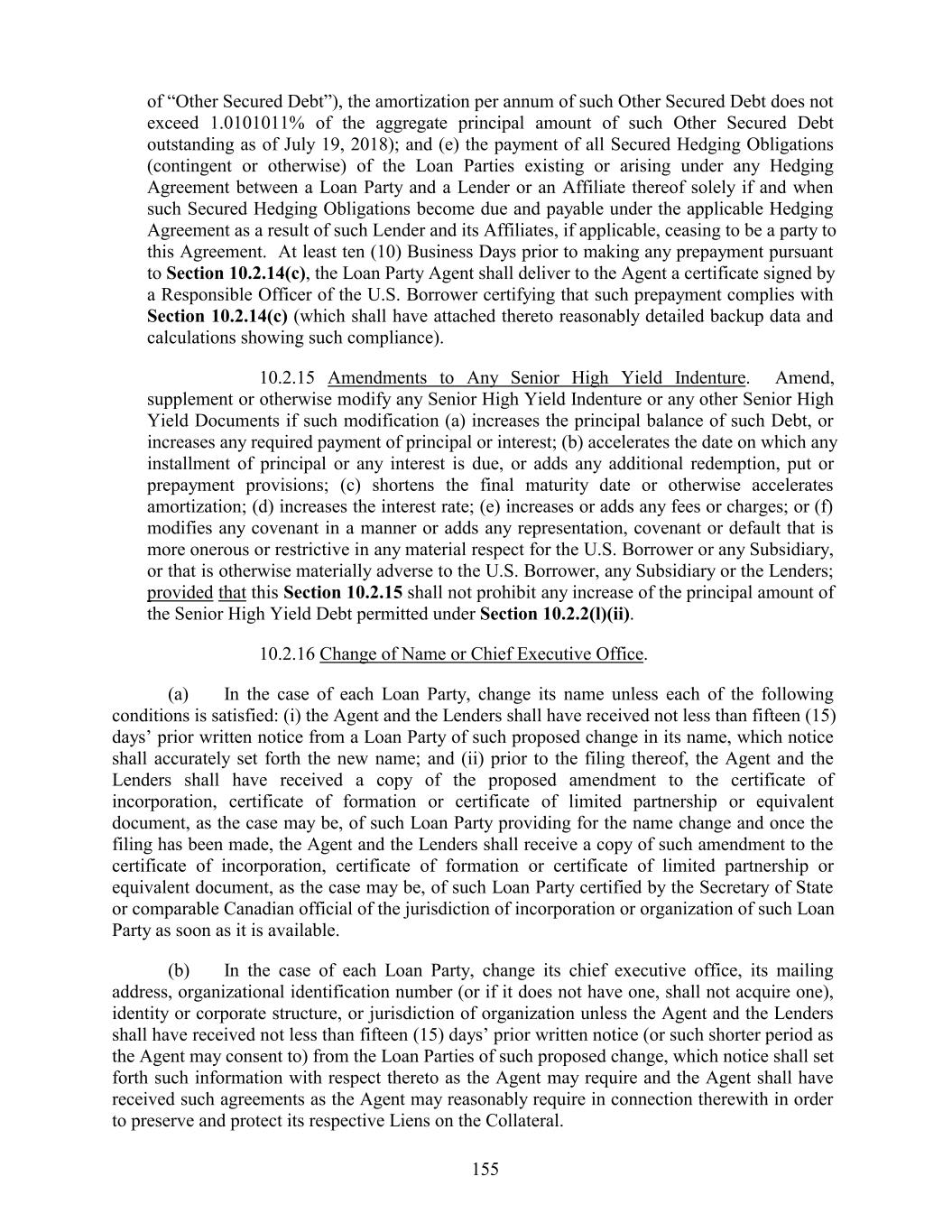 of “Other Secured Debt”), the amortization per annum of such Other Secured Debt does not exceed 1.0101011% of the aggregate principal amount of such Other Secured Debt outstanding as of July 19, 2018); and (e) the payment of all Secured Hedging Obligations (contingent or otherwise) of the Loan Parties existing or arising under any Hedging Agreement between a Loan Party and a Lender or an Affiliate thereof solely if and when such Secured Hedging Obligations become due and payable under the applicable Hedging Agreement as a result of such Lender and its Affiliates, if applicable, ceasing to be a party to this Agreement. At least ten (10) Business Days prior to making any prepayment pursuant to Section 10.2.14(c), the Loan Party Agent shall deliver to the Agent a certificate signed by a Responsible Officer of the U.S. Borrower certifying that such prepayment complies with Section 10.2.14(c) (which shall have attached thereto reasonably detailed backup data and calculations showing such compliance). 10.2.15 Amendments to Any Senior High Yield Indenture. Amend, supplement or otherwise modify any Senior High Yield Indenture or any other Senior High Yield Documents if such modification (a) increases the principal balance of such Debt, or increases any required payment of principal or interest; (b) accelerates the date on which any installment of principal or any interest is due, or adds any additional redemption, put or prepayment provisions; (c) shortens the final maturity date or otherwise accelerates amortization; (d) increases the interest rate; (e) increases or adds any fees or charges; or (f) modifies any covenant in a manner or adds any representation, covenant or default that is more onerous or restrictive in any material respect for the U.S. Borrower or any Subsidiary, or that is otherwise materially adverse to the U.S. Borrower, any Subsidiary or the Lenders; provided that this Section 10.2.15 shall not prohibit any increase of the principal amount of the Senior High Yield Debt permitted under Section 10.2.2(l)(ii). 10.2.16 Change of Name or Chief Executive Office. (a) In the case of each Loan Party, change its name unless each of the following conditions is satisfied: (i) the Agent and the Lenders shall have received not less than fifteen (15) days’ prior written notice from a Loan Party of such proposed change in its name, which notice shall accurately set forth the new name; and (ii) prior to the filing thereof, the Agent and the Lenders shall have received a copy of the proposed amendment to the certificate of incorporation, certificate of formation or certificate of limited partnership or equivalent document, as the case may be, of such Loan Party providing for the name change and once the filing has been made, the Agent and the Lenders shall receive a copy of such amendment to the certificate of incorporation, certificate of formation or certificate of limited partnership or equivalent document, as the case may be, of such Loan Party certified by the Secretary of State or comparable Canadian official of the jurisdiction of incorporation or organization of such Loan Party as soon as it is available. (b) In the case of each Loan Party, change its chief executive office, its mailing address, organizational identification number (or if it does not have one, shall not acquire one), identity or corporate structure, or jurisdiction of organization unless the Agent and the Lenders shall have received not less than fifteen (15) days’ prior written notice (or such shorter period as the Agent may consent to) from the Loan Parties of such proposed change, which notice shall set forth such information with respect thereto as the Agent may require and the Agent shall have received such agreements as the Agent may reasonably require in connection therewith in order to preserve and protect its respective Liens on the Collateral. 155