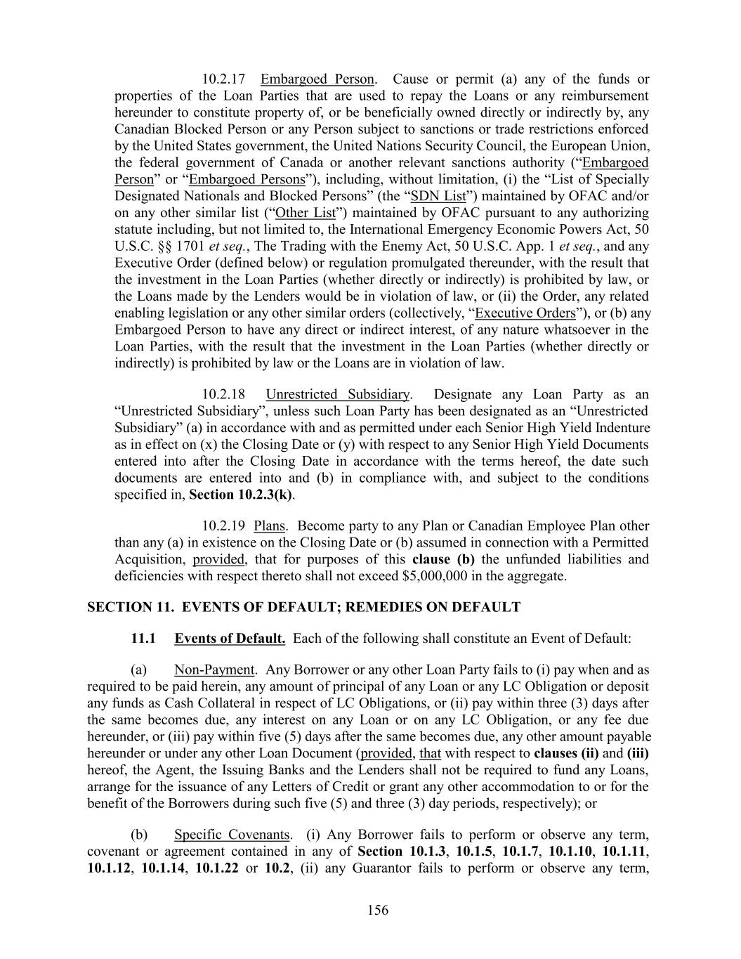 10.2.17 Embargoed Person. Cause or permit (a) any of the funds or properties of the Loan Parties that are used to repay the Loans or any reimbursement hereunder to constitute property of, or be beneficially owned directly or indirectly by, any Canadian Blocked Person or any Person subject to sanctions or trade restrictions enforced by the United States government, the United Nations Security Council, the European Union, the federal government of Canada or another relevant sanctions authority (“Embargoed Person” or “Embargoed Persons”), including, without limitation, (i) the “List of Specially Designated Nationals and Blocked Persons” (the “SDN List”) maintained by OFAC and/or on any other similar list (“Other List”) maintained by OFAC pursuant to any authorizing statute including, but not limited to, the International Emergency Economic Powers Act, 50 U.S.C. §§ 1701 et seq., The Trading with the Enemy Act, 50 U.S.C. App. 1 et seq., and any Executive Order (defined below) or regulation promulgated thereunder, with the result that the investment in the Loan Parties (whether directly or indirectly) is prohibited by law, or the Loans made by the Lenders would be in violation of law, or (ii) the Order, any related enabling legislation or any other similar orders (collectively, “Executive Orders”), or (b) any Embargoed Person to have any direct or indirect interest, of any nature whatsoever in the Loan Parties, with the result that the investment in the Loan Parties (whether directly or indirectly) is prohibited by law or the Loans are in violation of law. 10.2.18 Unrestricted Subsidiary. Designate any Loan Party as an “Unrestricted Subsidiary”, unless such Loan Party has been designated as an “Unrestricted Subsidiary” (a) in accordance with and as permitted under each Senior High Yield Indenture as in effect on (x) the Closing Date or (y) with respect to any Senior High Yield Documents entered into after the Closing Date in accordance with the terms hereof, the date such documents are entered into and (b) in compliance with, and subject to the conditions specified in, Section 10.2.3(k). 10.2.19 Plans. Become party to any Plan or Canadian Employee Plan other than any (a) in existence on the Closing Date or (b) assumed in connection with a Permitted Acquisition, provided, that for purposes of this clause (b) the unfunded liabilities and deficiencies with respect thereto shall not exceed $5,000,000 in the aggregate. SECTION 11. EVENTS OF DEFAULT; REMEDIES ON DEFAULT 11.1 Events of Default. Each of the following shall constitute an Event of Default: (a) Non-Payment. Any Borrower or any other Loan Party fails to (i) pay when and as required to be paid herein, any amount of principal of any Loan or any LC Obligation or deposit any funds as Cash Collateral in respect of LC Obligations, or (ii) pay within three (3) days after the same becomes due, any interest on any Loan or on any LC Obligation, or any fee due hereunder, or (iii) pay within five (5) days after the same becomes due, any other amount payable hereunder or under any other Loan Document (provided, that with respect to clauses (ii) and (iii) hereof, the Agent, the Issuing Banks and the Lenders shall not be required to fund any Loans, arrange for the issuance of any Letters of Credit or grant any other accommodation to or for the benefit of the Borrowers during such five (5) and three (3) day periods, respectively); or (b) Specific Covenants. (i) Any Borrower fails to perform or observe any term, covenant or agreement contained in any of Section 10.1.3, 10.1.5, 10.1.7, 10.1.10, 10.1.11, 10.1.12, 10.1.14, 10.1.22 or 10.2, (ii) any Guarantor fails to perform or observe any term, 156