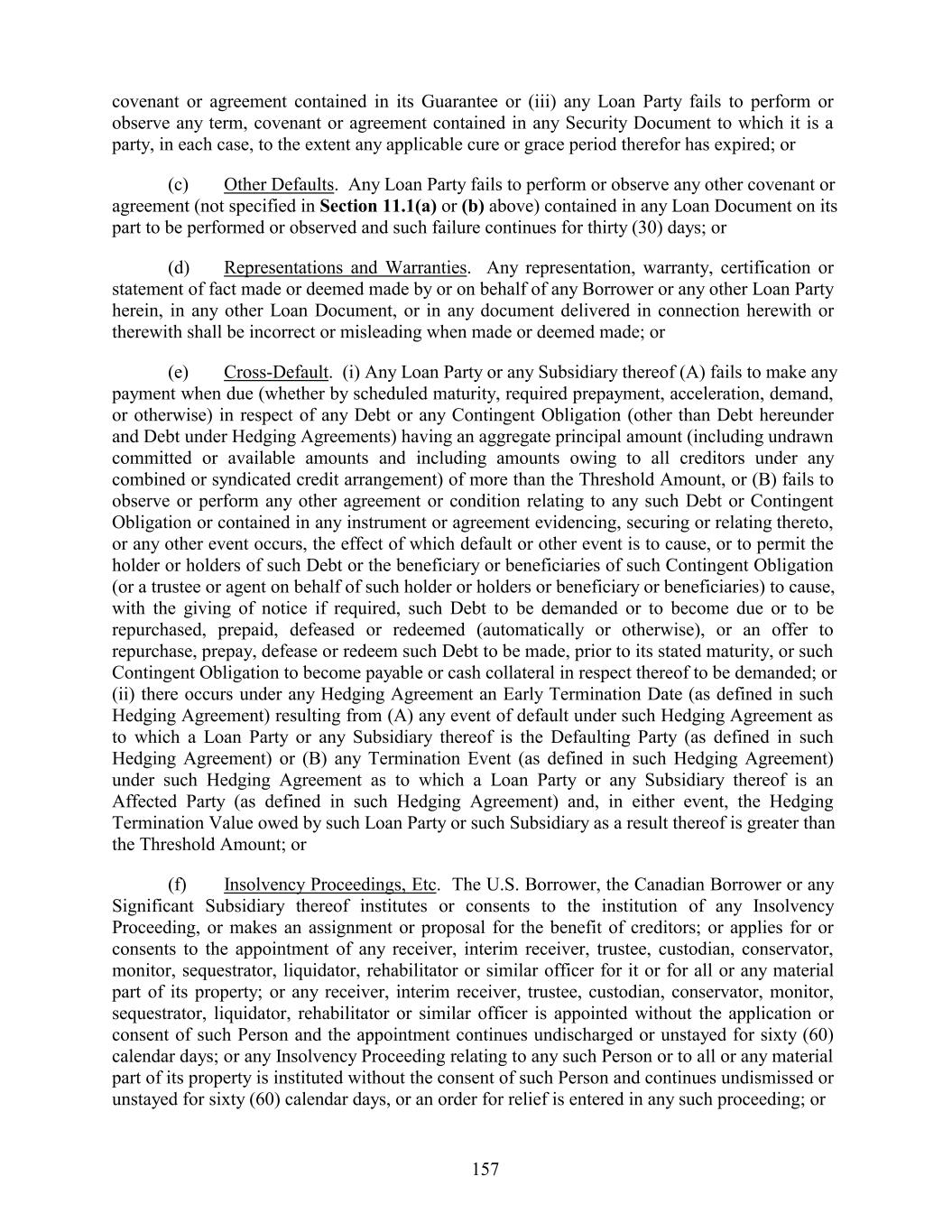 covenant or agreement contained in its Guarantee or (iii) any Loan Party fails to perform or observe any term, covenant or agreement contained in any Security Document to which it is a party, in each case, to the extent any applicable cure or grace period therefor has expired; or (c) Other Defaults. Any Loan Party fails to perform or observe any other covenant or agreement (not specified in Section 11.1(a) or (b) above) contained in any Loan Document on its part to be performed or observed and such failure continues for thirty (30) days; or (d) Representations and Warranties. Any representation, warranty, certification or statement of fact made or deemed made by or on behalf of any Borrower or any other Loan Party herein, in any other Loan Document, or in any document delivered in connection herewith or therewith shall be incorrect or misleading when made or deemed made; or (e) Cross-Default. (i) Any Loan Party or any Subsidiary thereof (A) fails to make any payment when due (whether by scheduled maturity, required prepayment, acceleration, demand, or otherwise) in respect of any Debt or any Contingent Obligation (other than Debt hereunder and Debt under Hedging Agreements) having an aggregate principal amount (including undrawn committed or available amounts and including amounts owing to all creditors under any combined or syndicated credit arrangement) of more than the Threshold Amount, or (B) fails to observe or perform any other agreement or condition relating to any such Debt or Contingent Obligation or contained in any instrument or agreement evidencing, securing or relating thereto, or any other event occurs, the effect of which default or other event is to cause, or to permit the holder or holders of such Debt or the beneficiary or beneficiaries of such Contingent Obligation (or a trustee or agent on behalf of such holder or holders or beneficiary or beneficiaries) to cause, with the giving of notice if required, such Debt to be demanded or to become due or to be repurchased, prepaid, defeased or redeemed (automatically or otherwise), or an offer to repurchase, prepay, defease or redeem such Debt to be made, prior to its stated maturity, or such Contingent Obligation to become payable or cash collateral in respect thereof to be demanded; or (ii) there occurs under any Hedging Agreement an Early Termination Date (as defined in such Hedging Agreement) resulting from (A) any event of default under such Hedging Agreement as to which a Loan Party or any Subsidiary thereof is the Defaulting Party (as defined in such Hedging Agreement) or (B) any Termination Event (as defined in such Hedging Agreement) under such Hedging Agreement as to which a Loan Party or any Subsidiary thereof is an Affected Party (as defined in such Hedging Agreement) and, in either event, the Hedging Termination Value owed by such Loan Party or such Subsidiary as a result thereof is greater than the Threshold Amount; or (f) Insolvency Proceedings, Etc. The U.S. Borrower, the Canadian Borrower or any Significant Subsidiary thereof institutes or consents to the institution of any Insolvency Proceeding, or makes an assignment or proposal for the benefit of creditors; or applies for or consents to the appointment of any receiver, interim receiver, trustee, custodian, conservator, monitor, sequestrator, liquidator, rehabilitator or similar officer for it or for all or any material part of its property; or any receiver, interim receiver, trustee, custodian, conservator, monitor, sequestrator, liquidator, rehabilitator or similar officer is appointed without the application or consent of such Person and the appointment continues undischarged or unstayed for sixty (60) calendar days; or any Insolvency Proceeding relating to any such Person or to all or any material part of its property is instituted without the consent of such Person and continues undismissed or unstayed for sixty (60) calendar days, or an order for relief is entered in any such proceeding; or 157
