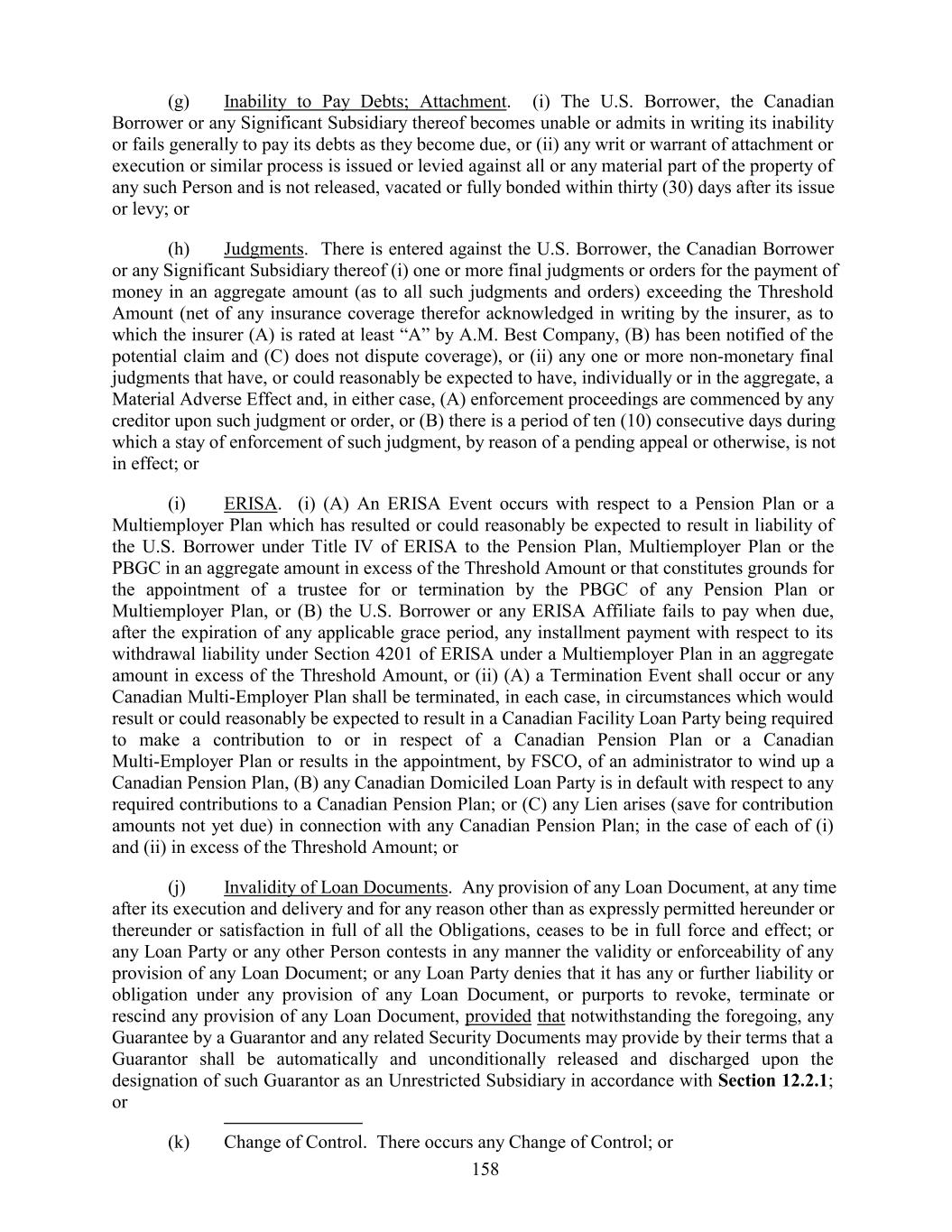 (g) Inability to Pay Debts; Attachment. (i) The U.S. Borrower, the Canadian Borrower or any Significant Subsidiary thereof becomes unable or admits in writing its inability or fails generally to pay its debts as they become due, or (ii) any writ or warrant of attachment or execution or similar process is issued or levied against all or any material part of the property of any such Person and is not released, vacated or fully bonded within thirty (30) days after its issue or levy; or (h) Judgments. There is entered against the U.S. Borrower, the Canadian Borrower or any Significant Subsidiary thereof (i) one or more final judgments or orders for the payment of money in an aggregate amount (as to all such judgments and orders) exceeding the Threshold Amount (net of any insurance coverage therefor acknowledged in writing by the insurer, as to which the insurer (A) is rated at least “A” by A.M. Best Company, (B) has been notified of the potential claim and (C) does not dispute coverage), or (ii) any one or more non-monetary final judgments that have, or could reasonably be expected to have, individually or in the aggregate, a Material Adverse Effect and, in either case, (A) enforcement proceedings are commenced by any creditor upon such judgment or order, or (B) there is a period of ten (10) consecutive days during which a stay of enforcement of such judgment, by reason of a pending appeal or otherwise, is not in effect; or (i) ERISA. (i) (A) An ERISA Event occurs with respect to a Pension Plan or a Multiemployer Plan which has resulted or could reasonably be expected to result in liability of the U.S. Borrower under Title IV of ERISA to the Pension Plan, Multiemployer Plan or the PBGC in an aggregate amount in excess of the Threshold Amount or that constitutes grounds for the appointment of a trustee for or termination by the PBGC of any Pension Plan or Multiemployer Plan, or (B) the U.S. Borrower or any ERISA Affiliate fails to pay when due, after the expiration of any applicable grace period, any installment payment with respect to its withdrawal liability under Section 4201 of ERISA under a Multiemployer Plan in an aggregate amount in excess of the Threshold Amount, or (ii) (A) a Termination Event shall occur or any Canadian Multi-Employer Plan shall be terminated, in each case, in circumstances which would result or could reasonably be expected to result in a Canadian Facility Loan Party being required to make a contribution to or in respect of a Canadian Pension Plan or a Canadian Multi-Employer Plan or results in the appointment, by FSCO, of an administrator to wind up a Canadian Pension Plan, (B) any Canadian Domiciled Loan Party is in default with respect to any required contributions to a Canadian Pension Plan; or (C) any Lien arises (save for contribution amounts not yet due) in connection with any Canadian Pension Plan; in the case of each of (i) and (ii) in excess of the Threshold Amount; or (j) Invalidity of Loan Documents. Any provision of any Loan Document, at any time after its execution and delivery and for any reason other than as expressly permitted hereunder or thereunder or satisfaction in full of all the Obligations, ceases to be in full force and effect; or any Loan Party or any other Person contests in any manner the validity or enforceability of any provision of any Loan Document; or any Loan Party denies that it has any or further liability or obligation under any provision of any Loan Document, or purports to revoke, terminate or rescind any provision of any Loan Document, provided that notwithstanding the foregoing, any Guarantee by a Guarantor and any related Security Documents may provide by their terms that a Guarantor shall be automatically and unconditionally released and discharged upon the designation of such Guarantor as an Unrestricted Subsidiary in accordance with Section 12.2.1; or (k) Change of Control. There occurs any Change of Control; or 158