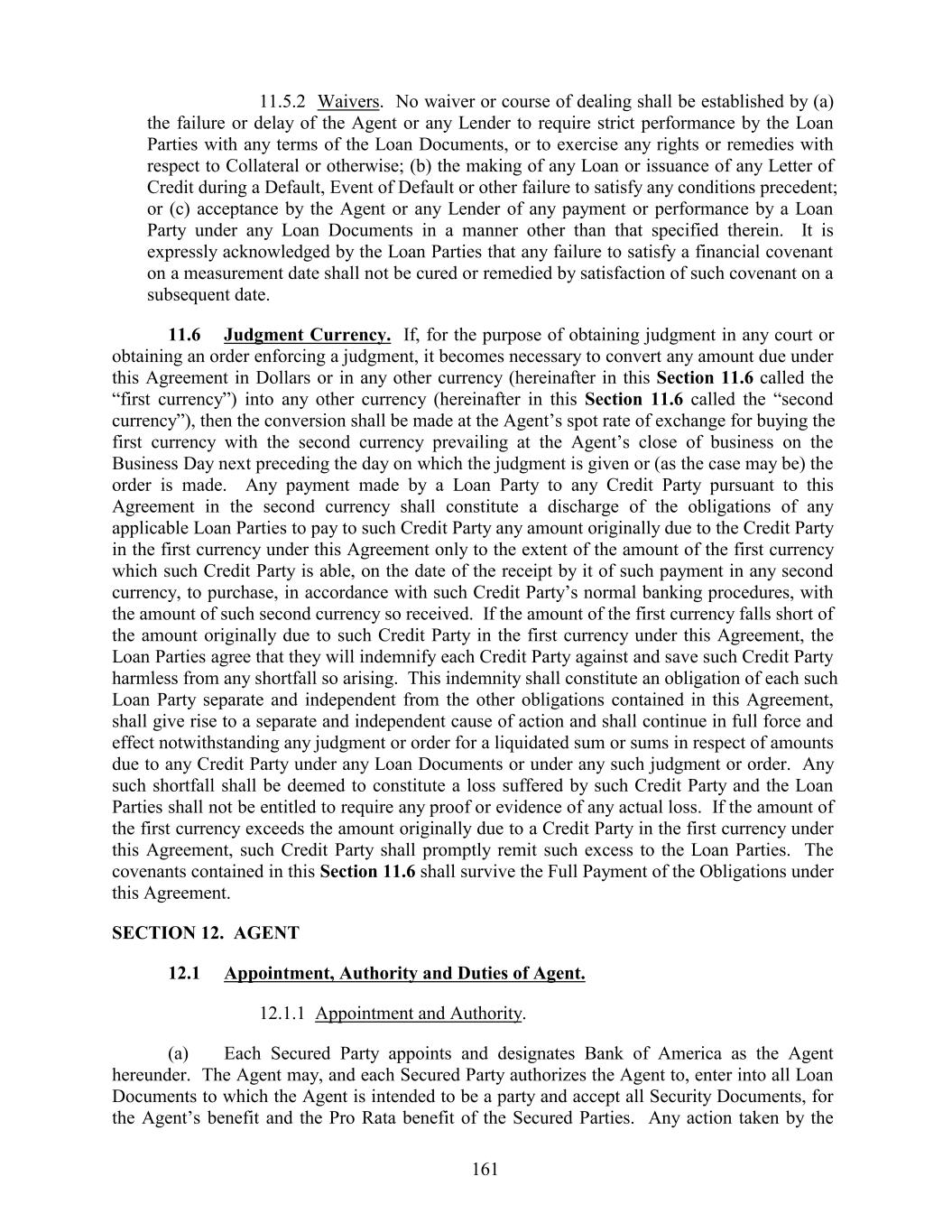 11.5.2 Waivers. No waiver or course of dealing shall be established by (a) the failure or delay of the Agent or any Lender to require strict performance by the Loan Parties with any terms of the Loan Documents, or to exercise any rights or remedies with respect to Collateral or otherwise; (b) the making of any Loan or issuance of any Letter of Credit during a Default, Event of Default or other failure to satisfy any conditions precedent; or (c) acceptance by the Agent or any Lender of any payment or performance by a Loan Party under any Loan Documents in a manner other than that specified therein. It is expressly acknowledged by the Loan Parties that any failure to satisfy a financial covenant on a measurement date shall not be cured or remedied by satisfaction of such covenant on a subsequent date. 11.6 Judgment Currency. If, for the purpose of obtaining judgment in any court or obtaining an order enforcing a judgment, it becomes necessary to convert any amount due under this Agreement in Dollars or in any other currency (hereinafter in this Section 11.6 called the “first currency”) into any other currency (hereinafter in this Section 11.6 called the “second currency”), then the conversion shall be made at the Agent’s spot rate of exchange for buying the first currency with the second currency prevailing at the Agent’s close of business on the Business Day next preceding the day on which the judgment is given or (as the case may be) the order is made. Any payment made by a Loan Party to any Credit Party pursuant to this Agreement in the second currency shall constitute a discharge of the obligations of any applicable Loan Parties to pay to such Credit Party any amount originally due to the Credit Party in the first currency under this Agreement only to the extent of the amount of the first currency which such Credit Party is able, on the date of the receipt by it of such payment in any second currency, to purchase, in accordance with such Credit Party’s normal banking procedures, with the amount of such second currency so received. If the amount of the first currency falls short of the amount originally due to such Credit Party in the first currency under this Agreement, the Loan Parties agree that they will indemnify each Credit Party against and save such Credit Party harmless from any shortfall so arising. This indemnity shall constitute an obligation of each such Loan Party separate and independent from the other obligations contained in this Agreement, shall give rise to a separate and independent cause of action and shall continue in full force and effect notwithstanding any judgment or order for a liquidated sum or sums in respect of amounts due to any Credit Party under any Loan Documents or under any such judgment or order. Any such shortfall shall be deemed to constitute a loss suffered by such Credit Party and the Loan Parties shall not be entitled to require any proof or evidence of any actual loss. If the amount of the first currency exceeds the amount originally due to a Credit Party in the first currency under this Agreement, such Credit Party shall promptly remit such excess to the Loan Parties. The covenants contained in this Section 11.6 shall survive the Full Payment of the Obligations under this Agreement. SECTION 12. AGENT 12.1 Appointment, Authority and Duties of Agent. 12.1.1 Appointment and Authority. (a) Each Secured Party appoints and designates Bank of America as the Agent hereunder. The Agent may, and each Secured Party authorizes the Agent to, enter into all Loan Documents to which the Agent is intended to be a party and accept all Security Documents, for the Agent’s benefit and the Pro Rata benefit of the Secured Parties. Any action taken by the 161