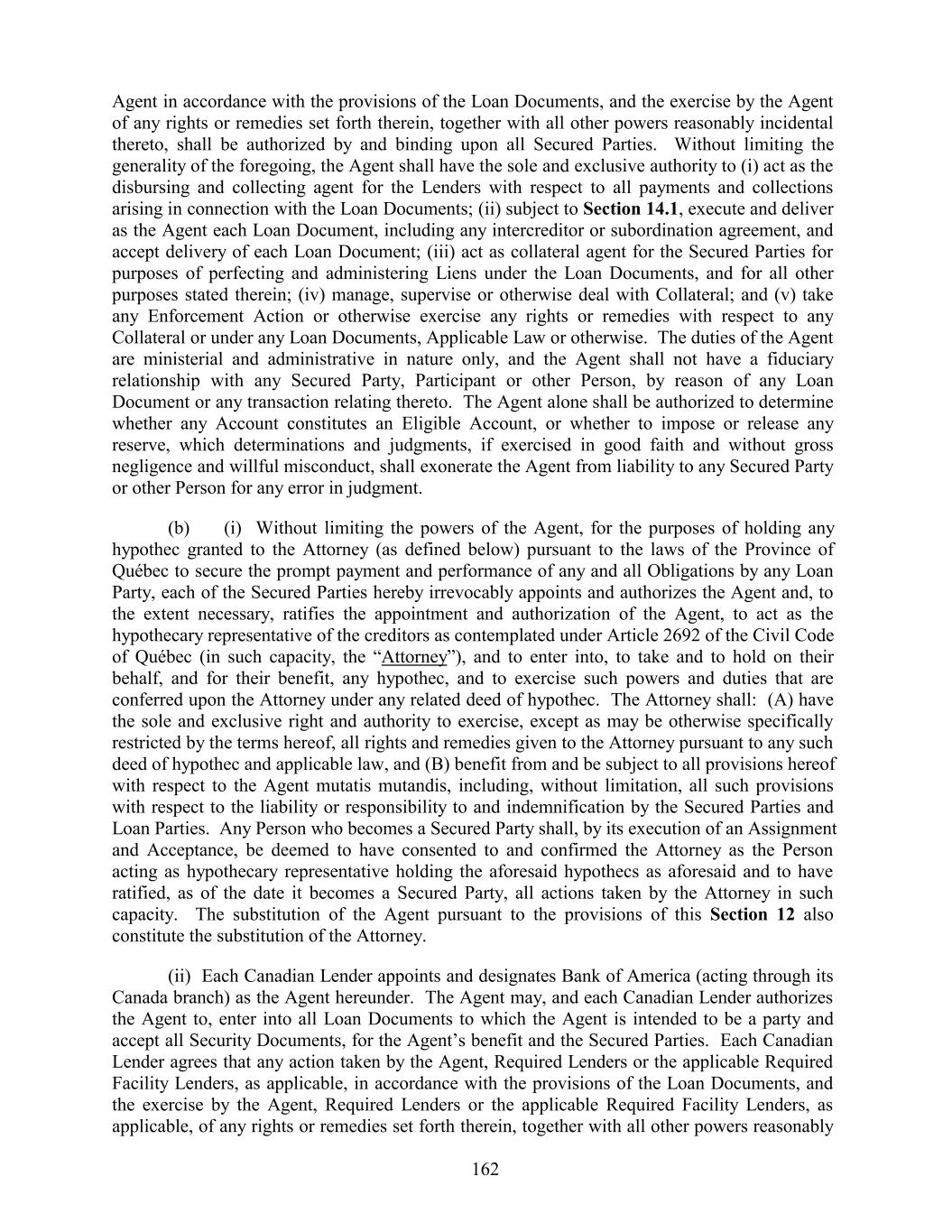 Agent in accordance with the provisions of the Loan Documents, and the exercise by the Agent of any rights or remedies set forth therein, together with all other powers reasonably incidental thereto, shall be authorized by and binding upon all Secured Parties. Without limiting the generality of the foregoing, the Agent shall have the sole and exclusive authority to (i) act as the disbursing and collecting agent for the Lenders with respect to all payments and collections arising in connection with the Loan Documents; (ii) subject to Section 14.1, execute and deliver as the Agent each Loan Document, including any intercreditor or subordination agreement, and accept delivery of each Loan Document; (iii) act as collateral agent for the Secured Parties for purposes of perfecting and administering Liens under the Loan Documents, and for all other purposes stated therein; (iv) manage, supervise or otherwise deal with Collateral; and (v) take any Enforcement Action or otherwise exercise any rights or remedies with respect to any Collateral or under any Loan Documents, Applicable Law or otherwise. The duties of the Agent are ministerial and administrative in nature only, and the Agent shall not have a fiduciary relationship with any Secured Party, Participant or other Person, by reason of any Loan Document or any transaction relating thereto. The Agent alone shall be authorized to determine whether any Account constitutes an Eligible Account, or whether to impose or release any reserve, which determinations and judgments, if exercised in good faith and without gross negligence and willful misconduct, shall exonerate the Agent from liability to any Secured Party or other Person for any error in judgment. (b) (i) Without limiting the powers of the Agent, for the purposes of holding any hypothec granted to the Attorney (as defined below) pursuant to the laws of the Province of Québec to secure the prompt payment and performance of any and all Obligations by any Loan Party, each of the Secured Parties hereby irrevocably appoints and authorizes the Agent and, to the extent necessary, ratifies the appointment and authorization of the Agent, to act as the hypothecary representative of the creditors as contemplated under Article 2692 of the Civil Code of Québec (in such capacity, the “Attorney”), and to enter into, to take and to hold on their behalf, and for their benefit, any hypothec, and to exercise such powers and duties that are conferred upon the Attorney under any related deed of hypothec. The Attorney shall: (A) have the sole and exclusive right and authority to exercise, except as may be otherwise specifically restricted by the terms hereof, all rights and remedies given to the Attorney pursuant to any such deed of hypothec and applicable law, and (B) benefit from and be subject to all provisions hereof with respect to the Agent mutatis mutandis, including, without limitation, all such provisions with respect to the liability or responsibility to and indemnification by the Secured Parties and Loan Parties. Any Person who becomes a Secured Party shall, by its execution of an Assignment and Acceptance, be deemed to have consented to and confirmed the Attorney as the Person acting as hypothecary representative holding the aforesaid hypothecs as aforesaid and to have ratified, as of the date it becomes a Secured Party, all actions taken by the Attorney in such capacity. The substitution of the Agent pursuant to the provisions of this Section 12 also constitute the substitution of the Attorney. (ii) Each Canadian Lender appoints and designates Bank of America (acting through its Canada branch) as the Agent hereunder. The Agent may, and each Canadian Lender authorizes the Agent to, enter into all Loan Documents to which the Agent is intended to be a party and accept all Security Documents, for the Agent’s benefit and the Secured Parties. Each Canadian Lender agrees that any action taken by the Agent, Required Lenders or the applicable Required Facility Lenders, as applicable, in accordance with the provisions of the Loan Documents, and the exercise by the Agent, Required Lenders or the applicable Required Facility Lenders, as applicable, of any rights or remedies set forth therein, together with all other powers reasonably 162