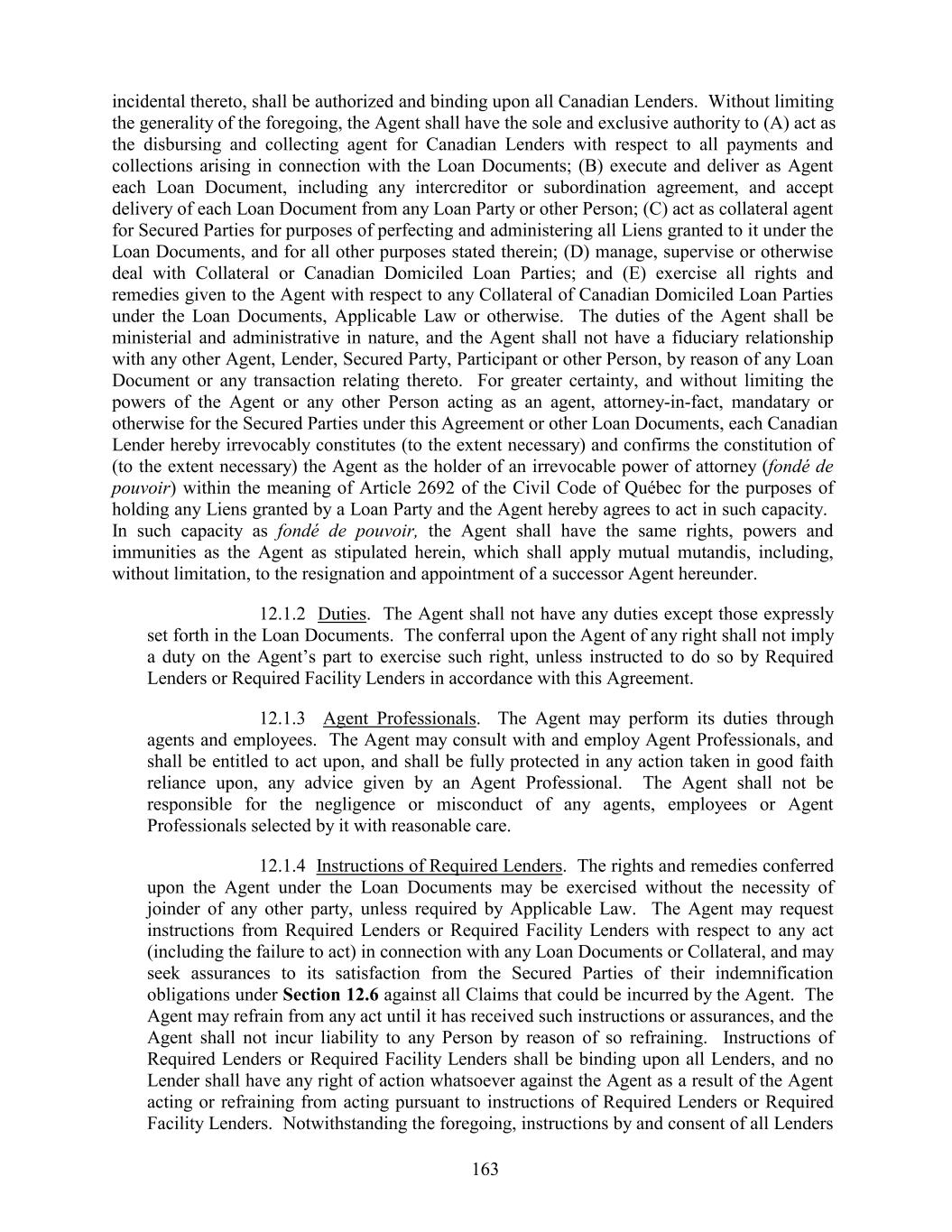 incidental thereto, shall be authorized and binding upon all Canadian Lenders. Without limiting the generality of the foregoing, the Agent shall have the sole and exclusive authority to (A) act as the disbursing and collecting agent for Canadian Lenders with respect to all payments and collections arising in connection with the Loan Documents; (B) execute and deliver as Agent each Loan Document, including any intercreditor or subordination agreement, and accept delivery of each Loan Document from any Loan Party or other Person; (C) act as collateral agent for Secured Parties for purposes of perfecting and administering all Liens granted to it under the Loan Documents, and for all other purposes stated therein; (D) manage, supervise or otherwise deal with Collateral or Canadian Domiciled Loan Parties; and (E) exercise all rights and remedies given to the Agent with respect to any Collateral of Canadian Domiciled Loan Parties under the Loan Documents, Applicable Law or otherwise. The duties of the Agent shall be ministerial and administrative in nature, and the Agent shall not have a fiduciary relationship with any other Agent, Lender, Secured Party, Participant or other Person, by reason of any Loan Document or any transaction relating thereto. For greater certainty, and without limiting the powers of the Agent or any other Person acting as an agent, attorney-in-fact, mandatary or otherwise for the Secured Parties under this Agreement or other Loan Documents, each Canadian Lender hereby irrevocably constitutes (to the extent necessary) and confirms the constitution of (to the extent necessary) the Agent as the holder of an irrevocable power of attorney (fondé de pouvoir) within the meaning of Article 2692 of the Civil Code of Québec for the purposes of holding any Liens granted by a Loan Party and the Agent hereby agrees to act in such capacity. In such capacity as fondé de pouvoir, the Agent shall have the same rights, powers and immunities as the Agent as stipulated herein, which shall apply mutual mutandis, including, without limitation, to the resignation and appointment of a successor Agent hereunder. 12.1.2 Duties. The Agent shall not have any duties except those expressly set forth in the Loan Documents. The conferral upon the Agent of any right shall not imply a duty on the Agent’s part to exercise such right, unless instructed to do so by Required Lenders or Required Facility Lenders in accordance with this Agreement. 12.1.3 Agent Professionals. The Agent may perform its duties through agents and employees. The Agent may consult with and employ Agent Professionals, and shall be entitled to act upon, and shall be fully protected in any action taken in good faith reliance upon, any advice given by an Agent Professional. The Agent shall not be responsible for the negligence or misconduct of any agents, employees or Agent Professionals selected by it with reasonable care. 12.1.4 Instructions of Required Lenders. The rights and remedies conferred upon the Agent under the Loan Documents may be exercised without the necessity of joinder of any other party, unless required by Applicable Law. The Agent may request instructions from Required Lenders or Required Facility Lenders with respect to any act (including the failure to act) in connection with any Loan Documents or Collateral, and may seek assurances to its satisfaction from the Secured Parties of their indemnification obligations under Section 12.6 against all Claims that could be incurred by the Agent. The Agent may refrain from any act until it has received such instructions or assurances, and the Agent shall not incur liability to any Person by reason of so refraining. Instructions of Required Lenders or Required Facility Lenders shall be binding upon all Lenders, and no Lender shall have any right of action whatsoever against the Agent as a result of the Agent acting or refraining from acting pursuant to instructions of Required Lenders or Required Facility Lenders. Notwithstanding the foregoing, instructions by and consent of all Lenders 163