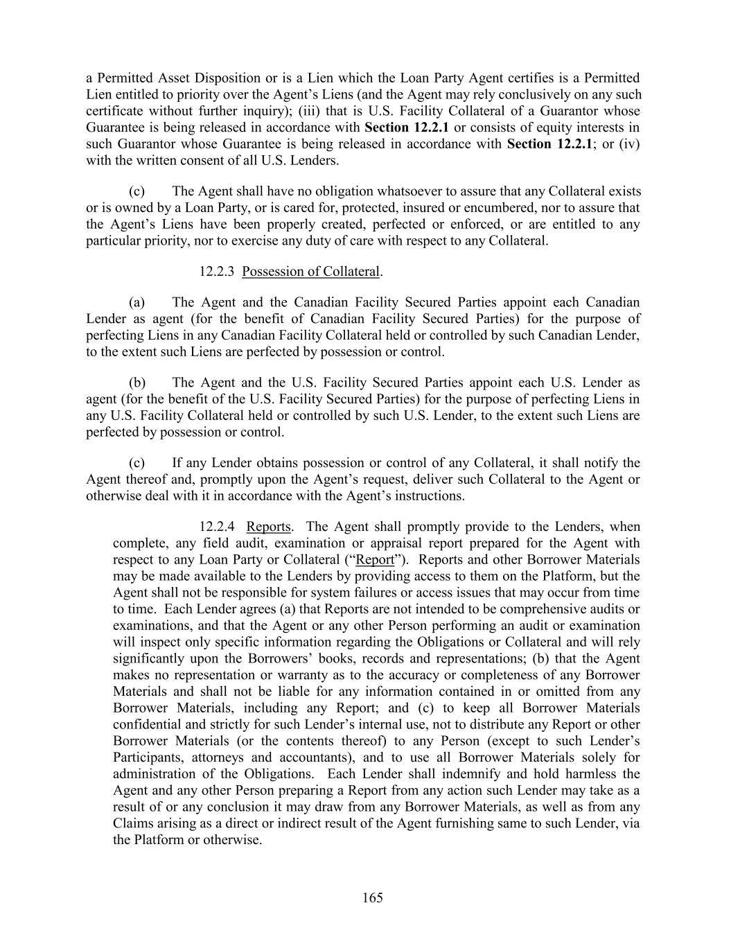 a Permitted Asset Disposition or is a Lien which the Loan Party Agent certifies is a Permitted Lien entitled to priority over the Agent’s Liens (and the Agent may rely conclusively on any such certificate without further inquiry); (iii) that is U.S. Facility Collateral of a Guarantor whose Guarantee is being released in accordance with Section 12.2.1 or consists of equity interests in such Guarantor whose Guarantee is being released in accordance with Section 12.2.1; or (iv) with the written consent of all U.S. Lenders. (c) The Agent shall have no obligation whatsoever to assure that any Collateral exists or is owned by a Loan Party, or is cared for, protected, insured or encumbered, nor to assure that the Agent’s Liens have been properly created, perfected or enforced, or are entitled to any particular priority, nor to exercise any duty of care with respect to any Collateral. 12.2.3 Possession of Collateral. (a) The Agent and the Canadian Facility Secured Parties appoint each Canadian Lender as agent (for the benefit of Canadian Facility Secured Parties) for the purpose of perfecting Liens in any Canadian Facility Collateral held or controlled by such Canadian Lender, to the extent such Liens are perfected by possession or control. (b) The Agent and the U.S. Facility Secured Parties appoint each U.S. Lender as agent (for the benefit of the U.S. Facility Secured Parties) for the purpose of perfecting Liens in any U.S. Facility Collateral held or controlled by such U.S. Lender, to the extent such Liens are perfected by possession or control. (c) If any Lender obtains possession or control of any Collateral, it shall notify the Agent thereof and, promptly upon the Agent’s request, deliver such Collateral to the Agent or otherwise deal with it in accordance with the Agent’s instructions. 12.2.4 Reports. The Agent shall promptly provide to the Lenders, when complete, any field audit, examination or appraisal report prepared for the Agent with respect to any Loan Party or Collateral (“Report”). Reports and other Borrower Materials may be made available to the Lenders by providing access to them on the Platform, but the Agent shall not be responsible for system failures or access issues that may occur from time to time. Each Lender agrees (a) that Reports are not intended to be comprehensive audits or examinations, and that the Agent or any other Person performing an audit or examination will inspect only specific information regarding the Obligations or Collateral and will rely significantly upon the Borrowers’ books, records and representations; (b) that the Agent makes no representation or warranty as to the accuracy or completeness of any Borrower Materials and shall not be liable for any information contained in or omitted from any Borrower Materials, including any Report; and (c) to keep all Borrower Materials confidential and strictly for such Lender’s internal use, not to distribute any Report or other Borrower Materials (or the contents thereof) to any Person (except to such Lender’s Participants, attorneys and accountants), and to use all Borrower Materials solely for administration of the Obligations. Each Lender shall indemnify and hold harmless the Agent and any other Person preparing a Report from any action such Lender may take as a result of or any conclusion it may draw from any Borrower Materials, as well as from any Claims arising as a direct or indirect result of the Agent furnishing same to such Lender, via the Platform or otherwise. 165