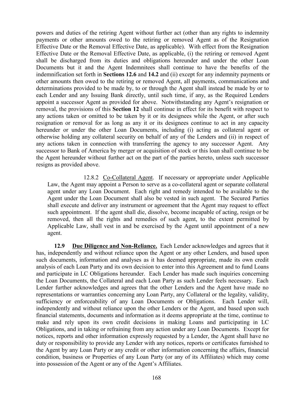 powers and duties of the retiring Agent without further act (other than any rights to indemnity payments or other amounts owed to the retiring or removed Agent as of the Resignation Effective Date or the Removal Effective Date, as applicable). With effect from the Resignation Effective Date or the Removal Effective Date, as applicable, (i) the retiring or removed Agent shall be discharged from its duties and obligations hereunder and under the other Loan Documents but it and the Agent Indemnitees shall continue to have the benefits of the indemnification set forth in Sections 12.6 and 14.2 and (ii) except for any indemnity payments or other amounts then owed to the retiring or removed Agent, all payments, communications and determinations provided to be made by, to or through the Agent shall instead be made by or to each Lender and any Issuing Bank directly, until such time, if any, as the Required Lenders appoint a successor Agent as provided for above. Notwithstanding any Agent’s resignation or removal, the provisions of this Section 12 shall continue in effect for its benefit with respect to any actions taken or omitted to be taken by it or its designees while the Agent, or after such resignation or removal for as long as any it or its designees continue to act in any capacity hereunder or under the other Loan Documents, including (i) acting as collateral agent or otherwise holding any collateral security on behalf of any of the Lenders and (ii) in respect of any actions taken in connection with transferring the agency to any successor Agent. Any successor to Bank of America by merger or acquisition of stock or this loan shall continue to be the Agent hereunder without further act on the part of the parties hereto, unless such successor resigns as provided above. 12.8.2 Co-Collateral Agent. If necessary or appropriate under Applicable Law, the Agent may appoint a Person to serve as a co-collateral agent or separate collateral agent under any Loan Document. Each right and remedy intended to be available to the Agent under the Loan Document shall also be vested in such agent. The Secured Parties shall execute and deliver any instrument or agreement that the Agent may request to effect such appointment. If the agent shall die, dissolve, become incapable of acting, resign or be removed, then all the rights and remedies of such agent, to the extent permitted by Applicable Law, shall vest in and be exercised by the Agent until appointment of a new agent. 12.9 Due Diligence and Non-Reliance. Each Lender acknowledges and agrees that it has, independently and without reliance upon the Agent or any other Lenders, and based upon such documents, information and analyses as it has deemed appropriate, made its own credit analysis of each Loan Party and its own decision to enter into this Agreement and to fund Loans and participate in LC Obligations hereunder. Each Lender has made such inquiries concerning the Loan Documents, the Collateral and each Loan Party as such Lender feels necessary. Each Lender further acknowledges and agrees that the other Lenders and the Agent have made no representations or warranties concerning any Loan Party, any Collateral or the legality, validity, sufficiency or enforceability of any Loan Documents or Obligations. Each Lender will, independently and without reliance upon the other Lenders or the Agent, and based upon such financial statements, documents and information as it deems appropriate at the time, continue to make and rely upon its own credit decisions in making Loans and participating in LC Obligations, and in taking or refraining from any action under any Loan Documents. Except for notices, reports and other information expressly requested by a Lender, the Agent shall have no duty or responsibility to provide any Lender with any notices, reports or certificates furnished to the Agent by any Loan Party or any credit or other information concerning the affairs, financial condition, business or Properties of any Loan Party (or any of its Affiliates) which may come into possession of the Agent or any of the Agent’s Affiliates. 168