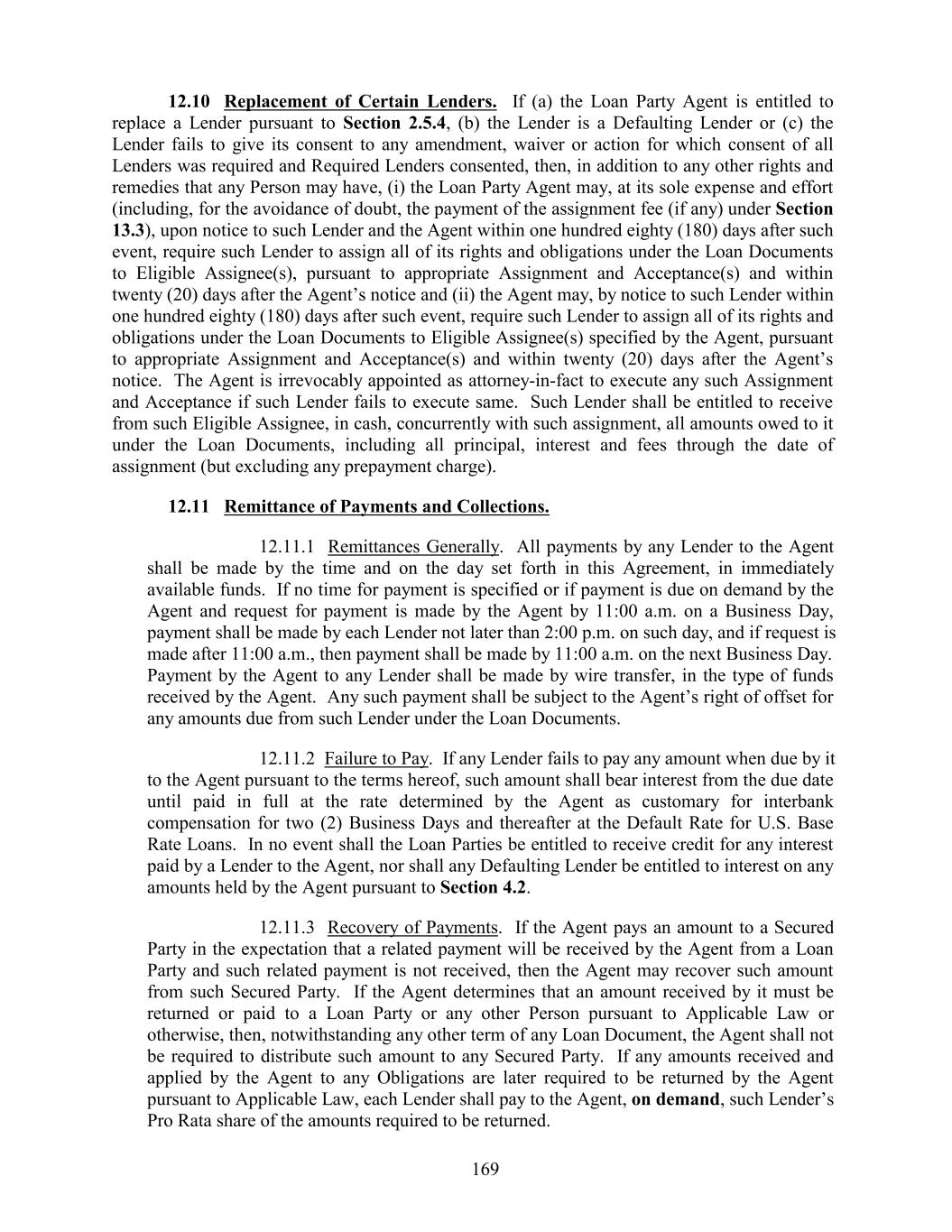 12.10 Replacement of Certain Lenders. If (a) the Loan Party Agent is entitled to replace a Lender pursuant to Section 2.5.4, (b) the Lender is a Defaulting Lender or (c) the Lender fails to give its consent to any amendment, waiver or action for which consent of all Lenders was required and Required Lenders consented, then, in addition to any other rights and remedies that any Person may have, (i) the Loan Party Agent may, at its sole expense and effort (including, for the avoidance of doubt, the payment of the assignment fee (if any) under Section 13.3), upon notice to such Lender and the Agent within one hundred eighty (180) days after such event, require such Lender to assign all of its rights and obligations under the Loan Documents to Eligible Assignee(s), pursuant to appropriate Assignment and Acceptance(s) and within twenty (20) days after the Agent’s notice and (ii) the Agent may, by notice to such Lender within one hundred eighty (180) days after such event, require such Lender to assign all of its rights and obligations under the Loan Documents to Eligible Assignee(s) specified by the Agent, pursuant to appropriate Assignment and Acceptance(s) and within twenty (20) days after the Agent’s notice. The Agent is irrevocably appointed as attorney-in-fact to execute any such Assignment and Acceptance if such Lender fails to execute same. Such Lender shall be entitled to receive from such Eligible Assignee, in cash, concurrently with such assignment, all amounts owed to it under the Loan Documents, including all principal, interest and fees through the date of assignment (but excluding any prepayment charge). 12.11 Remittance of Payments and Collections. 12.11.1 Remittances Generally. All payments by any Lender to the Agent shall be made by the time and on the day set forth in this Agreement, in immediately available funds. If no time for payment is specified or if payment is due on demand by the Agent and request for payment is made by the Agent by 11:00 a.m. on a Business Day, payment shall be made by each Lender not later than 2:00 p.m. on such day, and if request is made after 11:00 a.m., then payment shall be made by 11:00 a.m. on the next Business Day. Payment by the Agent to any Lender shall be made by wire transfer, in the type of funds received by the Agent. Any such payment shall be subject to the Agent’s right of offset for any amounts due from such Lender under the Loan Documents. 12.11.2 Failure to Pay. If any Lender fails to pay any amount when due by it to the Agent pursuant to the terms hereof, such amount shall bear interest from the due date until paid in full at the rate determined by the Agent as customary for interbank compensation for two (2) Business Days and thereafter at the Default Rate for U.S. Base Rate Loans. In no event shall the Loan Parties be entitled to receive credit for any interest paid by a Lender to the Agent, nor shall any Defaulting Lender be entitled to interest on any amounts held by the Agent pursuant to Section 4.2. 12.11.3 Recovery of Payments. If the Agent pays an amount to a Secured Party in the expectation that a related payment will be received by the Agent from a Loan Party and such related payment is not received, then the Agent may recover such amount from such Secured Party. If the Agent determines that an amount received by it must be returned or paid to a Loan Party or any other Person pursuant to Applicable Law or otherwise, then, notwithstanding any other term of any Loan Document, the Agent shall not be required to distribute such amount to any Secured Party. If any amounts received and applied by the Agent to any Obligations are later required to be returned by the Agent pursuant to Applicable Law, each Lender shall pay to the Agent, on demand, such Lender’s Pro Rata share of the amounts required to be returned. 169