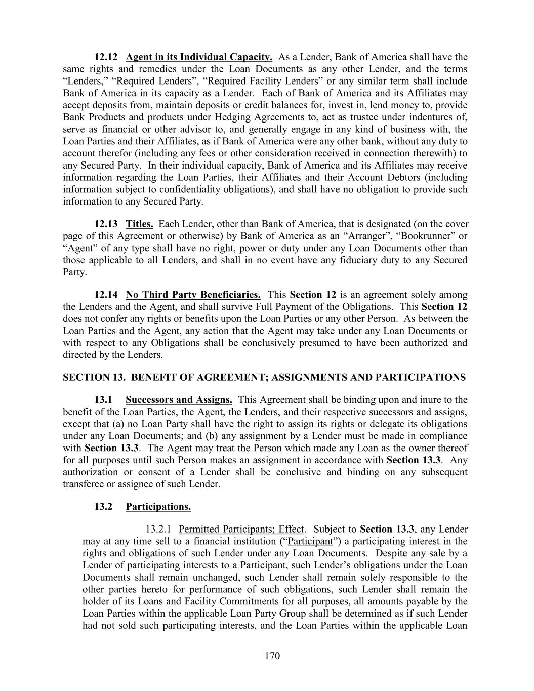12.12 Agent in its Individual Capacity. As a Lender, Bank of America shall have the same rights and remedies under the Loan Documents as any other Lender, and the terms “Lenders,” “Required Lenders”, “Required Facility Lenders” or any similar term shall include Bank of America in its capacity as a Lender. Each of Bank of America and its Affiliates may accept deposits from, maintain deposits or credit balances for, invest in, lend money to, provide Bank Products and products under Hedging Agreements to, act as trustee under indentures of, serve as financial or other advisor to, and generally engage in any kind of business with, the Loan Parties and their Affiliates, as if Bank of America were any other bank, without any duty to account therefor (including any fees or other consideration received in connection therewith) to any Secured Party. In their individual capacity, Bank of America and its Affiliates may receive information regarding the Loan Parties, their Affiliates and their Account Debtors (including information subject to confidentiality obligations), and shall have no obligation to provide such information to any Secured Party. 12.13 Titles. Each Lender, other than Bank of America, that is designated (on the cover page of this Agreement or otherwise) by Bank of America as an “Arranger”, “Bookrunner” or “Agent” of any type shall have no right, power or duty under any Loan Documents other than those applicable to all Lenders, and shall in no event have any fiduciary duty to any Secured Party. 12.14 No Third Party Beneficiaries. This Section 12 is an agreement solely among the Lenders and the Agent, and shall survive Full Payment of the Obligations. This Section 12 does not confer any rights or benefits upon the Loan Parties or any other Person. As between the Loan Parties and the Agent, any action that the Agent may take under any Loan Documents or with respect to any Obligations shall be conclusively presumed to have been authorized and directed by the Lenders. SECTION 13. BENEFIT OF AGREEMENT; ASSIGNMENTS AND PARTICIPATIONS 13.1 Successors and Assigns. This Agreement shall be binding upon and inure to the benefit of the Loan Parties, the Agent, the Lenders, and their respective successors and assigns, except that (a) no Loan Party shall have the right to assign its rights or delegate its obligations under any Loan Documents; and (b) any assignment by a Lender must be made in compliance with Section 13.3. The Agent may treat the Person which made any Loan as the owner thereof for all purposes until such Person makes an assignment in accordance with Section 13.3. Any authorization or consent of a Lender shall be conclusive and binding on any subsequent transferee or assignee of such Lender. 13.2 Participations. 13.2.1 Permitted Participants; Effect. Subject to Section 13.3, any Lender may at any time sell to a financial institution (“Participant”) a participating interest in the rights and obligations of such Lender under any Loan Documents. Despite any sale by a Lender of participating interests to a Participant, such Lender’s obligations under the Loan Documents shall remain unchanged, such Lender shall remain solely responsible to the other parties hereto for performance of such obligations, such Lender shall remain the holder of its Loans and Facility Commitments for all purposes, all amounts payable by the Loan Parties within the applicable Loan Party Group shall be determined as if such Lender had not sold such participating interests, and the Loan Parties within the applicable Loan 170