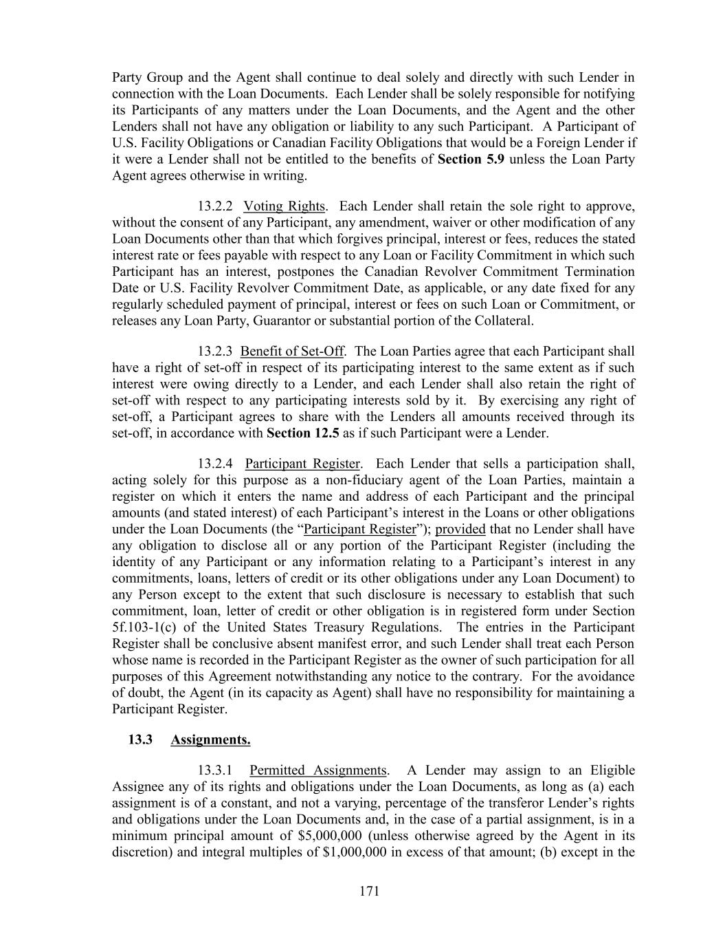 Party Group and the Agent shall continue to deal solely and directly with such Lender in connection with the Loan Documents. Each Lender shall be solely responsible for notifying its Participants of any matters under the Loan Documents, and the Agent and the other Lenders shall not have any obligation or liability to any such Participant. A Participant of U.S. Facility Obligations or Canadian Facility Obligations that would be a Foreign Lender if it were a Lender shall not be entitled to the benefits of Section 5.9 unless the Loan Party Agent agrees otherwise in writing. 13.2.2 Voting Rights. Each Lender shall retain the sole right to approve, without the consent of any Participant, any amendment, waiver or other modification of any Loan Documents other than that which forgives principal, interest or fees, reduces the stated interest rate or fees payable with respect to any Loan or Facility Commitment in which such Participant has an interest, postpones the Canadian Revolver Commitment Termination Date or U.S. Facility Revolver Commitment Date, as applicable, or any date fixed for any regularly scheduled payment of principal, interest or fees on such Loan or Commitment, or releases any Loan Party, Guarantor or substantial portion of the Collateral. 13.2.3 Benefit of Set-Off. The Loan Parties agree that each Participant shall have a right of set-off in respect of its participating interest to the same extent as if such interest were owing directly to a Lender, and each Lender shall also retain the right of set-off with respect to any participating interests sold by it. By exercising any right of set-off, a Participant agrees to share with the Lenders all amounts received through its set-off, in accordance with Section 12.5 as if such Participant were a Lender. 13.2.4 Participant Register. Each Lender that sells a participation shall, acting solely for this purpose as a non-fiduciary agent of the Loan Parties, maintain a register on which it enters the name and address of each Participant and the principal amounts (and stated interest) of each Participant’s interest in the Loans or other obligations under the Loan Documents (the “Participant Register”); provided that no Lender shall have any obligation to disclose all or any portion of the Participant Register (including the identity of any Participant or any information relating to a Participant’s interest in any commitments, loans, letters of credit or its other obligations under any Loan Document) to any Person except to the extent that such disclosure is necessary to establish that such commitment, loan, letter of credit or other obligation is in registered form under Section 5f.103-1(c) of the United States Treasury Regulations. The entries in the Participant Register shall be conclusive absent manifest error, and such Lender shall treat each Person whose name is recorded in the Participant Register as the owner of such participation for all purposes of this Agreement notwithstanding any notice to the contrary. For the avoidance of doubt, the Agent (in its capacity as Agent) shall have no responsibility for maintaining a Participant Register. 13.3 Assignments. 13.3.1 Permitted Assignments. A Lender may assign to an Eligible Assignee any of its rights and obligations under the Loan Documents, as long as (a) each assignment is of a constant, and not a varying, percentage of the transferor Lender’s rights and obligations under the Loan Documents and, in the case of a partial assignment, is in a minimum principal amount of $5,000,000 (unless otherwise agreed by the Agent in its discretion) and integral multiples of $1,000,000 in excess of that amount; (b) except in the 171