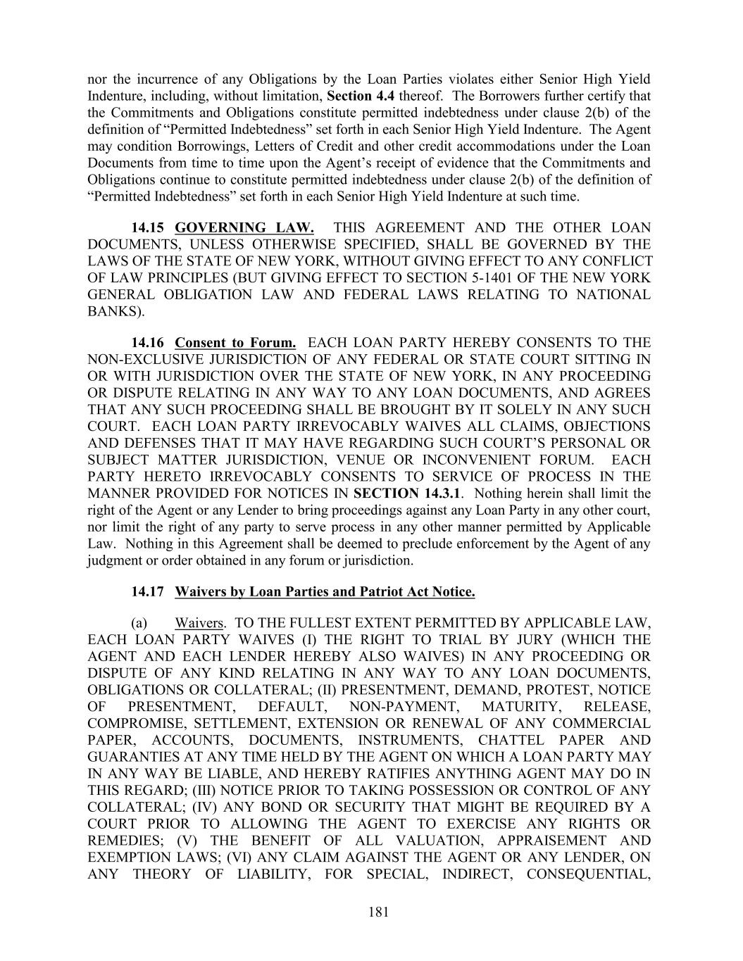 nor the incurrence of any Obligations by the Loan Parties violates either Senior High Yield Indenture, including, without limitation, Section 4.4 thereof. The Borrowers further certify that the Commitments and Obligations constitute permitted indebtedness under clause 2(b) of the definition of “Permitted Indebtedness” set forth in each Senior High Yield Indenture. The Agent may condition Borrowings, Letters of Credit and other credit accommodations under the Loan Documents from time to time upon the Agent’s receipt of evidence that the Commitments and Obligations continue to constitute permitted indebtedness under clause 2(b) of the definition of “Permitted Indebtedness” set forth in each Senior High Yield Indenture at such time. 14.15 GOVERNING LAW. THIS AGREEMENT AND THE OTHER LOAN DOCUMENTS, UNLESS OTHERWISE SPECIFIED, SHALL BE GOVERNED BY THE LAWS OF THE STATE OF NEW YORK, WITHOUT GIVING EFFECT TO ANY CONFLICT OF LAW PRINCIPLES (BUT GIVING EFFECT TO SECTION 5-1401 OF THE NEW YORK GENERAL OBLIGATION LAW AND FEDERAL LAWS RELATING TO NATIONAL BANKS). 14.16 Consent to Forum. EACH LOAN PARTY HEREBY CONSENTS TO THE NON-EXCLUSIVE JURISDICTION OF ANY FEDERAL OR STATE COURT SITTING IN OR WITH JURISDICTION OVER THE STATE OF NEW YORK, IN ANY PROCEEDING OR DISPUTE RELATING IN ANY WAY TO ANY LOAN DOCUMENTS, AND AGREES THAT ANY SUCH PROCEEDING SHALL BE BROUGHT BY IT SOLELY IN ANY SUCH COURT. EACH LOAN PARTY IRREVOCABLY WAIVES ALL CLAIMS, OBJECTIONS AND DEFENSES THAT IT MAY HAVE REGARDING SUCH COURT’S PERSONAL OR SUBJECT MATTER JURISDICTION, VENUE OR INCONVENIENT FORUM. EACH PARTY HERETO IRREVOCABLY CONSENTS TO SERVICE OF PROCESS IN THE MANNER PROVIDED FOR NOTICES IN SECTION 14.3.1. Nothing herein shall limit the right of the Agent or any Lender to bring proceedings against any Loan Party in any other court, nor limit the right of any party to serve process in any other manner permitted by Applicable Law. Nothing in this Agreement shall be deemed to preclude enforcement by the Agent of any judgment or order obtained in any forum or jurisdiction. 14.17 Waivers by Loan Parties and Patriot Act Notice. (a) Waivers. TO THE FULLEST EXTENT PERMITTED BY APPLICABLE LAW, EACH LOAN PARTY WAIVES (I) THE RIGHT TO TRIAL BY JURY (WHICH THE AGENT AND EACH LENDER HEREBY ALSO WAIVES) IN ANY PROCEEDING OR DISPUTE OF ANY KIND RELATING IN ANY WAY TO ANY LOAN DOCUMENTS, OBLIGATIONS OR COLLATERAL; (II) PRESENTMENT, DEMAND, PROTEST, NOTICE OF PRESENTMENT, DEFAULT, NON-PAYMENT, MATURITY, RELEASE, COMPROMISE, SETTLEMENT, EXTENSION OR RENEWAL OF ANY COMMERCIAL PAPER, ACCOUNTS, DOCUMENTS, INSTRUMENTS, CHATTEL PAPER AND GUARANTIES AT ANY TIME HELD BY THE AGENT ON WHICH A LOAN PARTY MAY IN ANY WAY BE LIABLE, AND HEREBY RATIFIES ANYTHING AGENT MAY DO IN THIS REGARD; (III) NOTICE PRIOR TO TAKING POSSESSION OR CONTROL OF ANY COLLATERAL; (IV) ANY BOND OR SECURITY THAT MIGHT BE REQUIRED BY A COURT PRIOR TO ALLOWING THE AGENT TO EXERCISE ANY RIGHTS OR REMEDIES; (V) THE BENEFIT OF ALL VALUATION, APPRAISEMENT AND EXEMPTION LAWS; (VI) ANY CLAIM AGAINST THE AGENT OR ANY LENDER, ON ANY THEORY OF LIABILITY, FOR SPECIAL, INDIRECT, CONSEQUENTIAL, 181