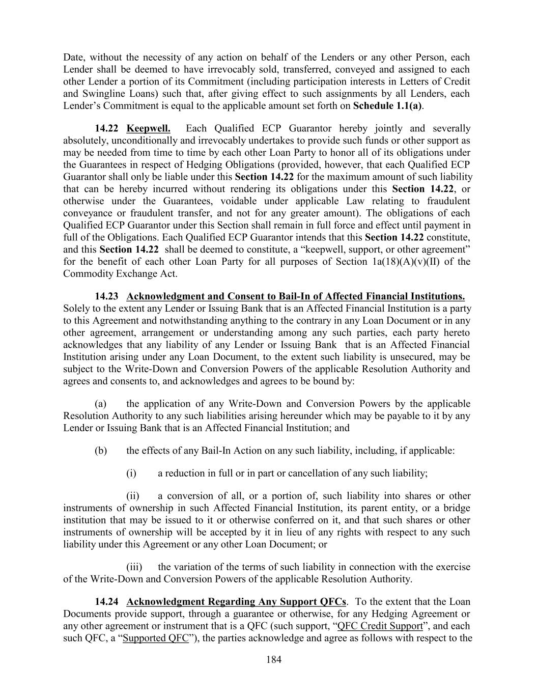 Date, without the necessity of any action on behalf of the Lenders or any other Person, each Lender shall be deemed to have irrevocably sold, transferred, conveyed and assigned to each other Lender a portion of its Commitment (including participation interests in Letters of Credit and Swingline Loans) such that, after giving effect to such assignments by all Lenders, each Lender’s Commitment is equal to the applicable amount set forth on Schedule 1.1(a). 14.22 Keepwell. Each Qualified ECP Guarantor hereby jointly and severally absolutely, unconditionally and irrevocably undertakes to provide such funds or other support as may be needed from time to time by each other Loan Party to honor all of its obligations under the Guarantees in respect of Hedging Obligations (provided, however, that each Qualified ECP Guarantor shall only be liable under this Section 14.22 for the maximum amount of such liability that can be hereby incurred without rendering its obligations under this Section 14.22, or otherwise under the Guarantees, voidable under applicable Law relating to fraudulent conveyance or fraudulent transfer, and not for any greater amount). The obligations of each Qualified ECP Guarantor under this Section shall remain in full force and effect until payment in full of the Obligations. Each Qualified ECP Guarantor intends that this Section 14.22 constitute, and this Section 14.22 shall be deemed to constitute, a “keepwell, support, or other agreement” for the benefit of each other Loan Party for all purposes of Section 1a(18)(A)(v)(II) of the Commodity Exchange Act. 14.23 Acknowledgment and Consent to Bail-In of Affected Financial Institutions. Solely to the extent any Lender or Issuing Bank that is an Affected Financial Institution is a party to this Agreement and notwithstanding anything to the contrary in any Loan Document or in any other agreement, arrangement or understanding among any such parties, each party hereto acknowledges that any liability of any Lender or Issuing Bank that is an Affected Financial Institution arising under any Loan Document, to the extent such liability is unsecured, may be subject to the Write-Down and Conversion Powers of the applicable Resolution Authority and agrees and consents to, and acknowledges and agrees to be bound by: (a) the application of any Write-Down and Conversion Powers by the applicable Resolution Authority to any such liabilities arising hereunder which may be payable to it by any Lender or Issuing Bank that is an Affected Financial Institution; and (b) the effects of any Bail-In Action on any such liability, including, if applicable: (i) a reduction in full or in part or cancellation of any such liability; (ii) a conversion of all, or a portion of, such liability into shares or other instruments of ownership in such Affected Financial Institution, its parent entity, or a bridge institution that may be issued to it or otherwise conferred on it, and that such shares or other instruments of ownership will be accepted by it in lieu of any rights with respect to any such liability under this Agreement or any other Loan Document; or (iii) the variation of the terms of such liability in connection with the exercise of the Write-Down and Conversion Powers of the applicable Resolution Authority. 14.24 Acknowledgment Regarding Any Support QFCs. To the extent that the Loan Documents provide support, through a guarantee or otherwise, for any Hedging Agreement or any other agreement or instrument that is a QFC (such support, “QFC Credit Support”, and each such QFC, a “Supported QFC”), the parties acknowledge and agree as follows with respect to the 184