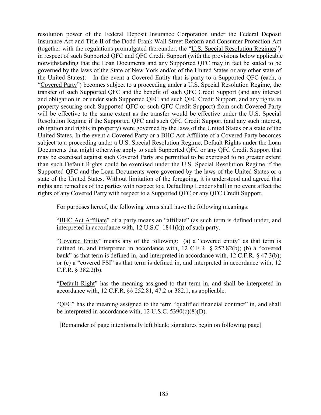 resolution power of the Federal Deposit Insurance Corporation under the Federal Deposit Insurance Act and Title II of the Dodd-Frank Wall Street Reform and Consumer Protection Act (together with the regulations promulgated thereunder, the “U.S. Special Resolution Regimes”) in respect of such Supported QFC and QFC Credit Support (with the provisions below applicable notwithstanding that the Loan Documents and any Supported QFC may in fact be stated to be governed by the laws of the State of New York and/or of the United States or any other state of the United States): In the event a Covered Entity that is party to a Supported QFC (each, a “Covered Party”) becomes subject to a proceeding under a U.S. Special Resolution Regime, the transfer of such Supported QFC and the benefit of such QFC Credit Support (and any interest and obligation in or under such Supported QFC and such QFC Credit Support, and any rights in property securing such Supported QFC or such QFC Credit Support) from such Covered Party will be effective to the same extent as the transfer would be effective under the U.S. Special Resolution Regime if the Supported QFC and such QFC Credit Support (and any such interest, obligation and rights in property) were governed by the laws of the United States or a state of the United States. In the event a Covered Party or a BHC Act Affiliate of a Covered Party becomes subject to a proceeding under a U.S. Special Resolution Regime, Default Rights under the Loan Documents that might otherwise apply to such Supported QFC or any QFC Credit Support that may be exercised against such Covered Party are permitted to be exercised to no greater extent than such Default Rights could be exercised under the U.S. Special Resolution Regime if the Supported QFC and the Loan Documents were governed by the laws of the United States or a state of the United States. Without limitation of the foregoing, it is understood and agreed that rights and remedies of the parties with respect to a Defaulting Lender shall in no event affect the rights of any Covered Party with respect to a Supported QFC or any QFC Credit Support. For purposes hereof, the following terms shall have the following meanings: “BHC Act Affiliate” of a party means an “affiliate” (as such term is defined under, and interpreted in accordance with, 12 U.S.C. 1841(k)) of such party. “Covered Entity” means any of the following: (a) a “covered entity” as that term is defined in, and interpreted in accordance with, 12 C.F.R. § 252.82(b); (b) a “covered bank” as that term is defined in, and interpreted in accordance with, 12 C.F.R. § 47.3(b); or (c) a “covered FSI” as that term is defined in, and interpreted in accordance with, 12 C.F.R. § 382.2(b). “Default Right” has the meaning assigned to that term in, and shall be interpreted in accordance with, 12 C.F.R. §§ 252.81, 47.2 or 382.1, as applicable. “QFC” has the meaning assigned to the term “qualified financial contract” in, and shall be interpreted in accordance with, 12 U.S.C. 5390(c)(8)(D). [Remainder of page intentionally left blank; signatures begin on following page] 185