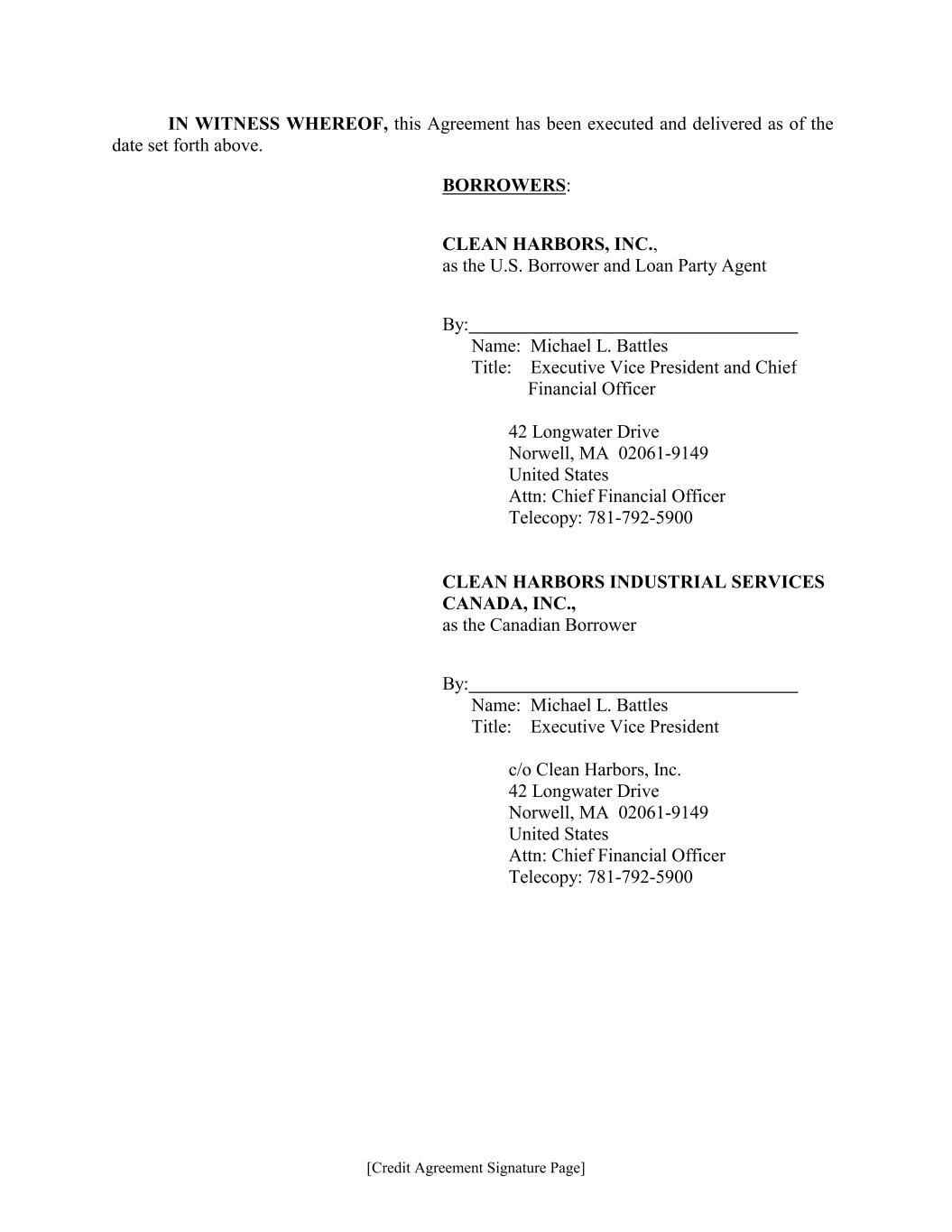 [Credit Agreement Signature Page] CLEAN HARBORS INDUSTRIAL SERVICES CANADA, INC., as the Canadian Borrower By: Name: Michael L. Battles Title: Executive Vice President BORROWERS: CLEAN HARBORS, INC., as the U.S. Borrower and Loan Party Agent By: Name: Michael L. Battles Title: Executive Vice President and Chief Financial Officer 42 Longwater Drive Norwell, MA 02061-9149 United States Attn: Chief Financial Officer Telecopy: 781-792-5900 c/o Clean Harbors, Inc. 42 Longwater Drive Norwell, MA 02061-9149 United States Attn: Chief Financial Officer Telecopy: 781-792-5900 IN WITNESS WHEREOF, this Agreement has been executed and delivered as of the date set forth above.